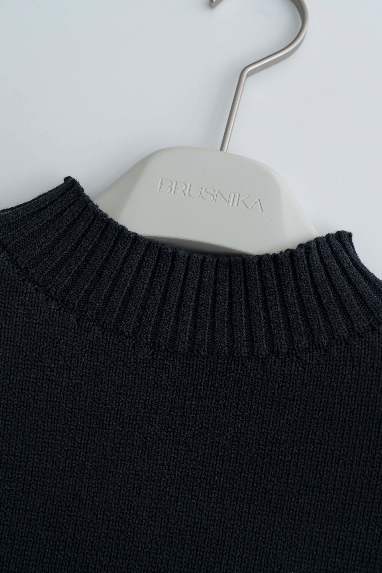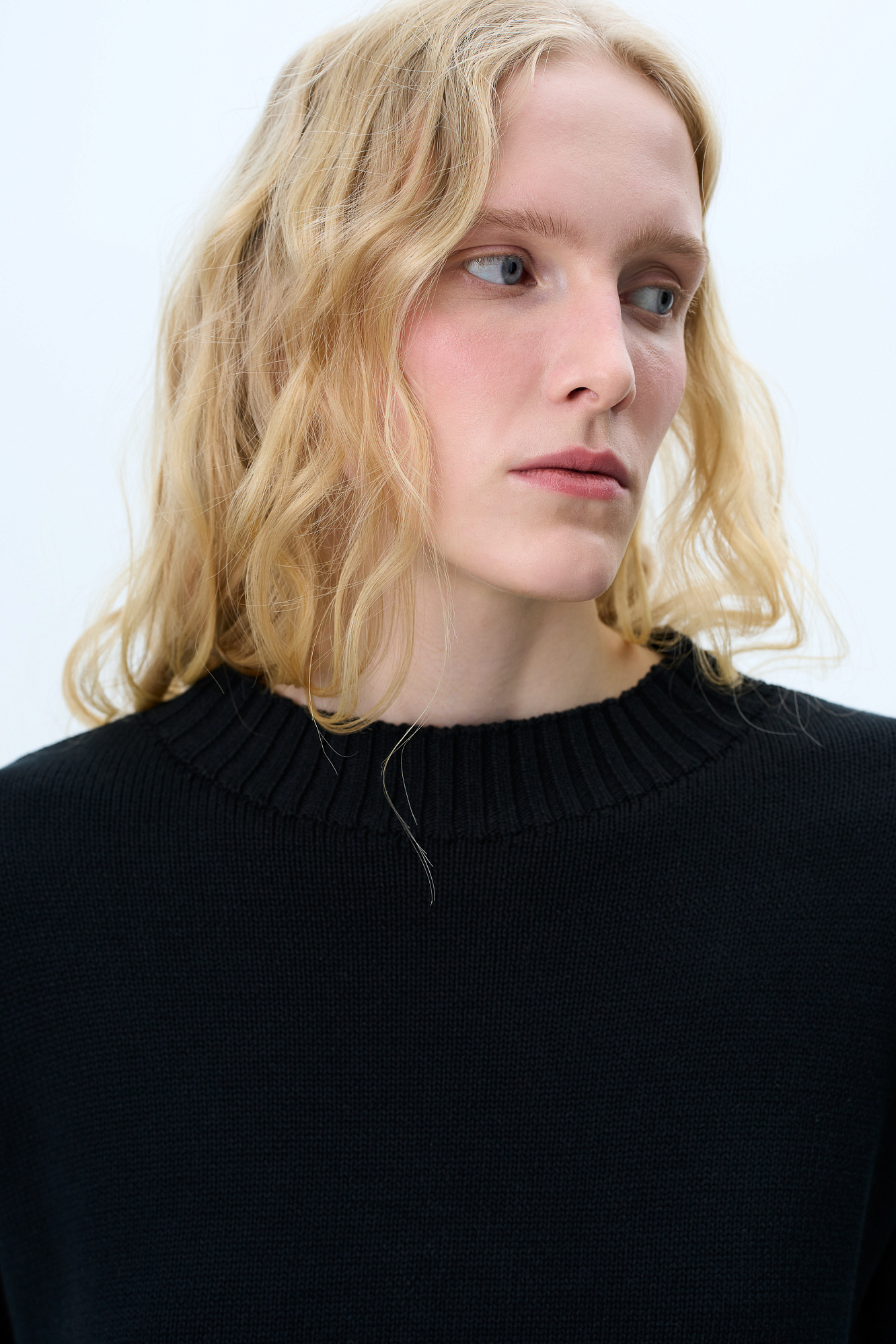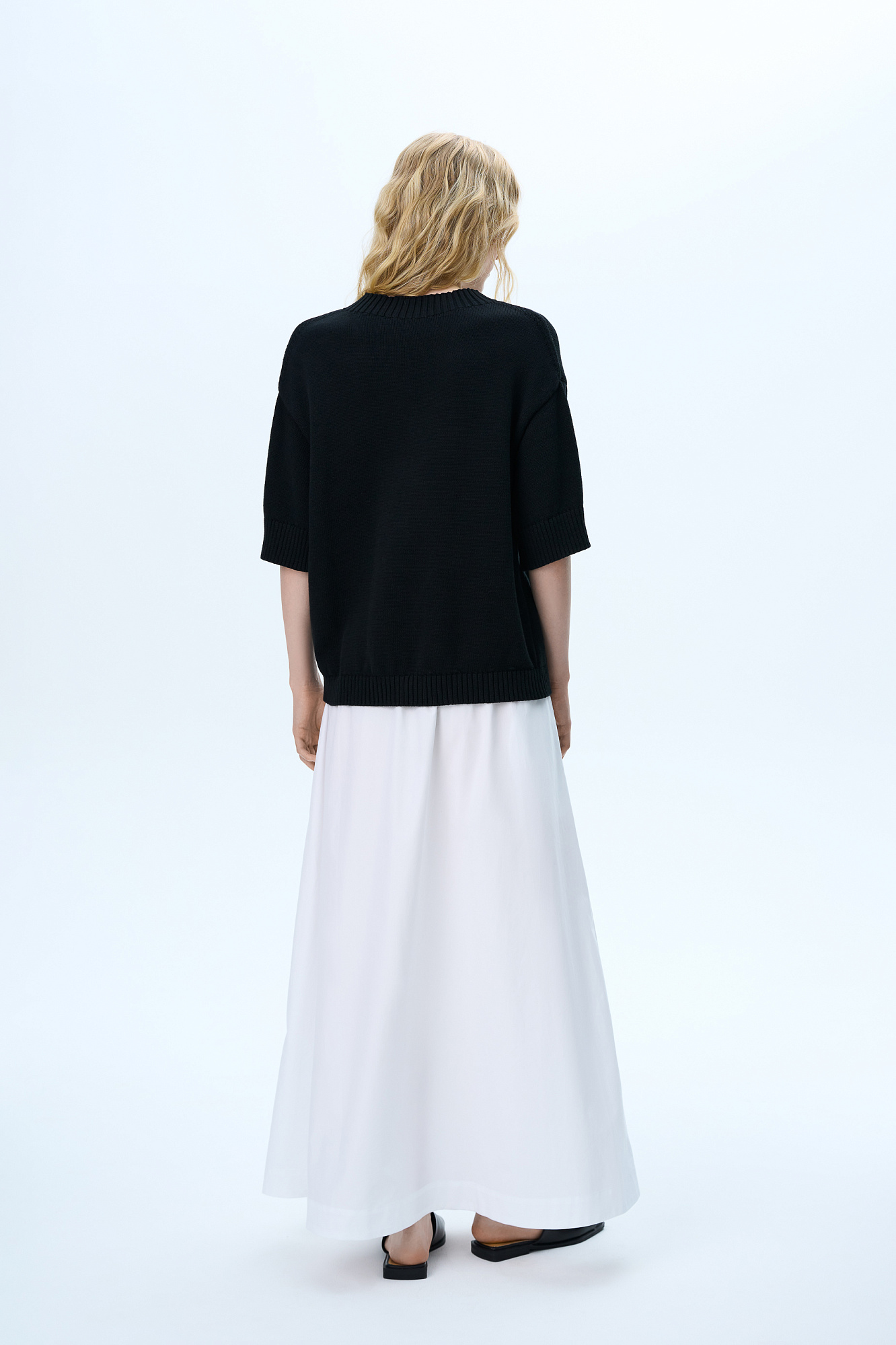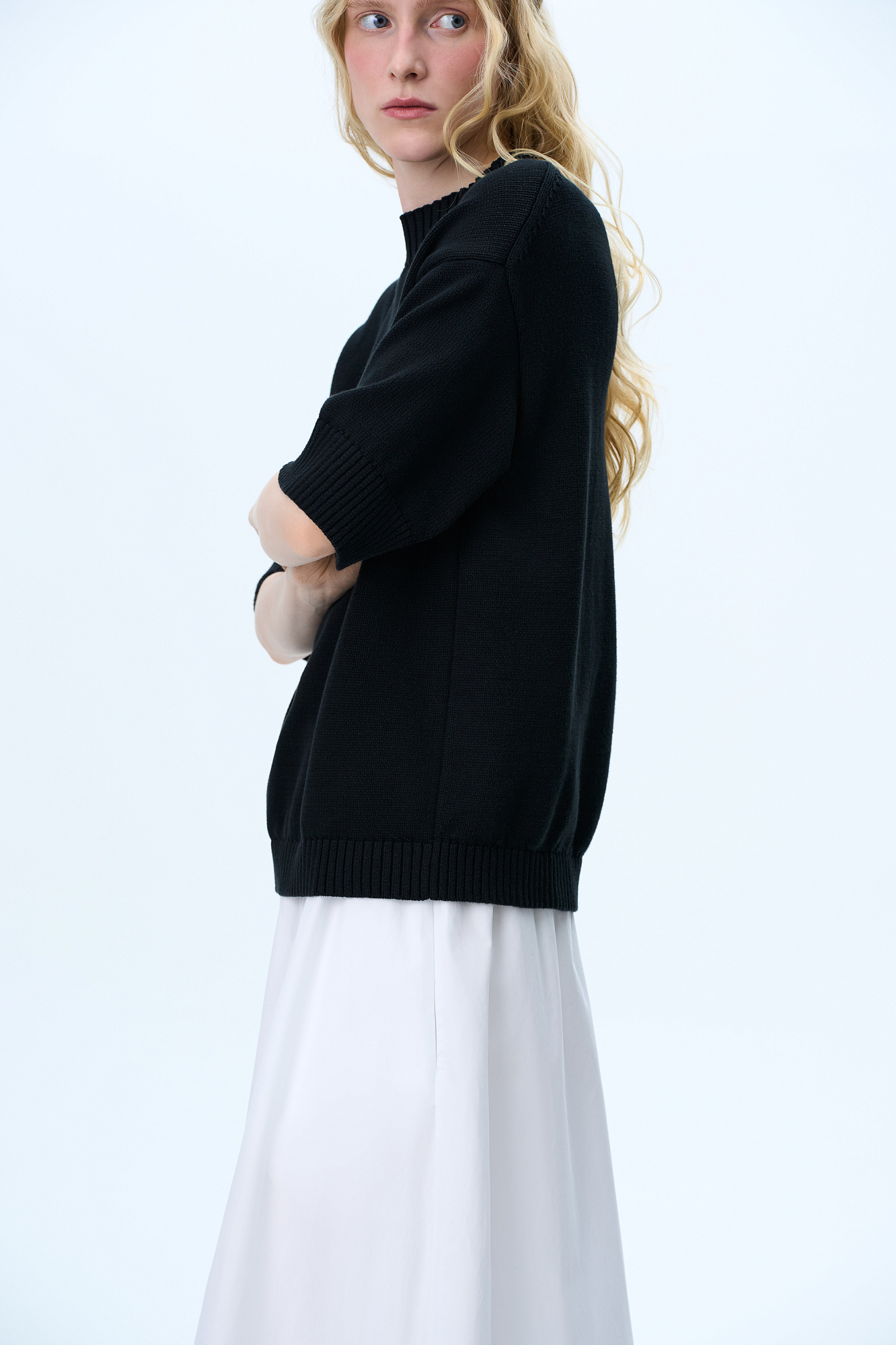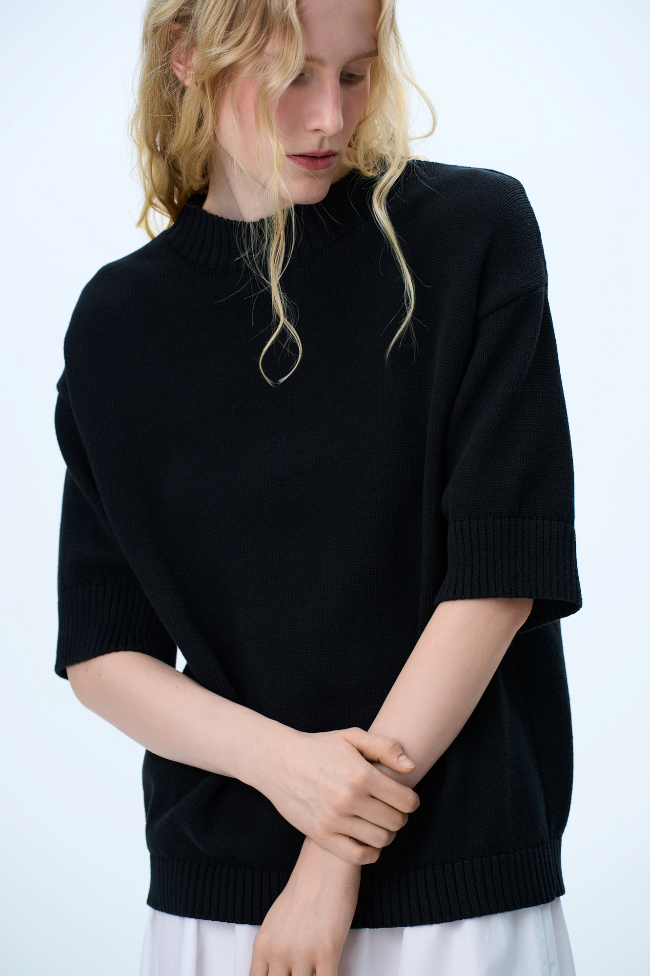 Трикотажная футболка из хлопка. Модель свободного силуэта со спущенной линией плеча, коротким рукавом и круглым вырезом горловины. Воротник, манжеты рукавов и низ изделия выполнены в широкий рубчик.