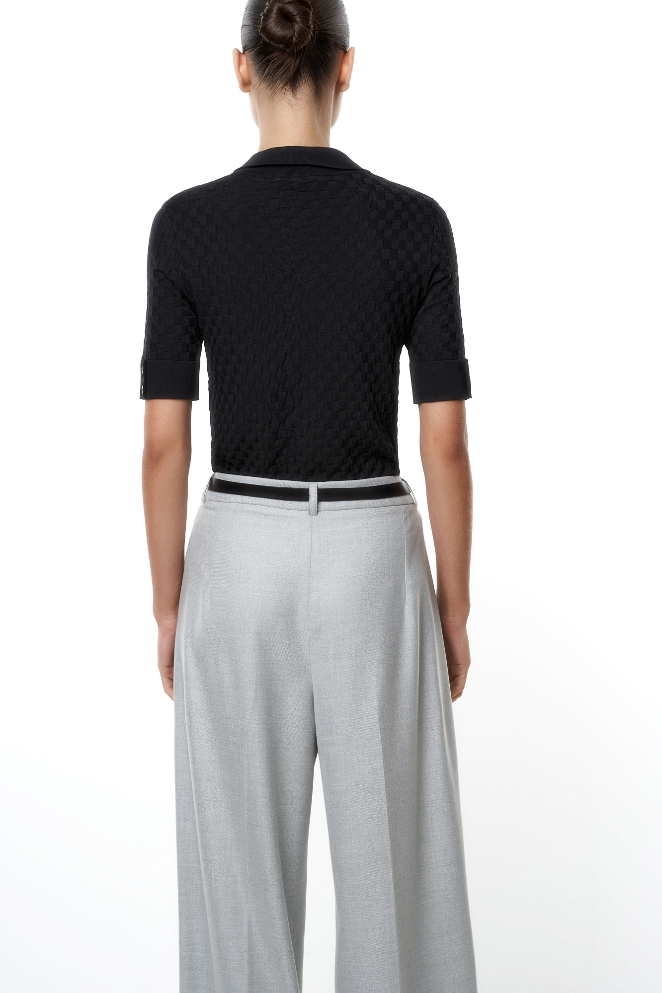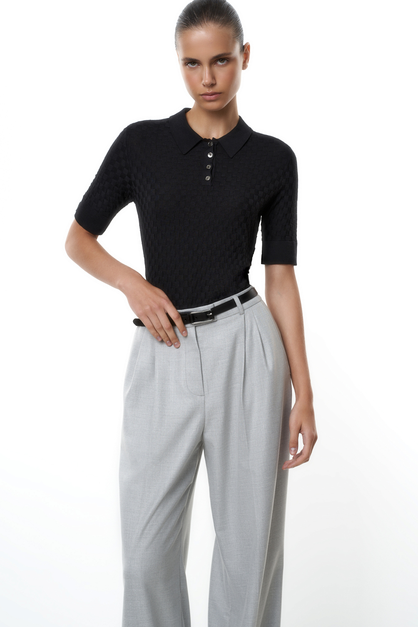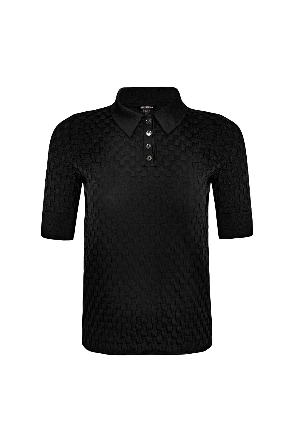 Трикотажная футболка-поло из вискозы. Модель приталенного силуэта, с короткими рукавами с манжетами, отложным воротником и застежкой на пуговицы на планке.