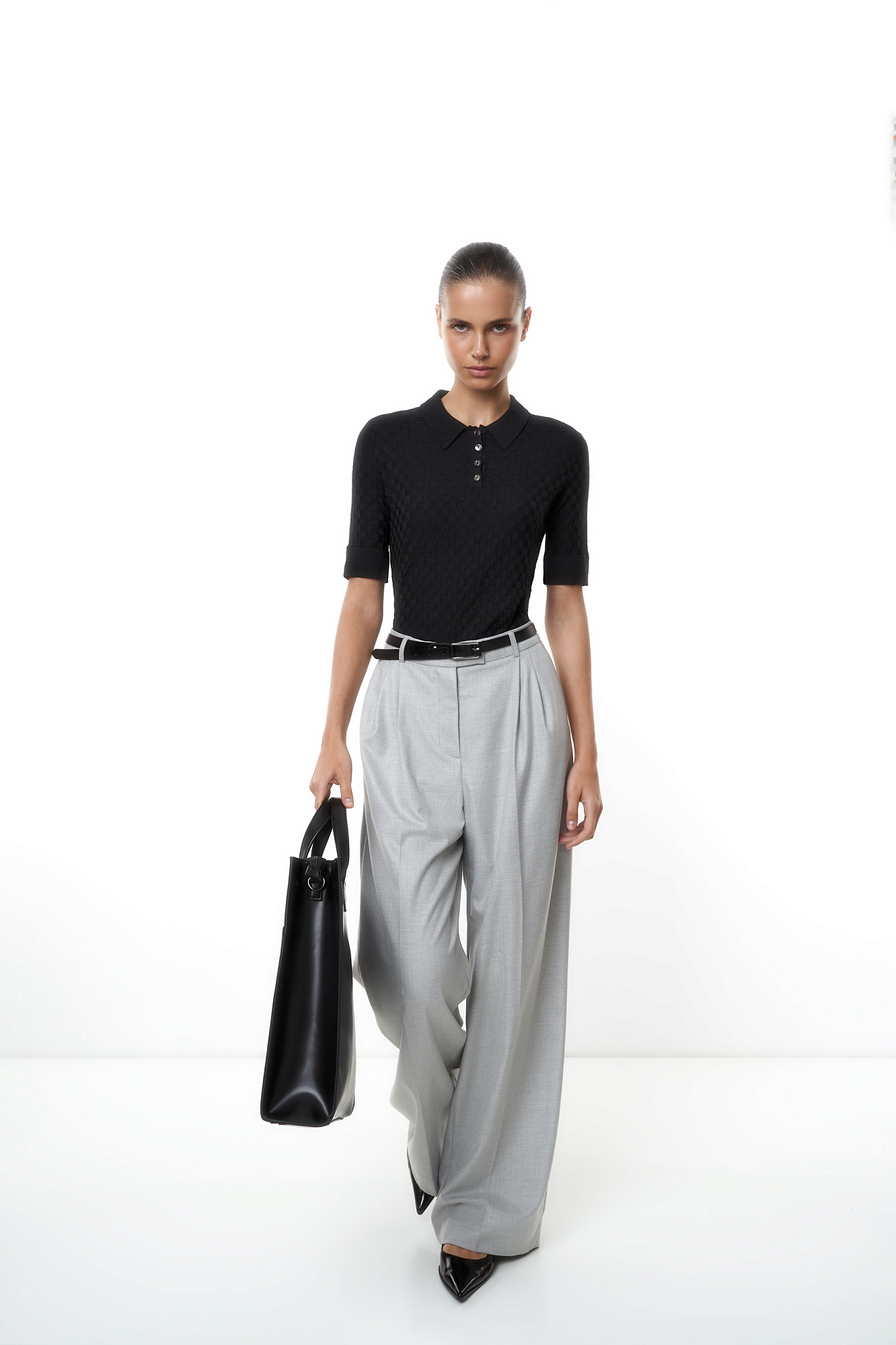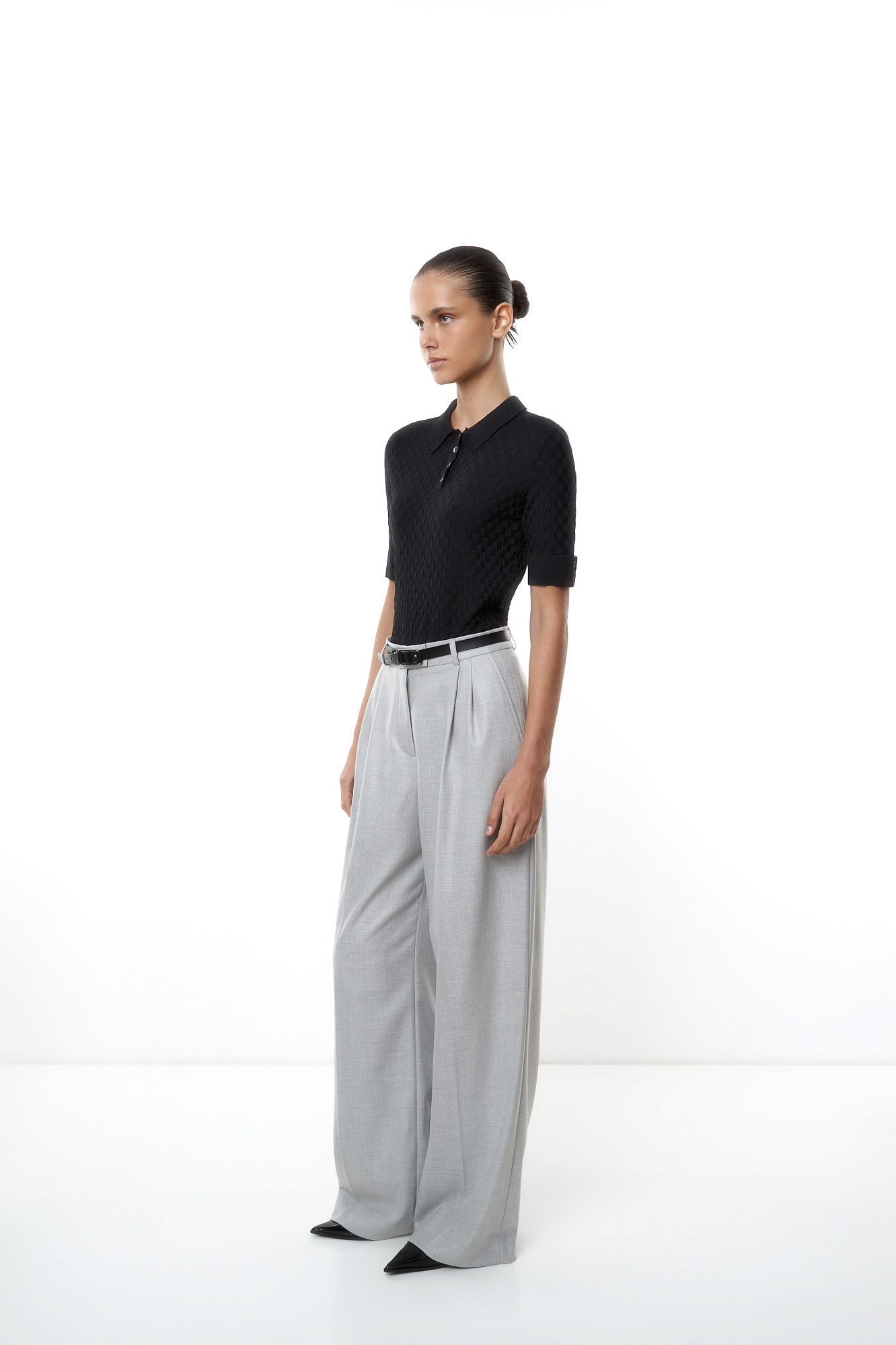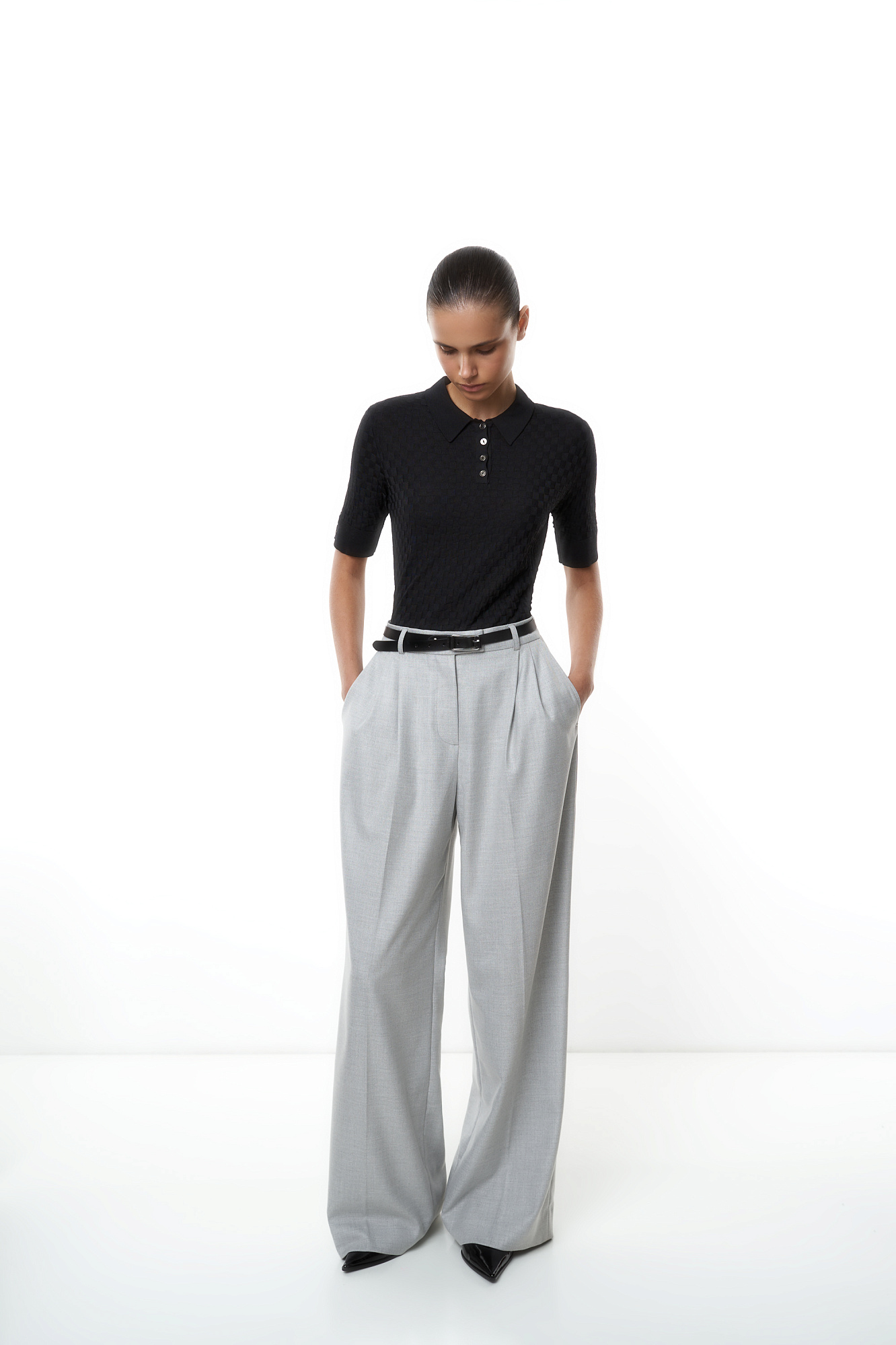 Трикотажная футболка-поло из вискозы. Модель приталенного силуэта, с короткими рукавами с манжетами, отложным воротником и застежкой на пуговицы на планке.