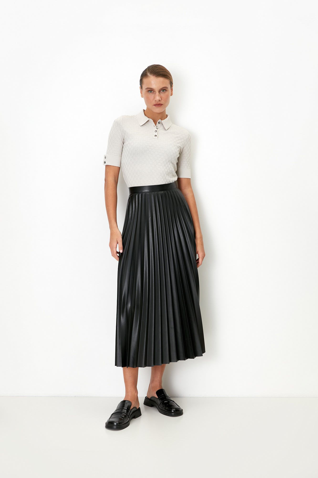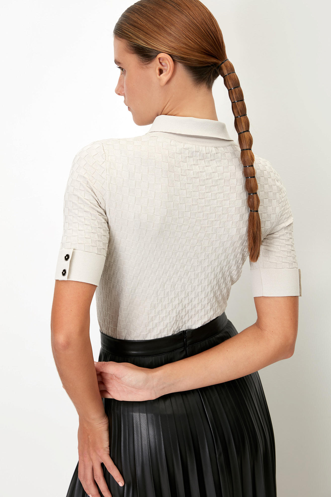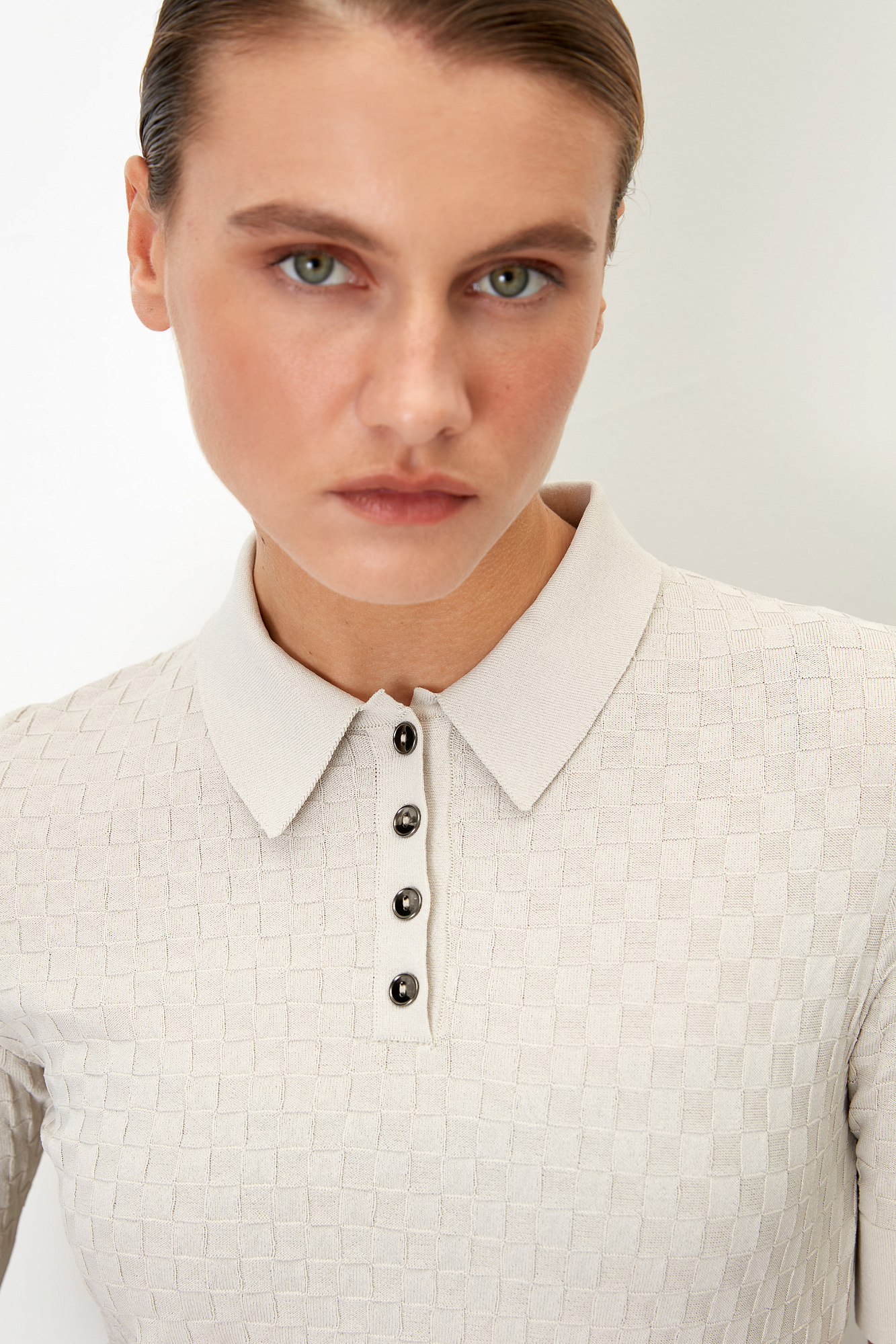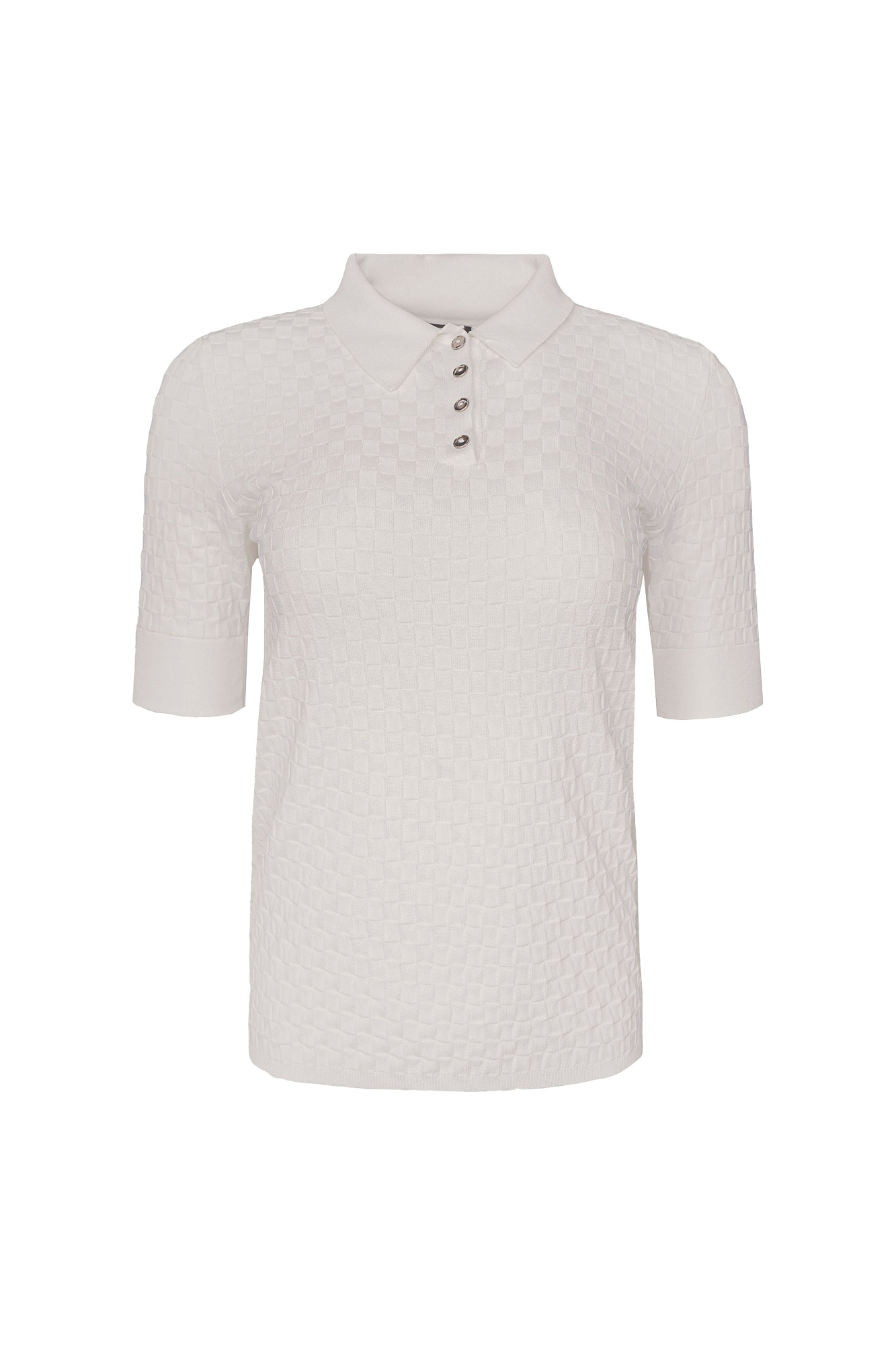 Трикотажная футболка-поло из вискозы. Модель приталенного силуэта, с короткими рукавами с манжетами, отложным воротником и застежкой на пуговицы на планке.