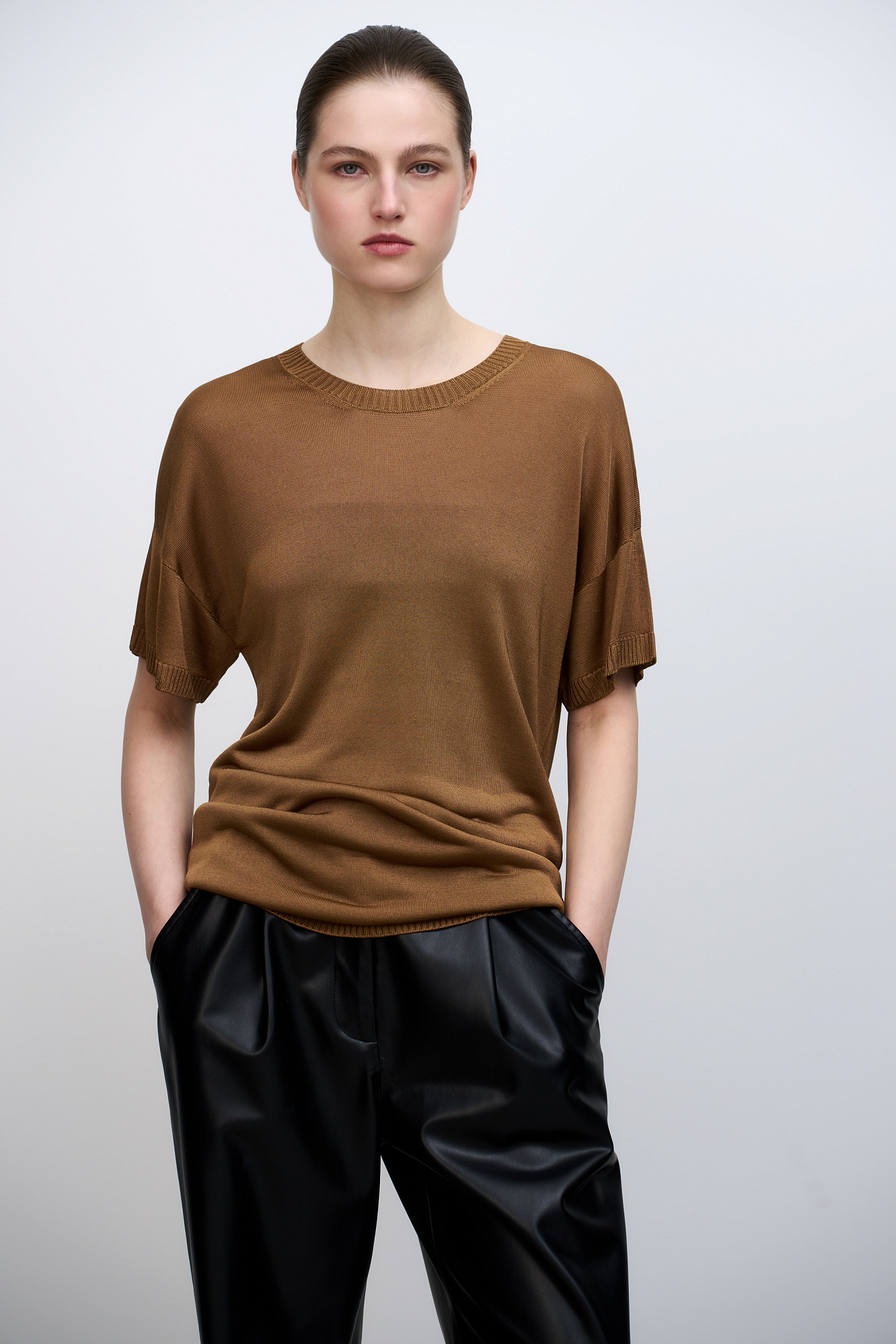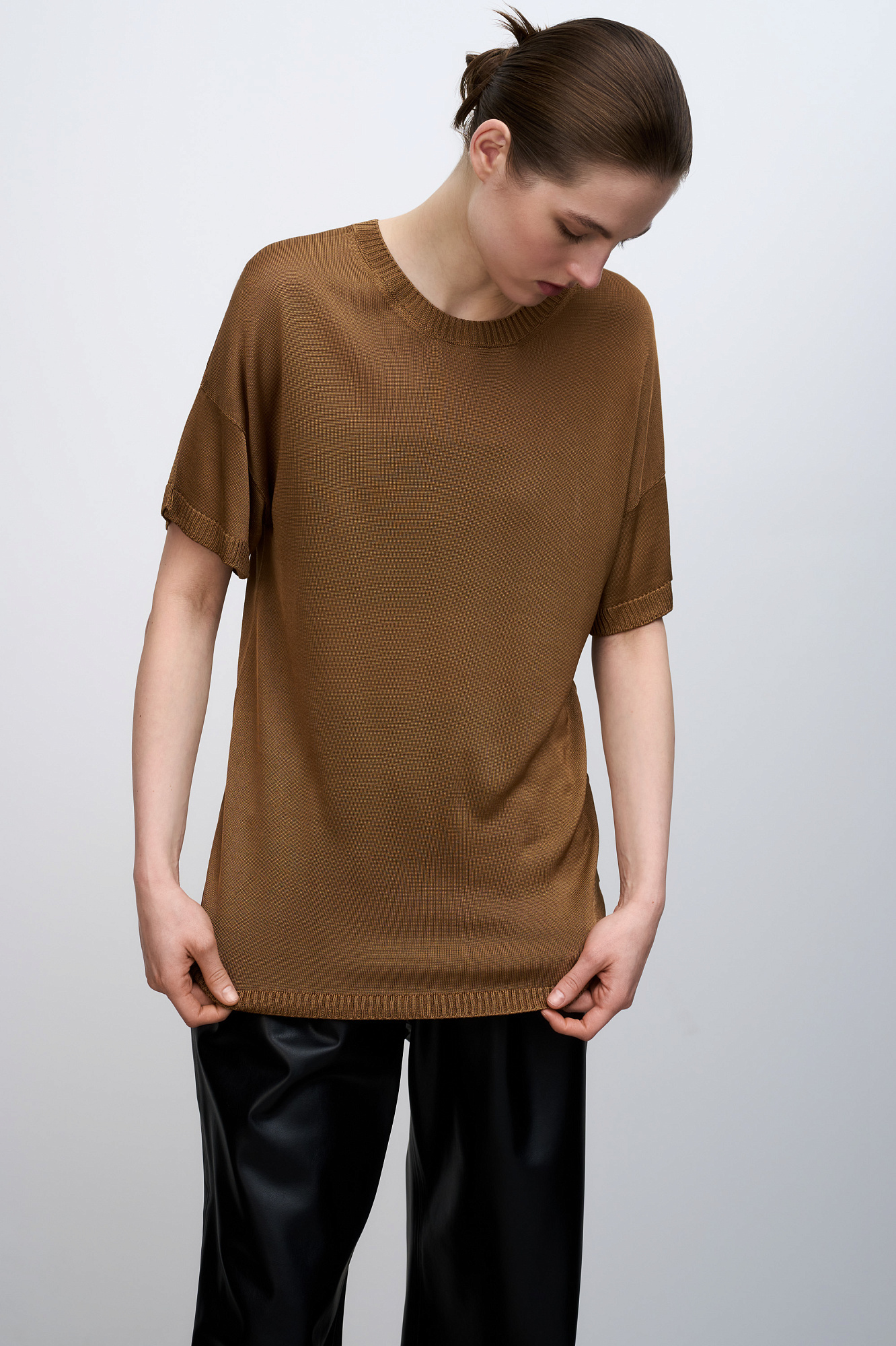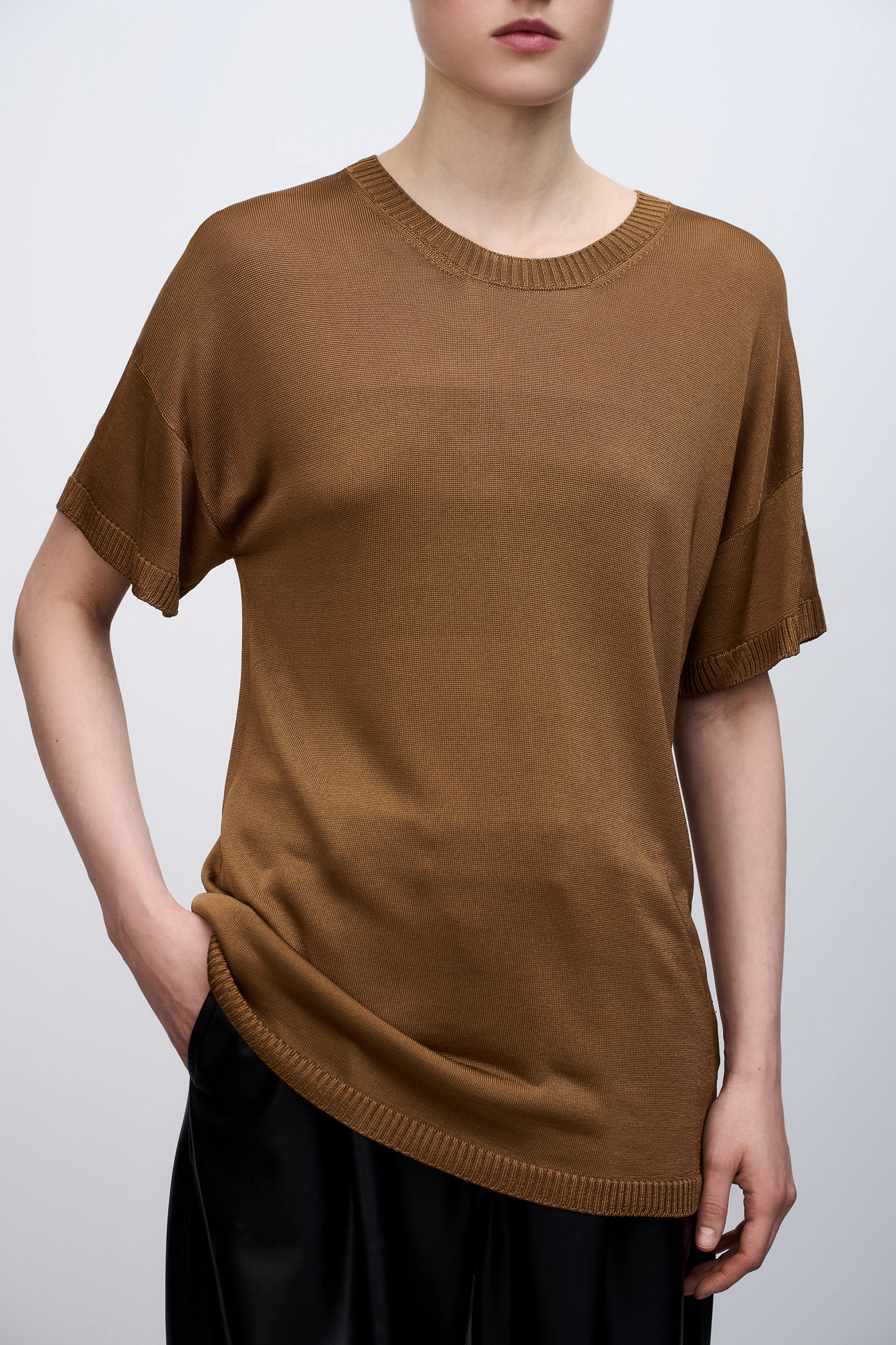 Цельновязаная футболка из 100% вискозы. Модель свободного силуэта, со спущенной линией плеча и круглым вырезом горловины. Края изделия выполнены в рубчик.