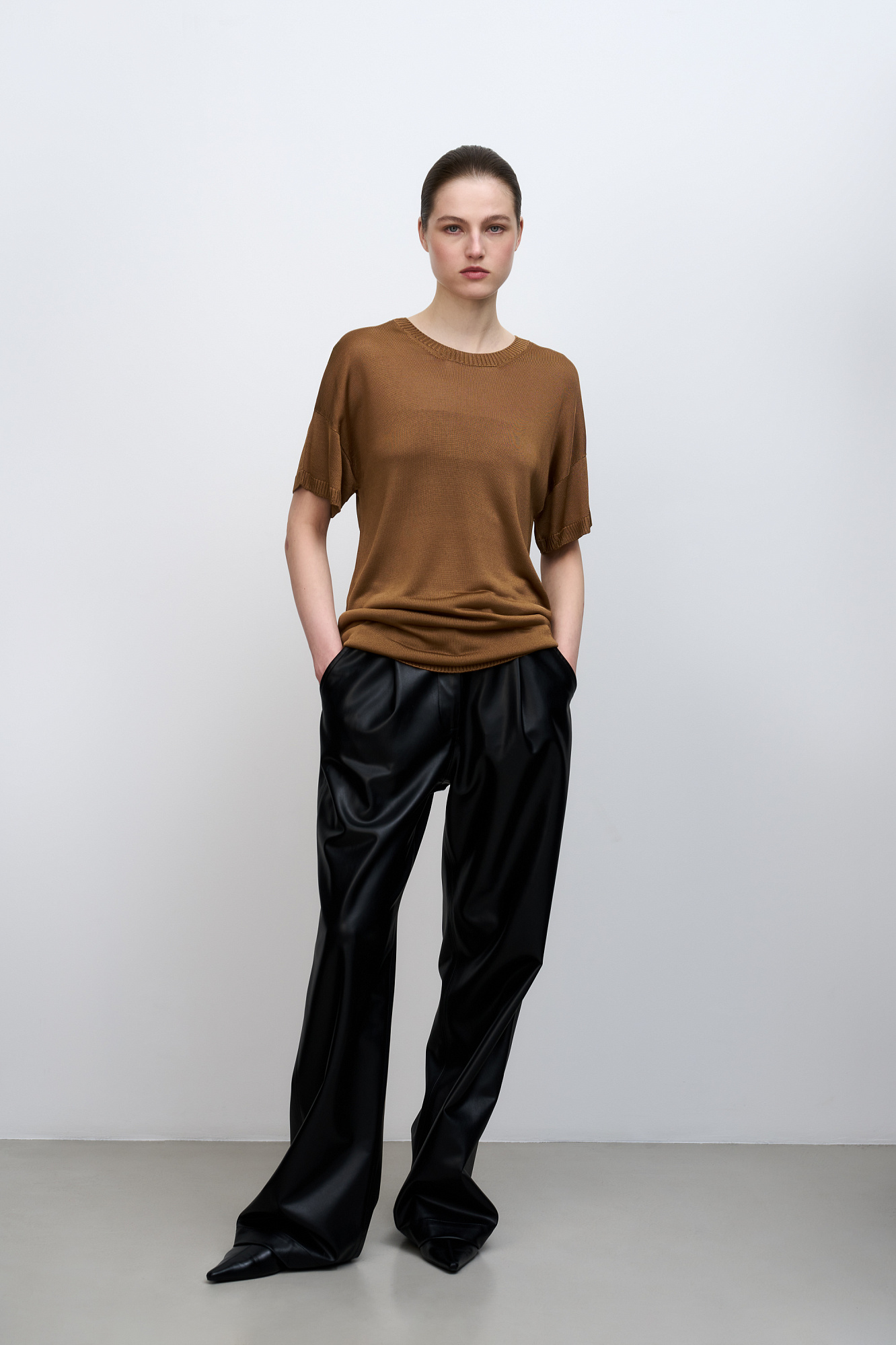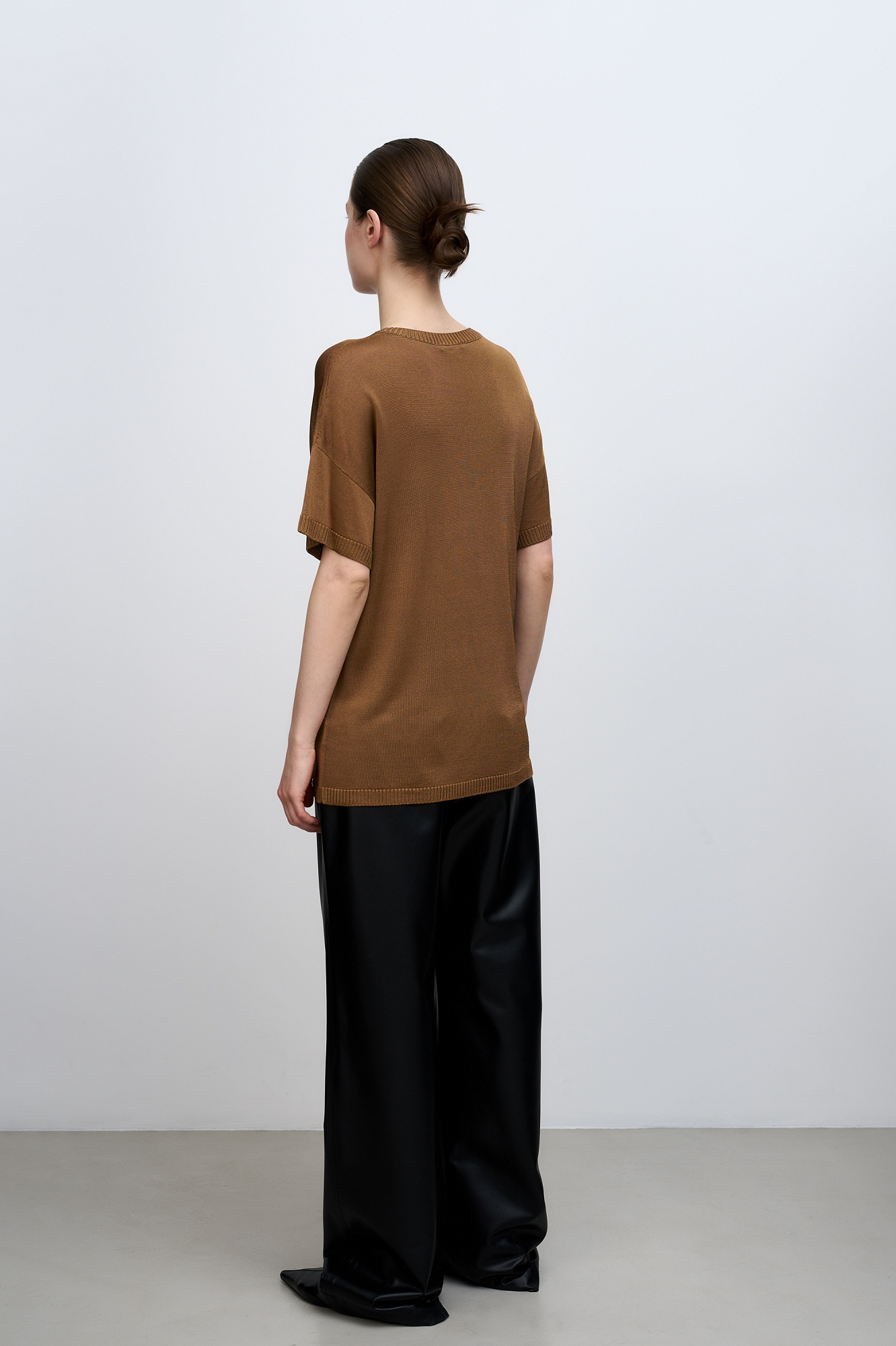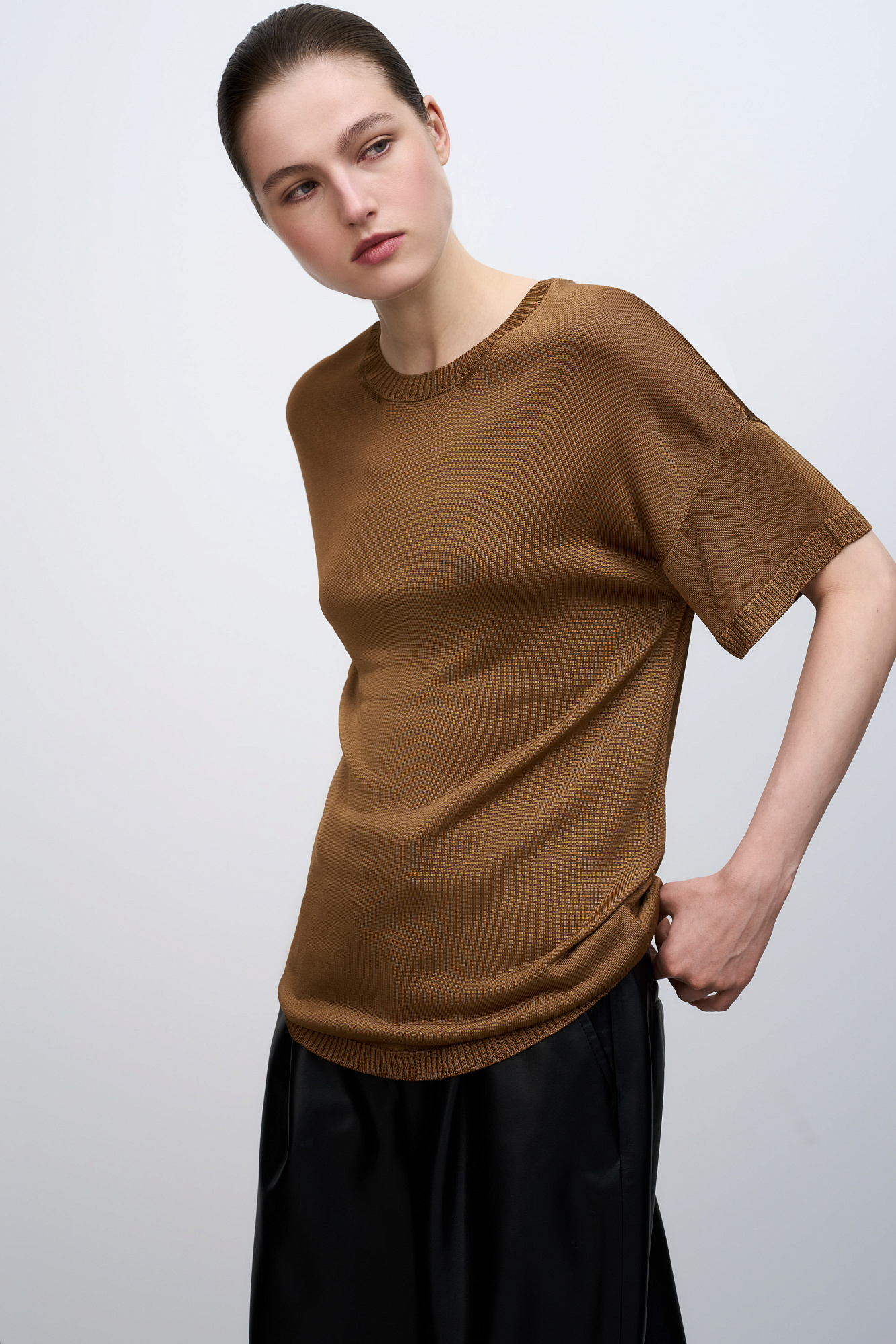 Цельновязаная футболка из 100% вискозы. Модель свободного силуэта, со спущенной линией плеча и круглым вырезом горловины. Края изделия выполнены в рубчик.