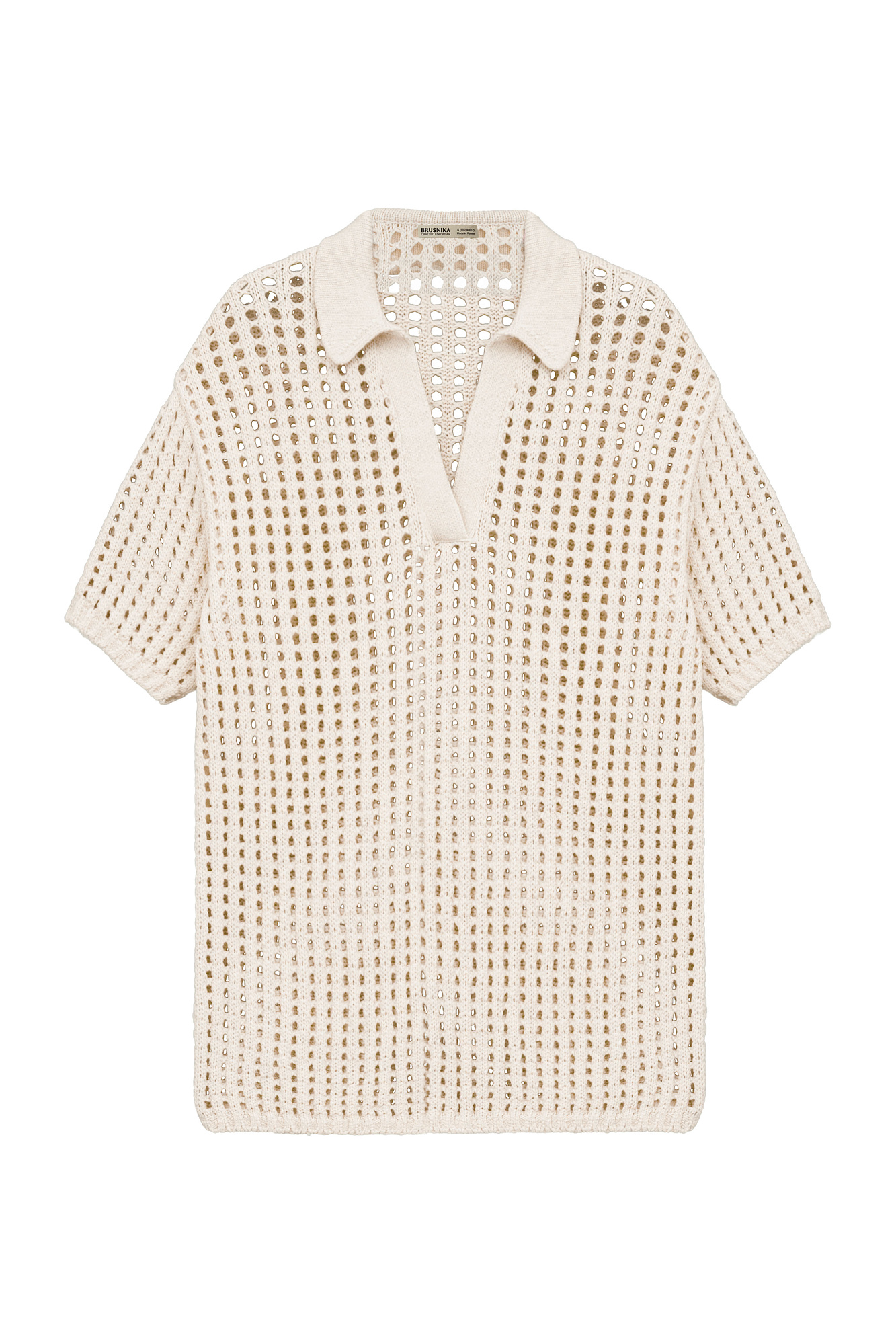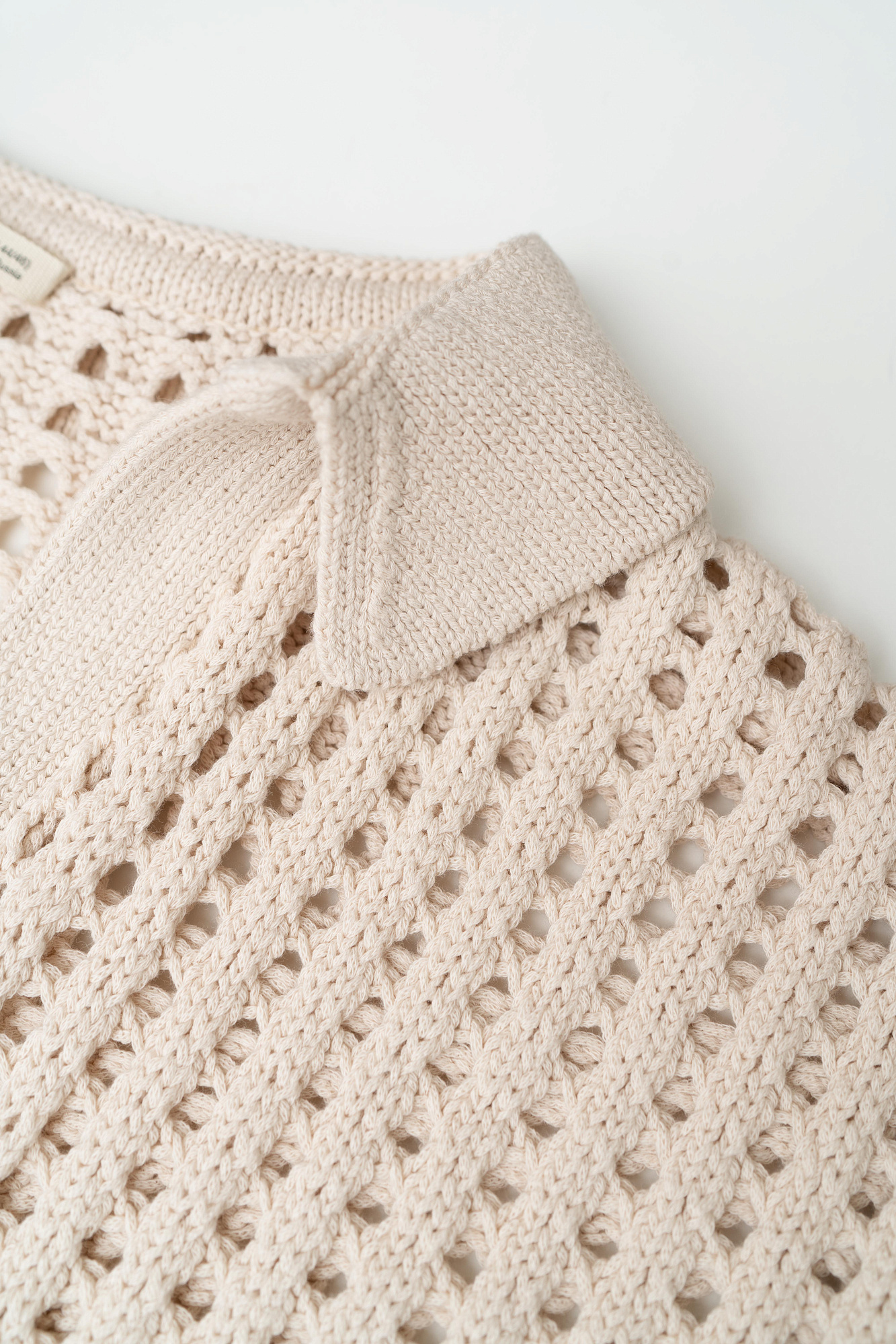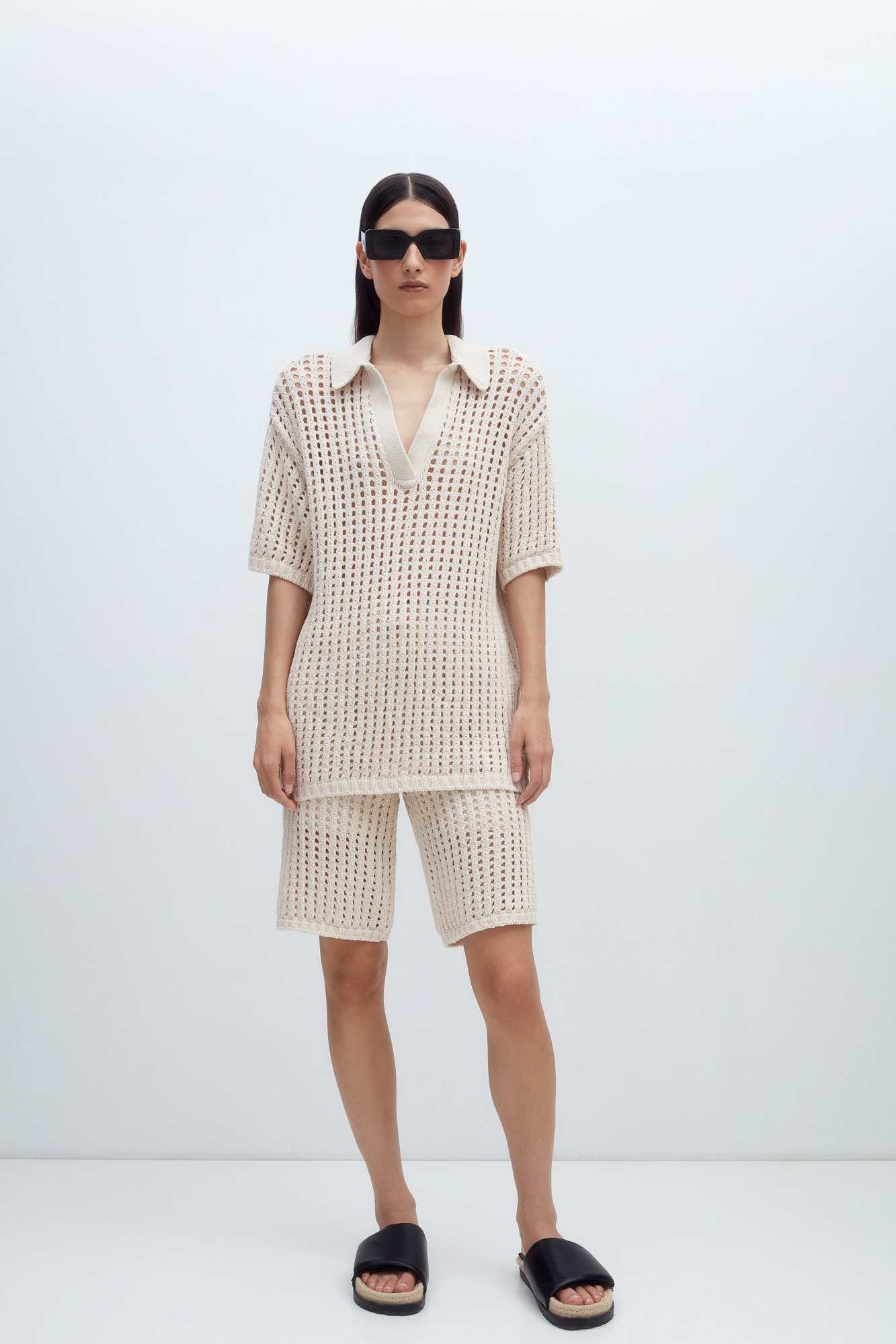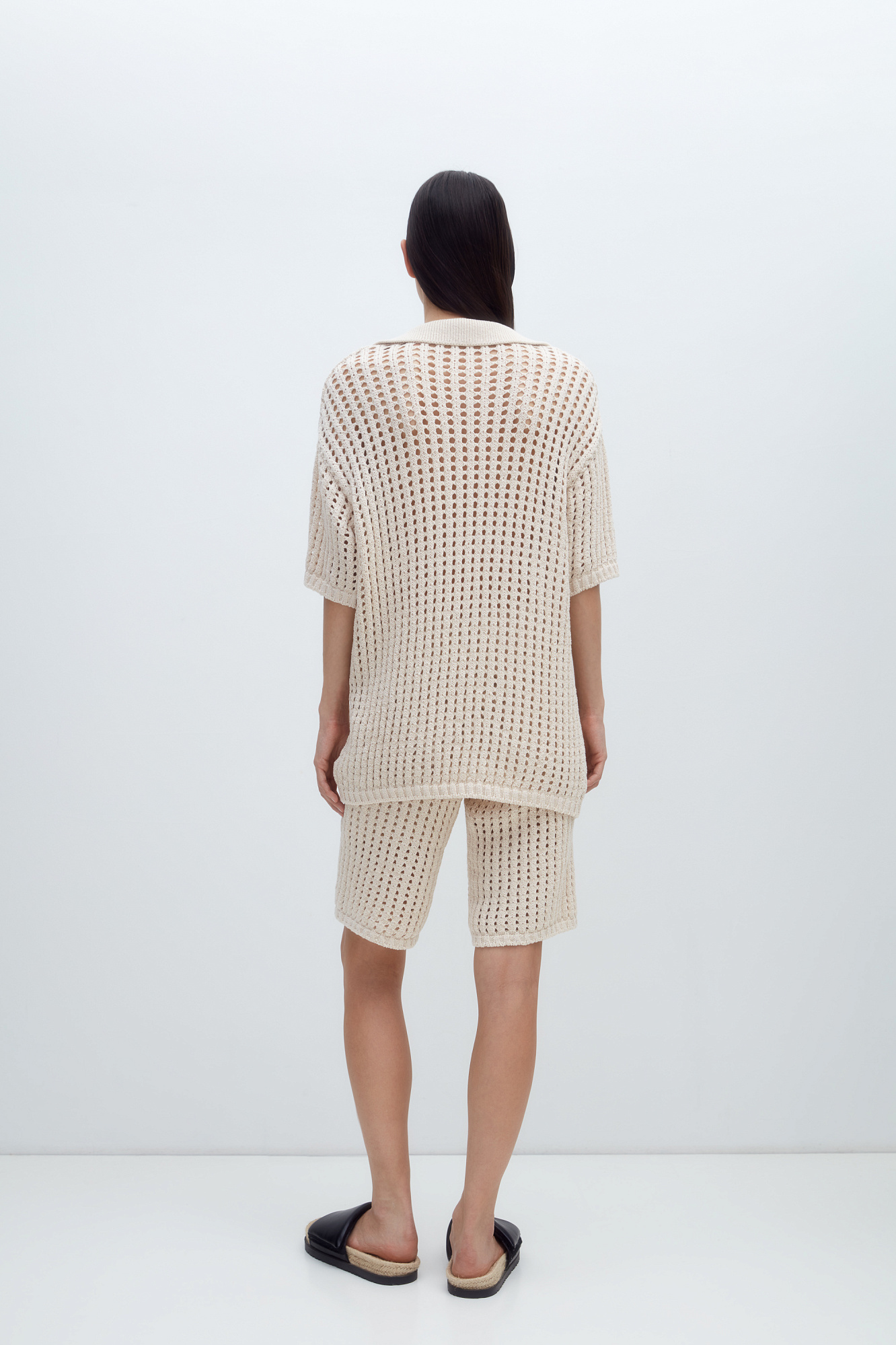 Трикотажная ажурная футболка из 100% хлопка. Модель со спущенным рукавом и воротником-поло. Дополнить образ можно шортами в таком же стиле.
