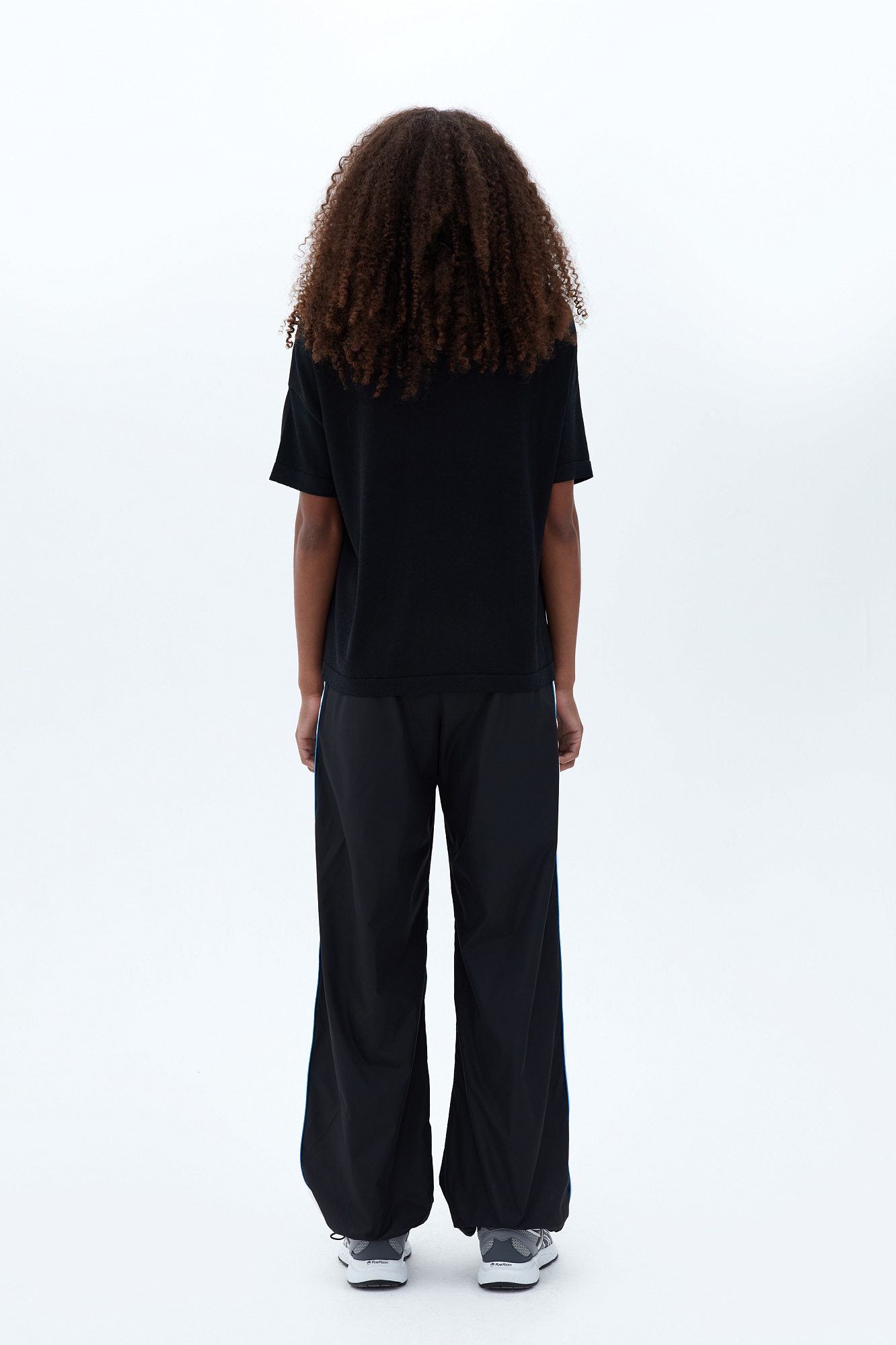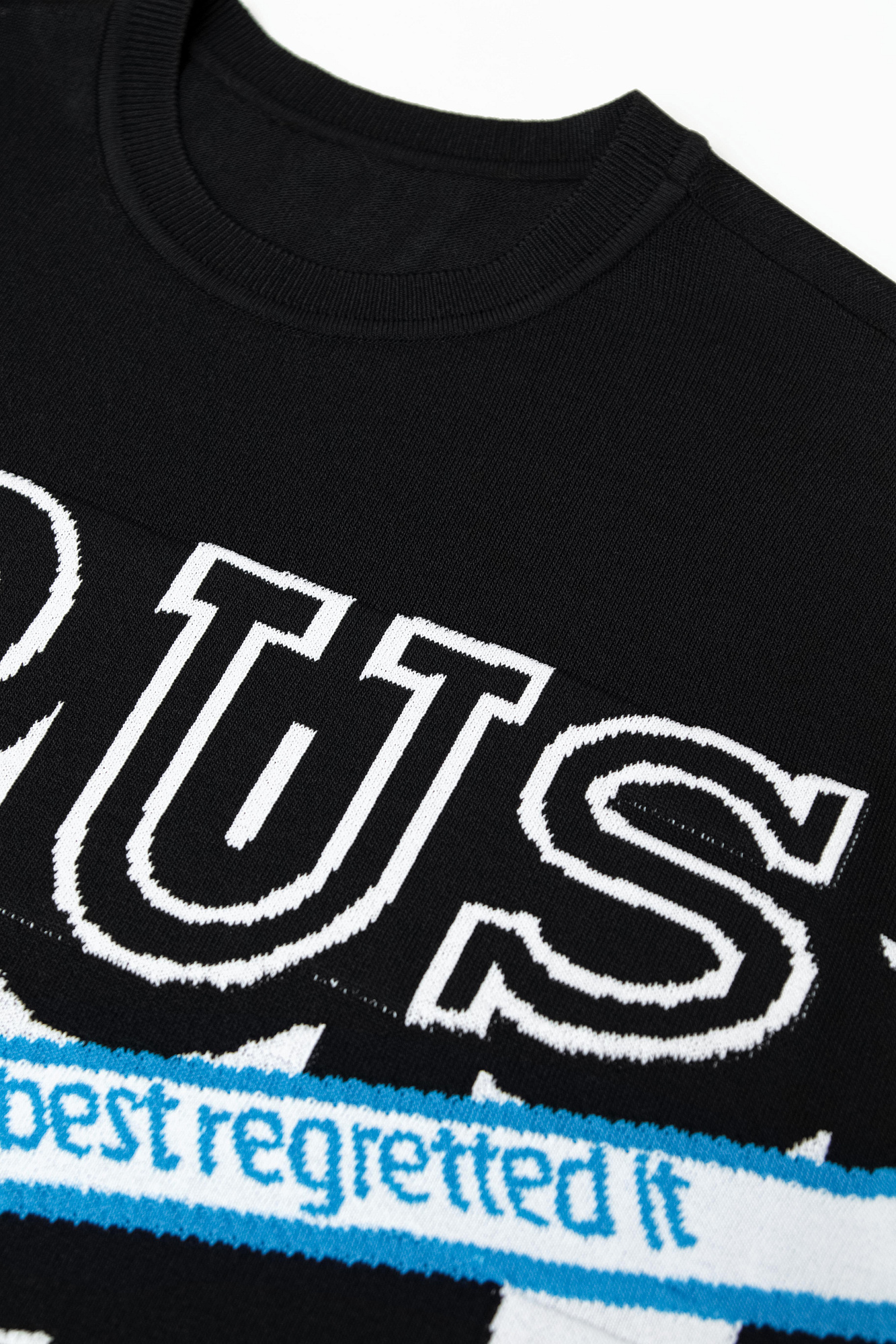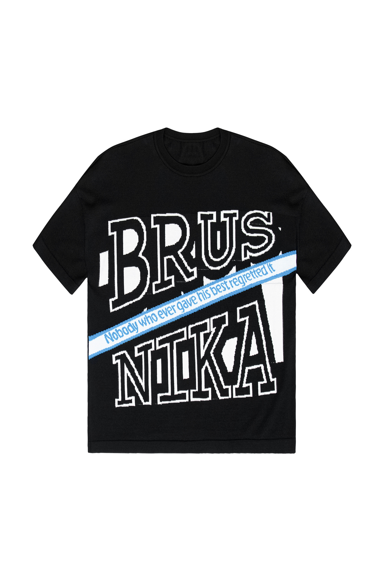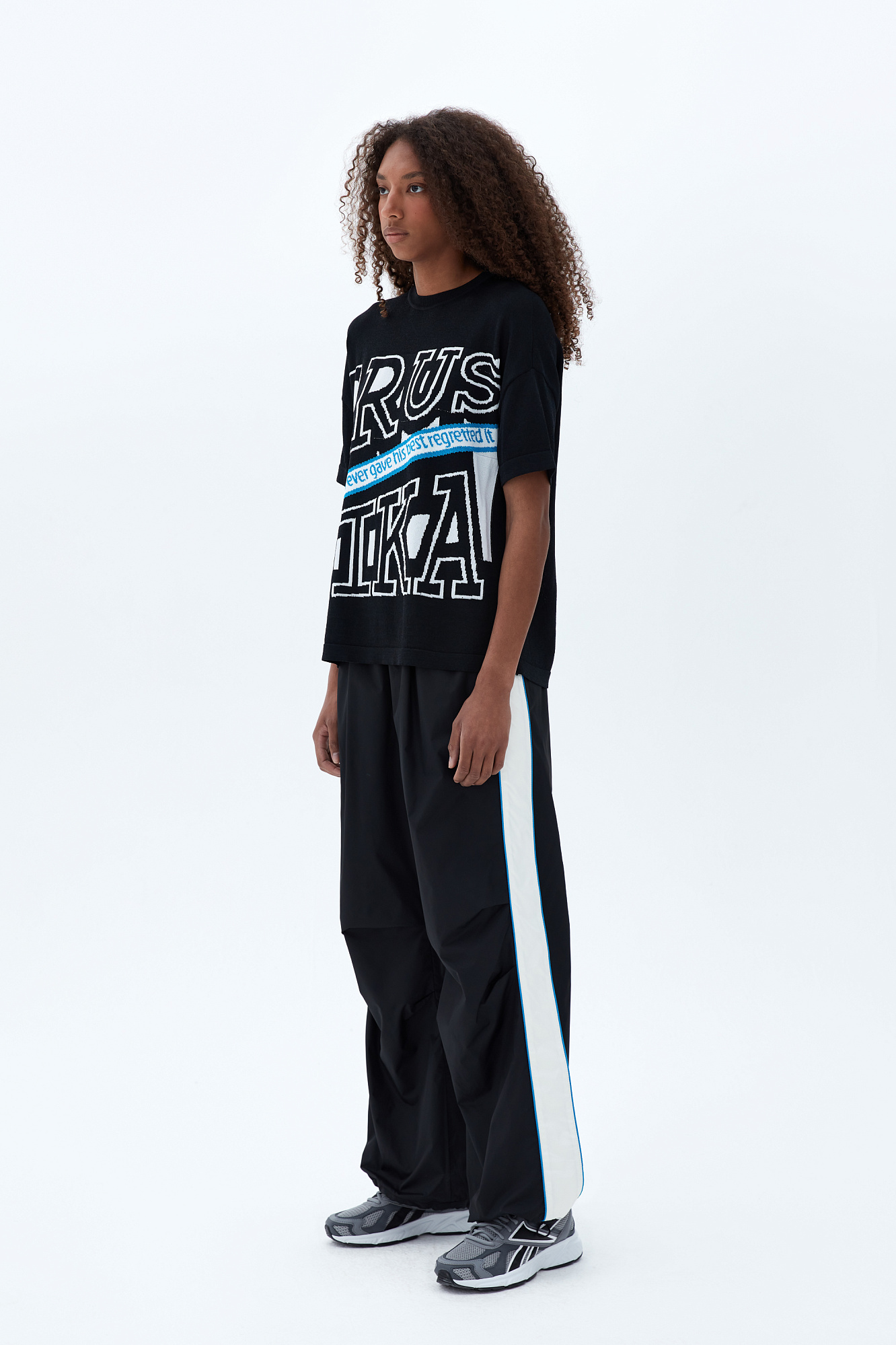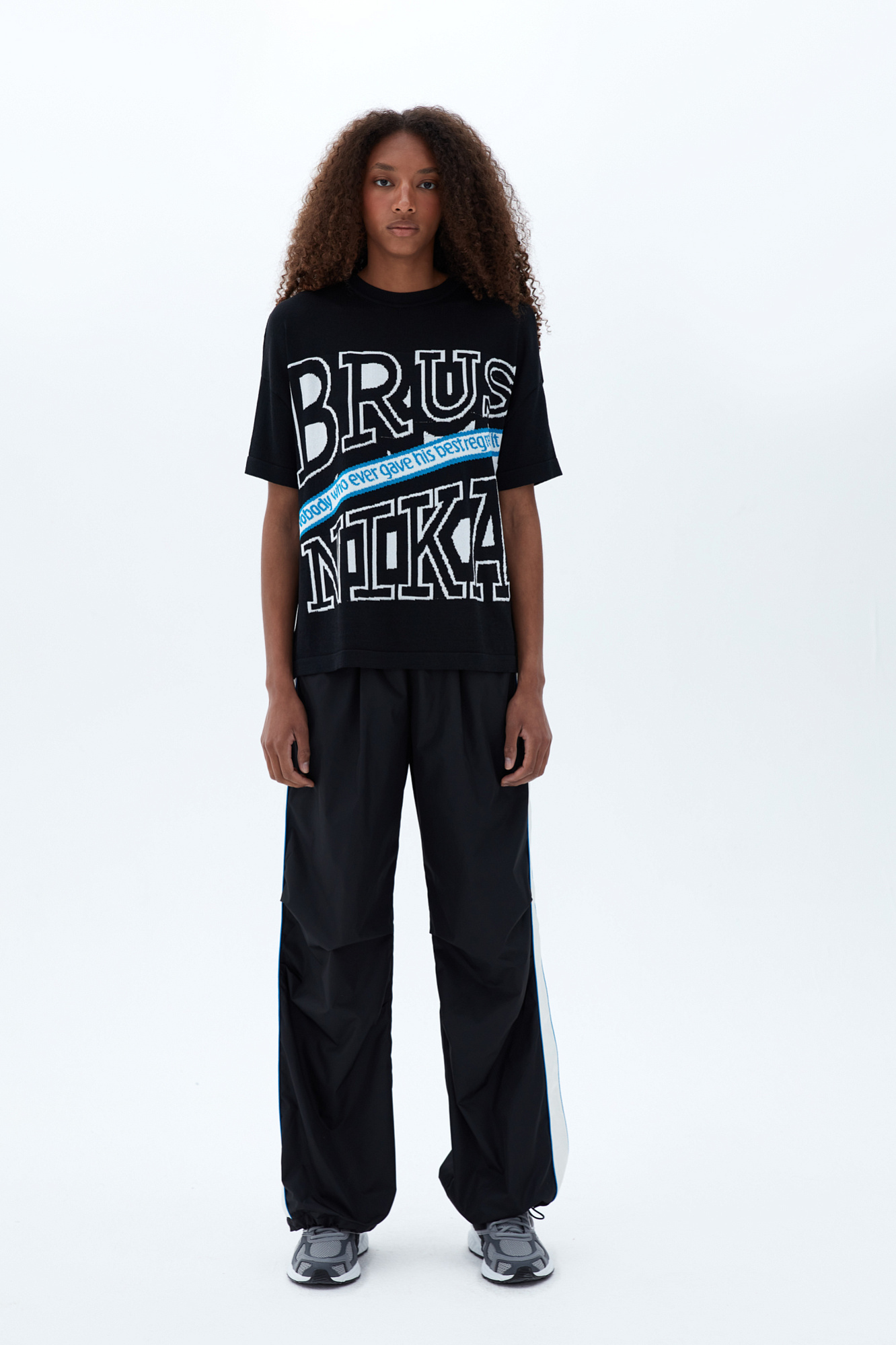 Трикотажная футболка вискозы с жаккардовым рисунком. Модель прямого кроя, со спущенной линией плеч, коротким рукавом и круглым вырезом горловины. Изделие декорировано текстовым жаккардом.