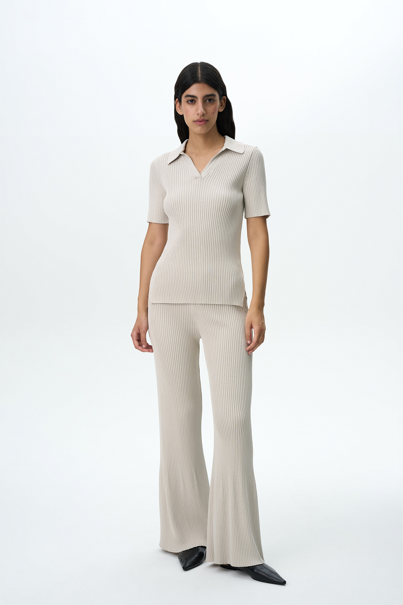 Трикотажная футболка в широкий рубчик с удлиненной спинкой и боковыми разрезами. Модель с отложным воротником и V-образным вырезом.