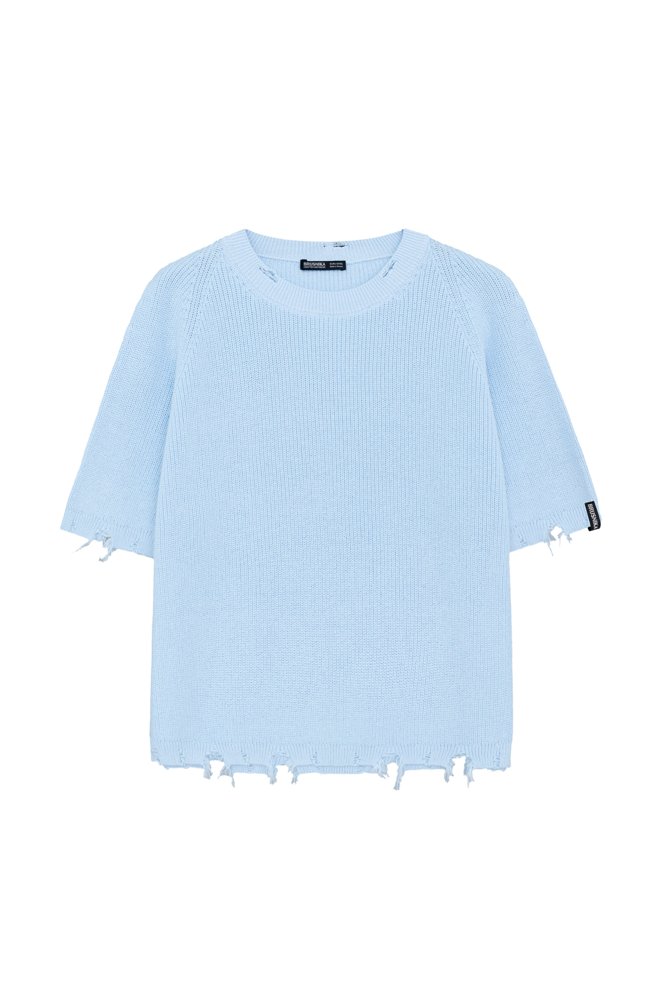 Трикотажная футболка из 100% хлопка. Модель свободного силуэта, со спущенной линией плеча, коротким рукавом и брендированным ярлыком на рукаве. Имитация необработанного края по низу изделия, на манжетах и воротнике.