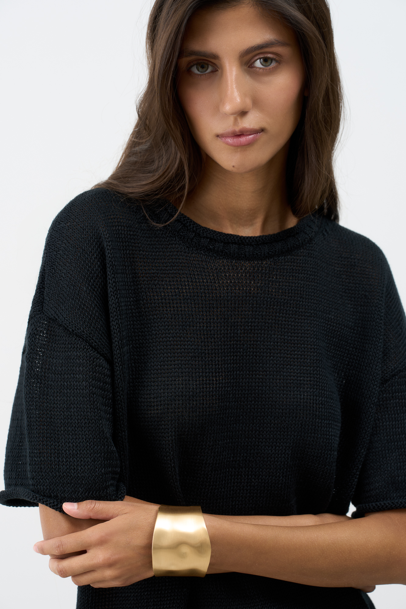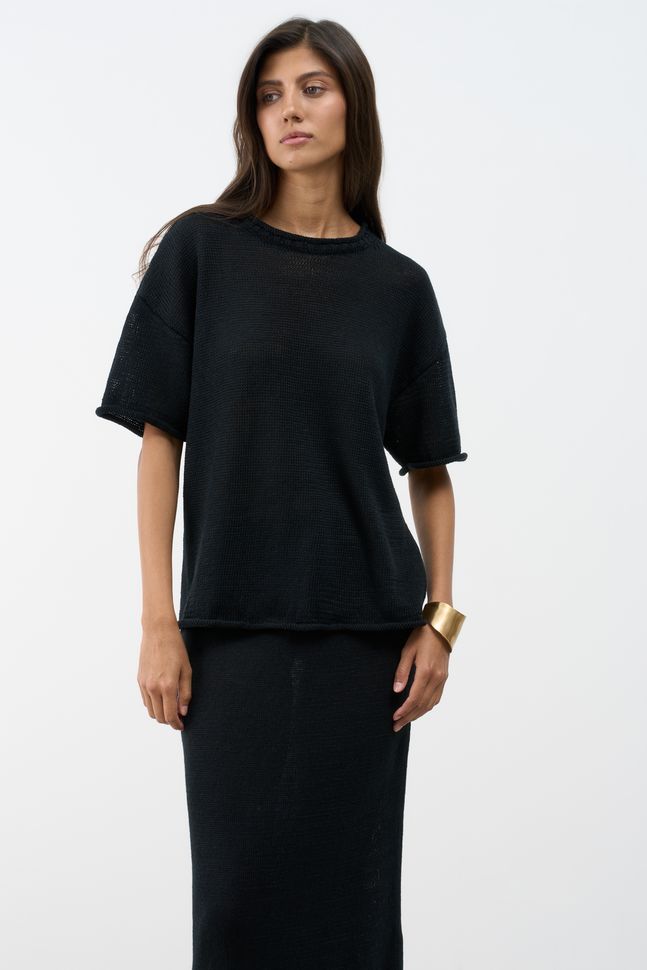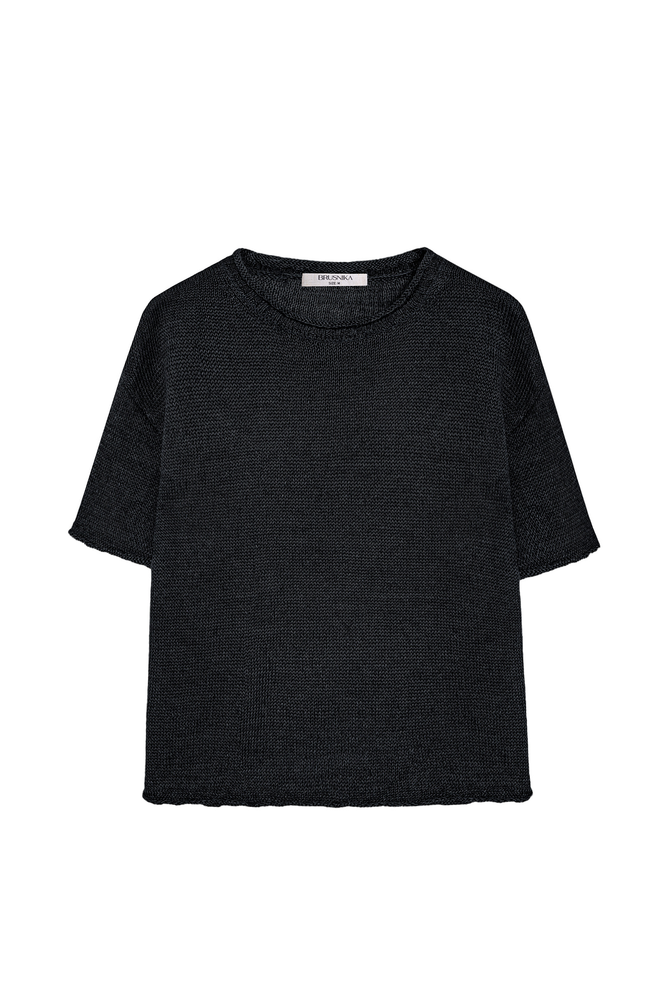 Трикотажная футболка из 100% льна. Модель свободного силуэта со спущенной линией плеча, коротким рукавом и круглымм вырезом горловины.
