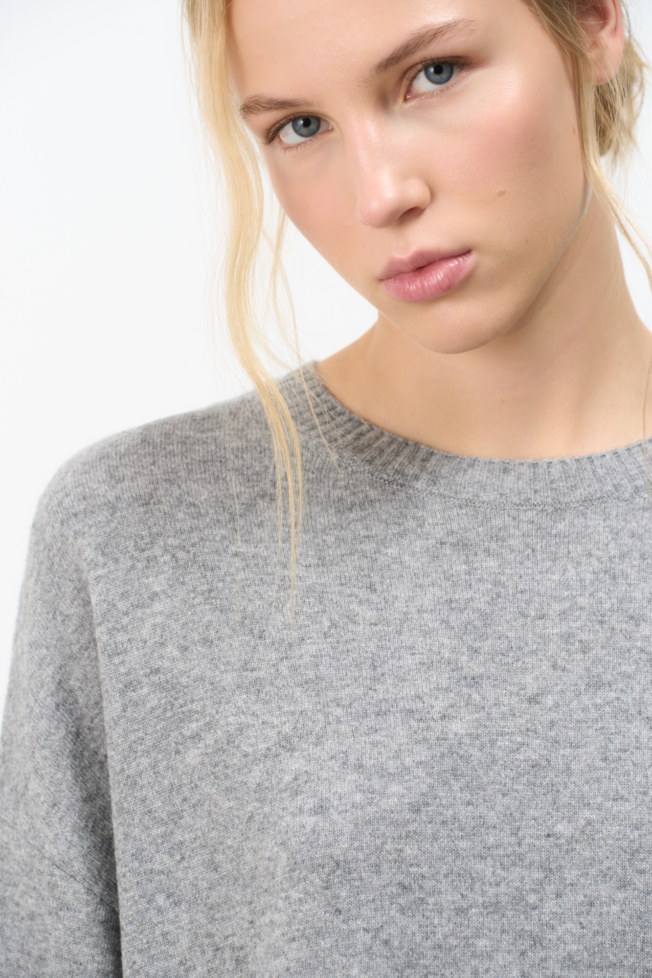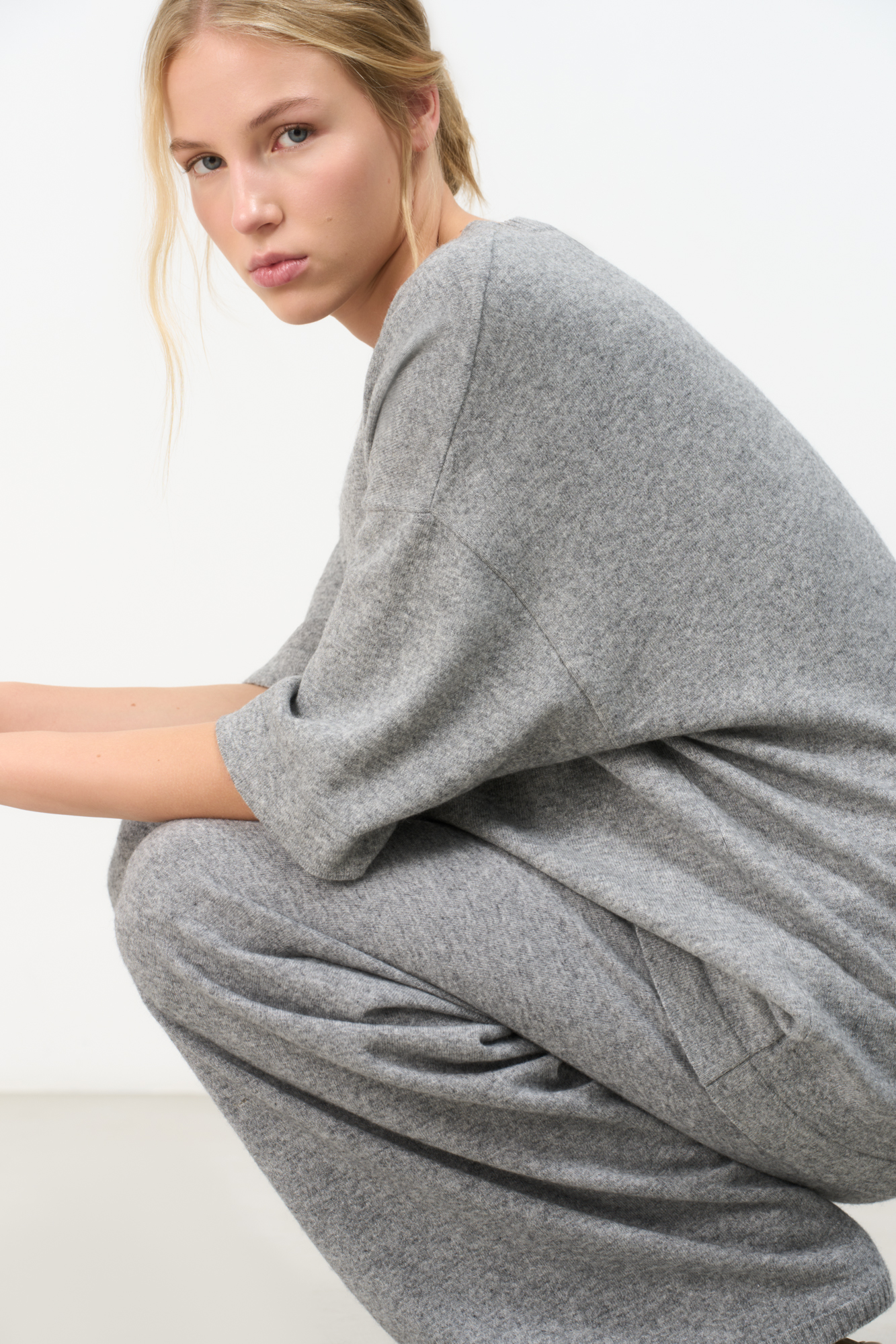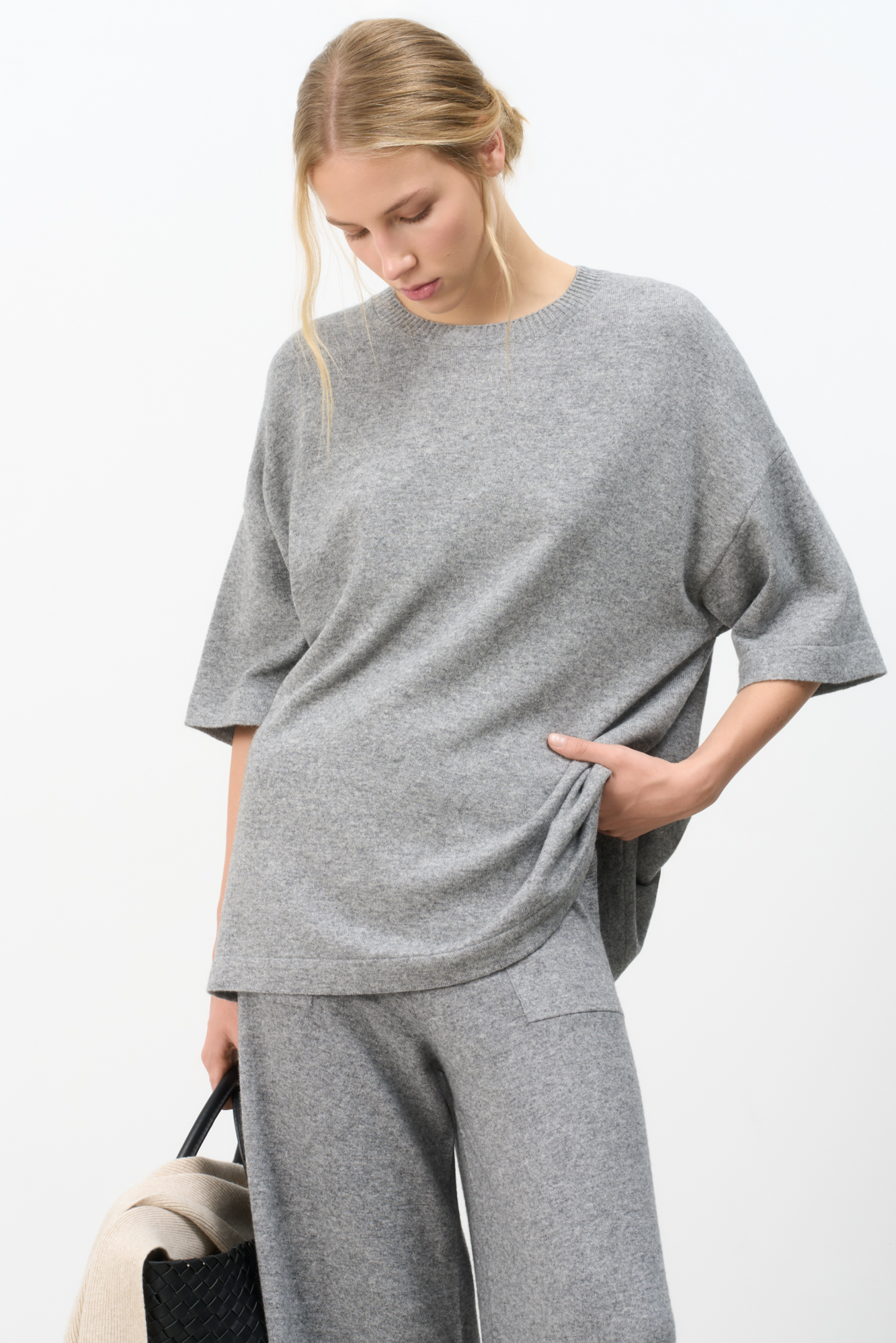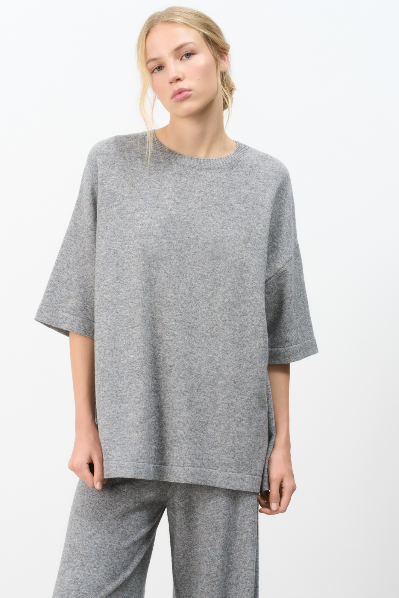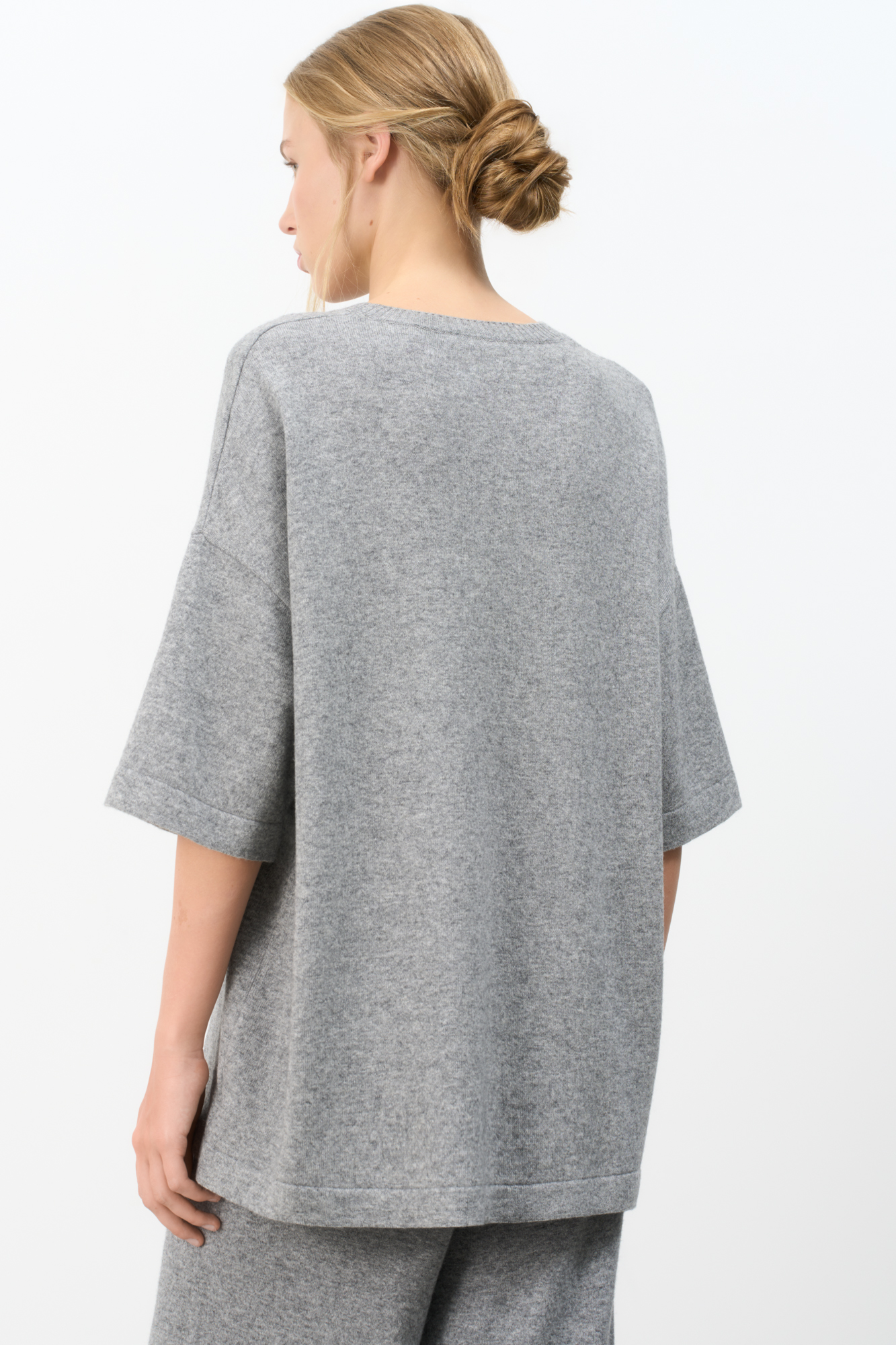 Трикотажная футболка из шерсти с добавлением кашемира. Модель свободного силуэта со спущенной линией плеча и круглой горловиной.