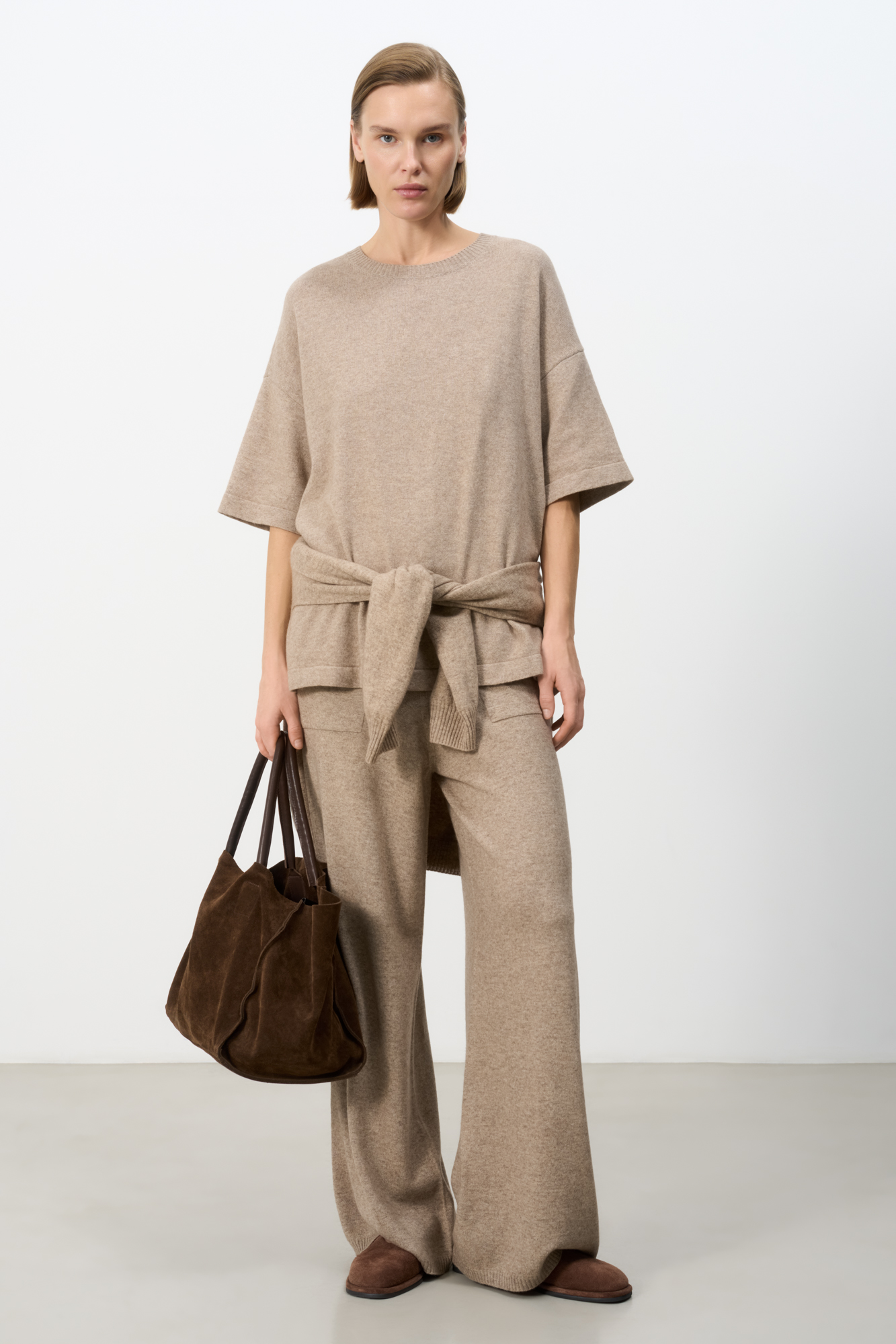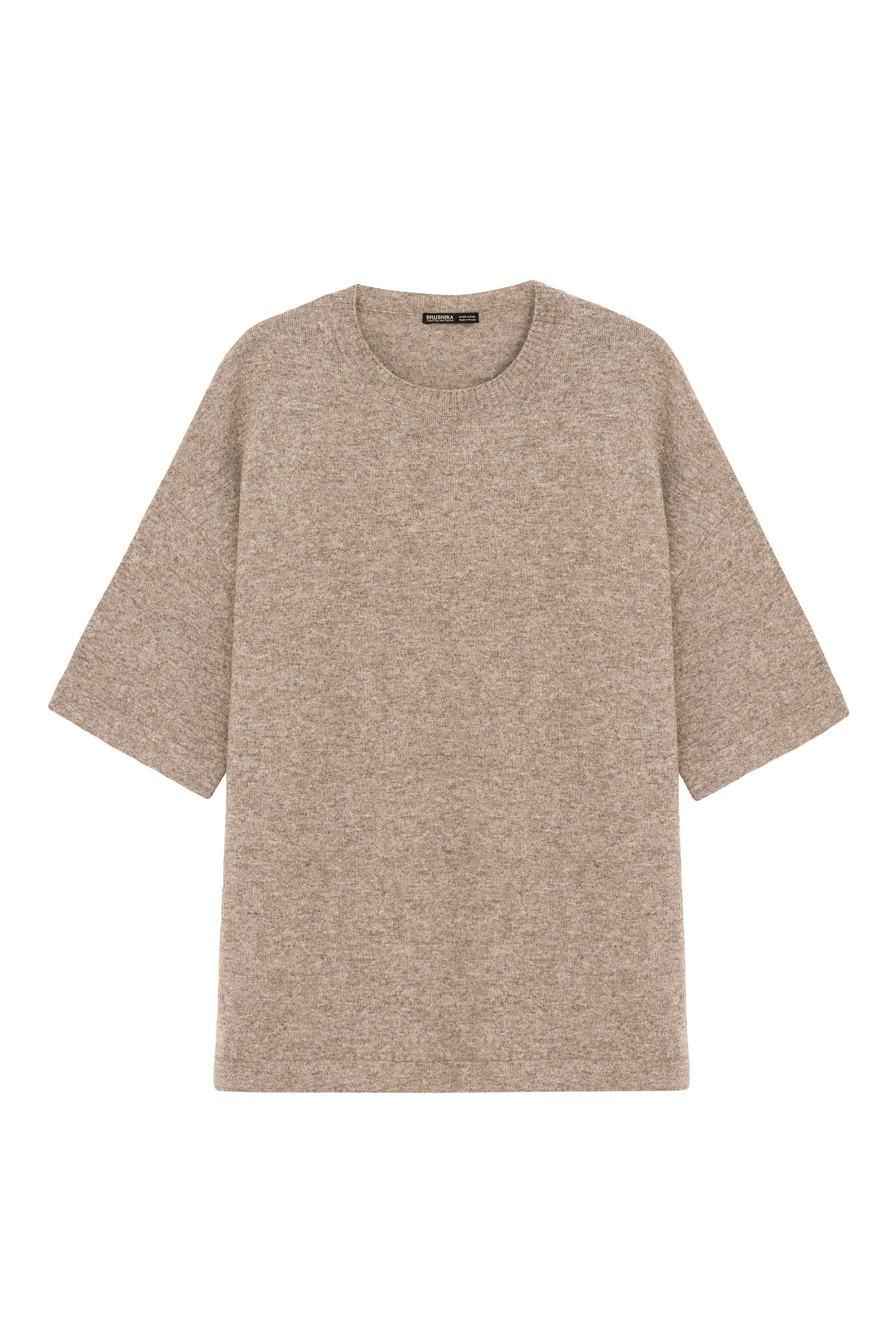 Трикотажная футболка из шерсти с добавлением кашемира. Модель свободного силуэта со спущенной линией плеча и круглой горловиной.