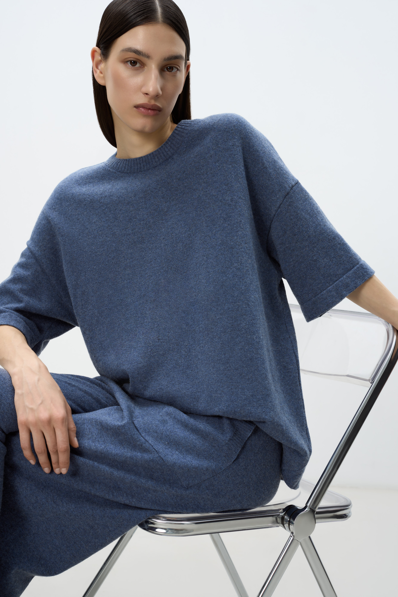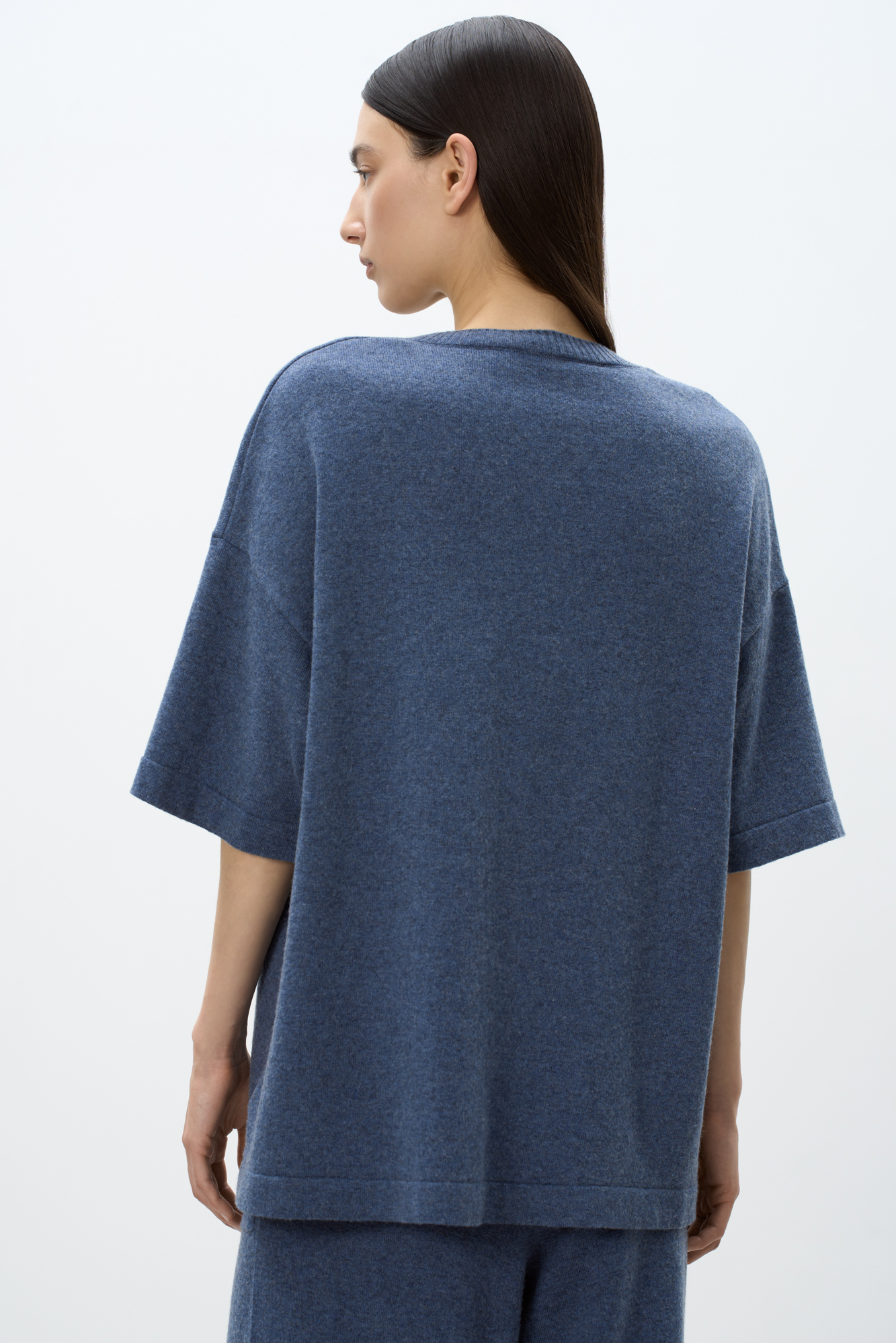 Трикотажная футболка из шерсти с добавлением кашемира. Модель свободного силуэта со спущенной линией плеча и круглой горловиной.