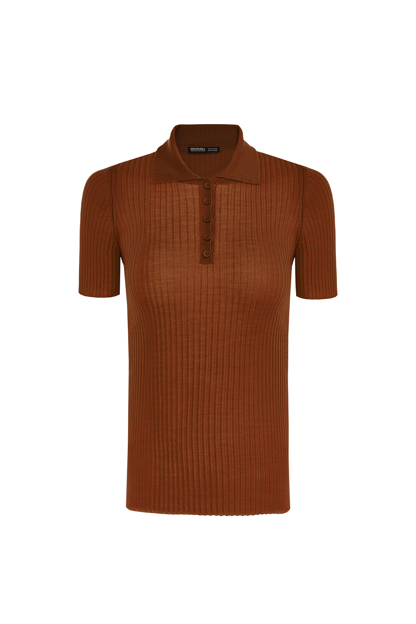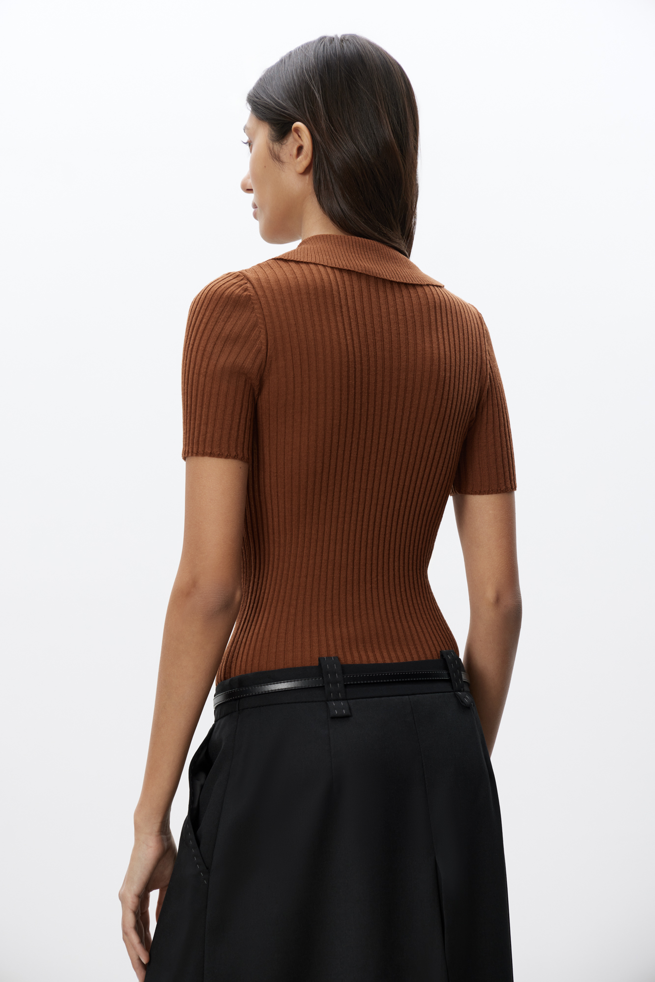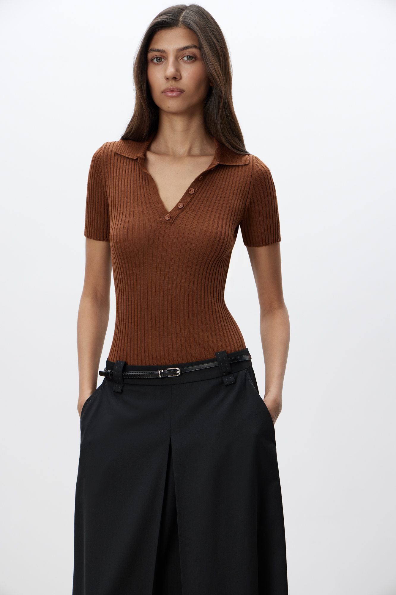 Трикотажное поло из смесовой шерсти. Модель приталенного силуэта, с коротким рукавом, отложным воротником и застежкой на пуговицы на планке.