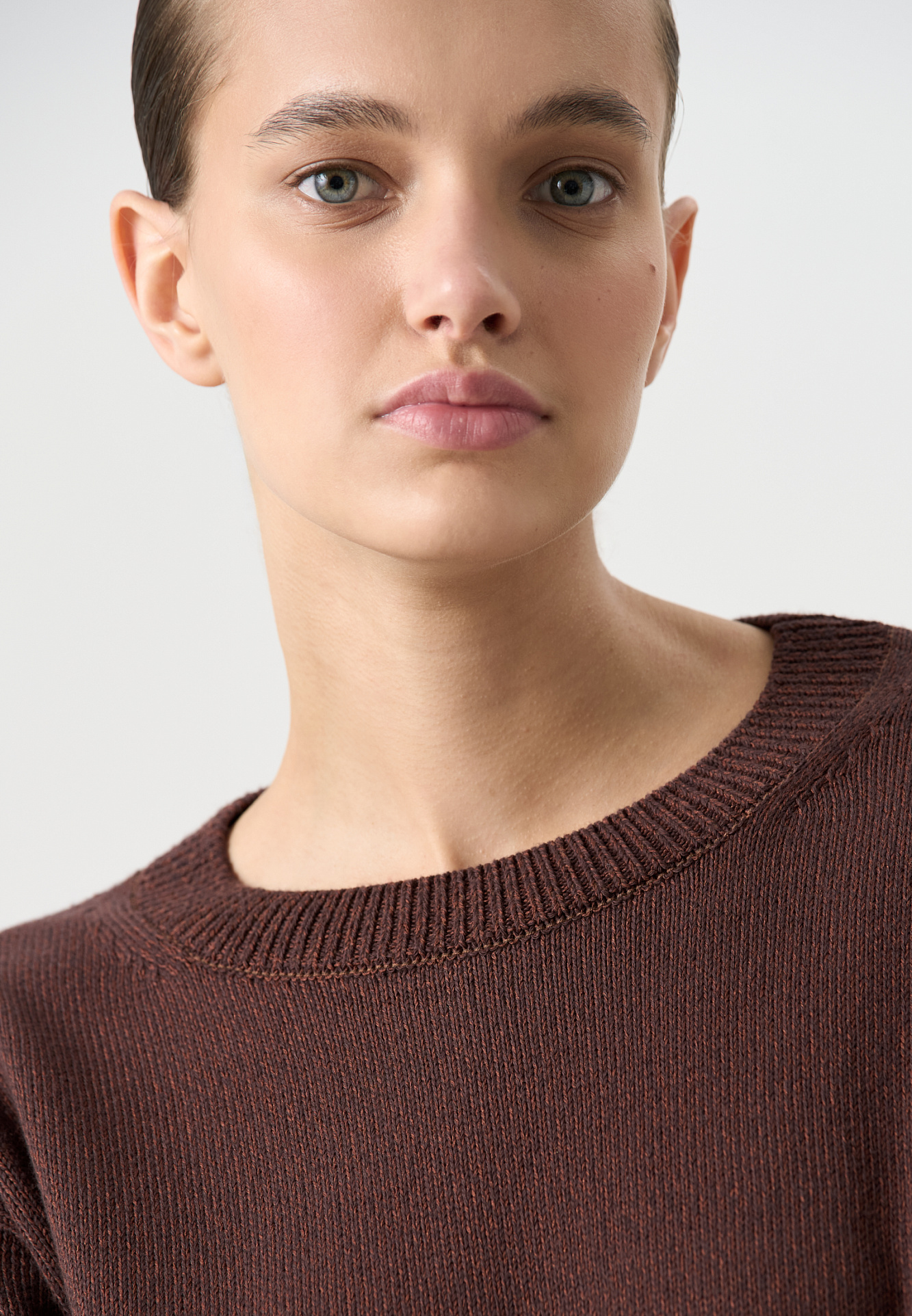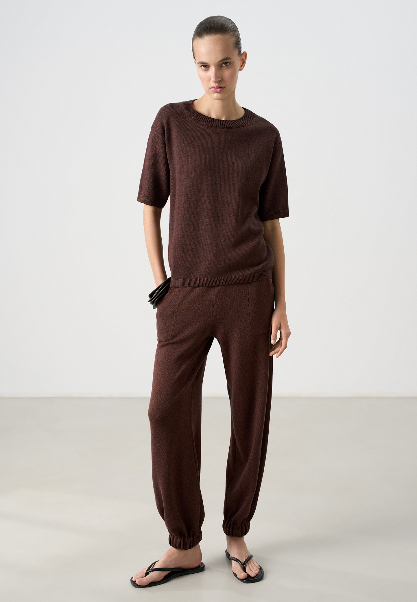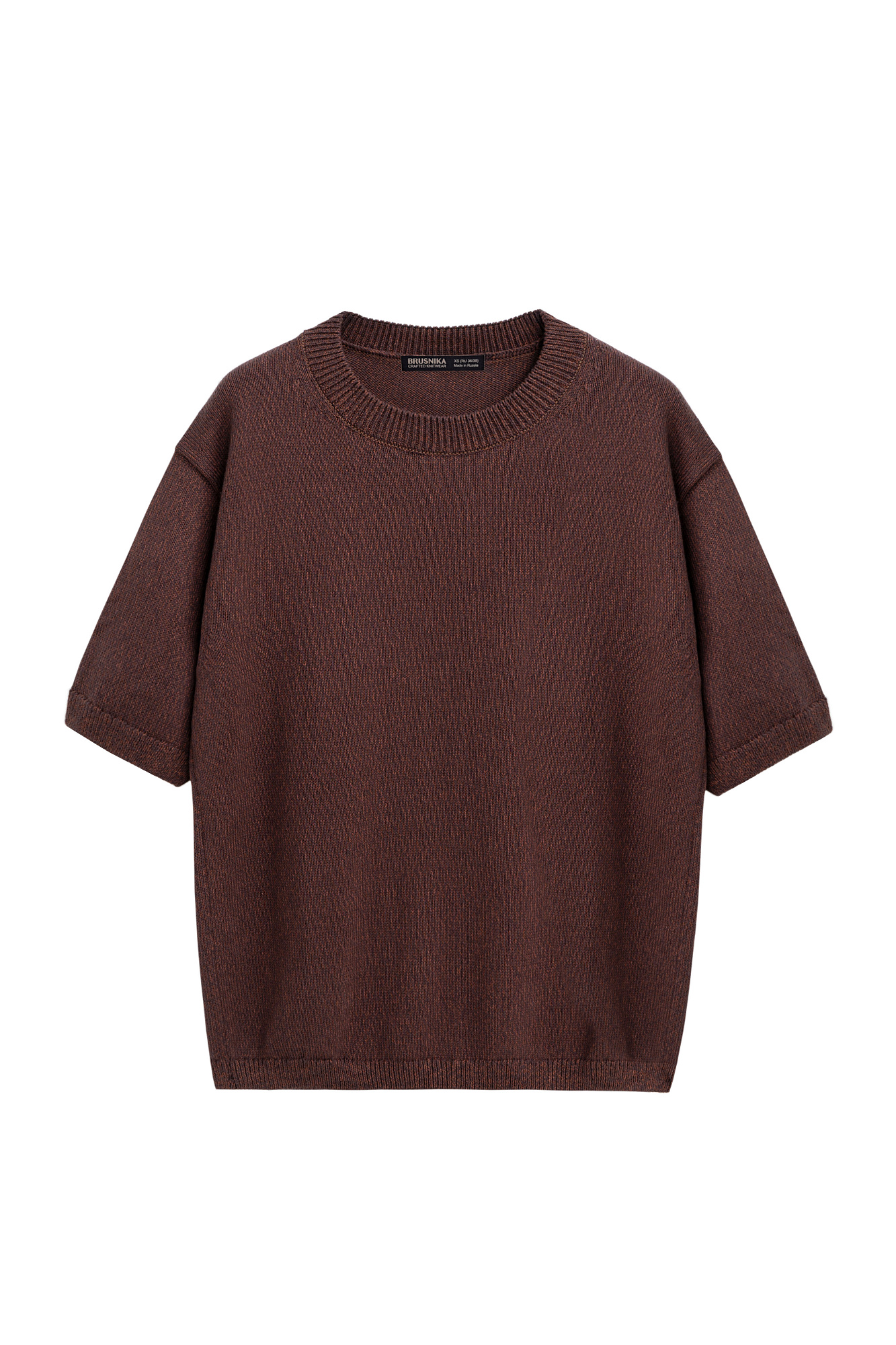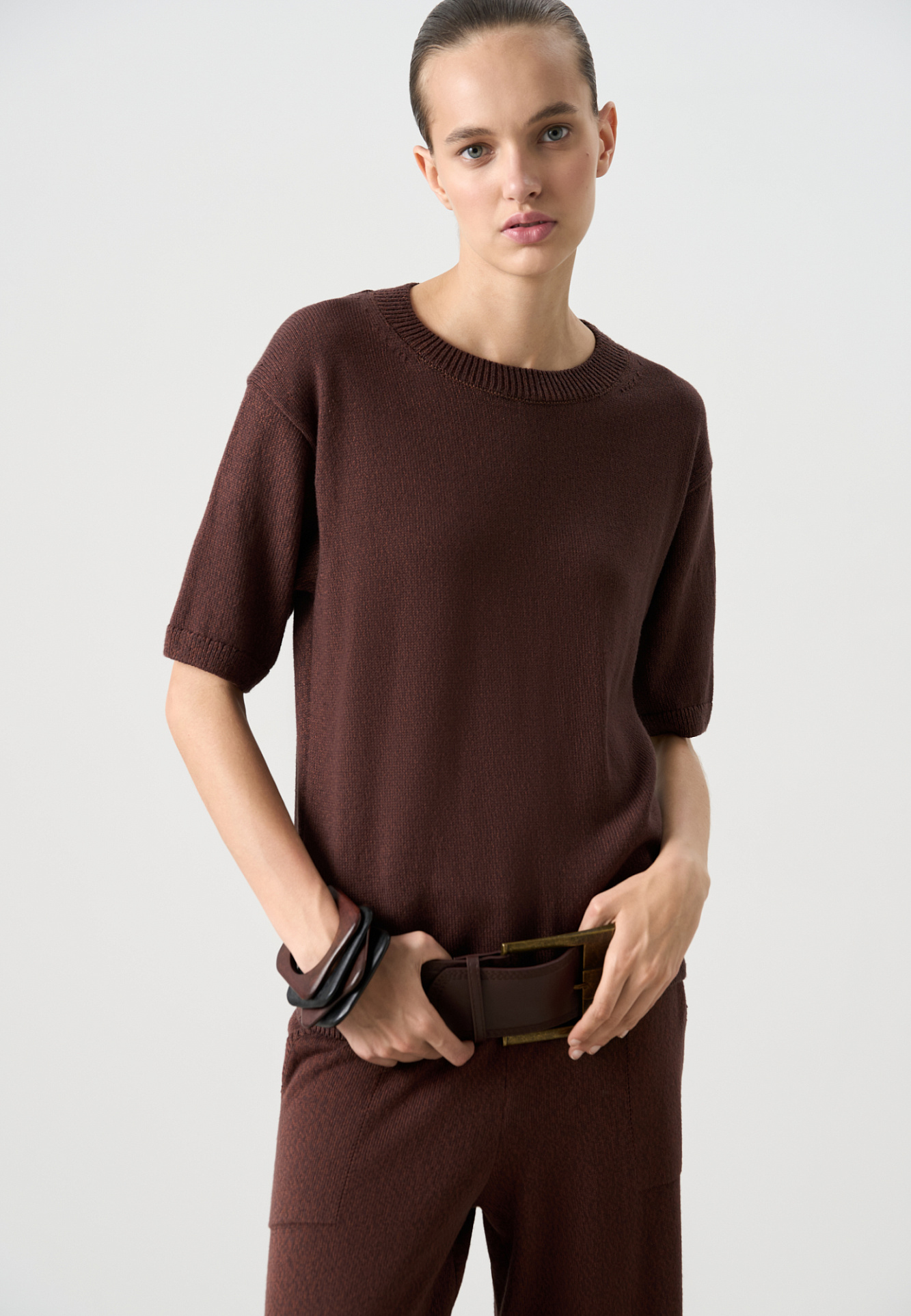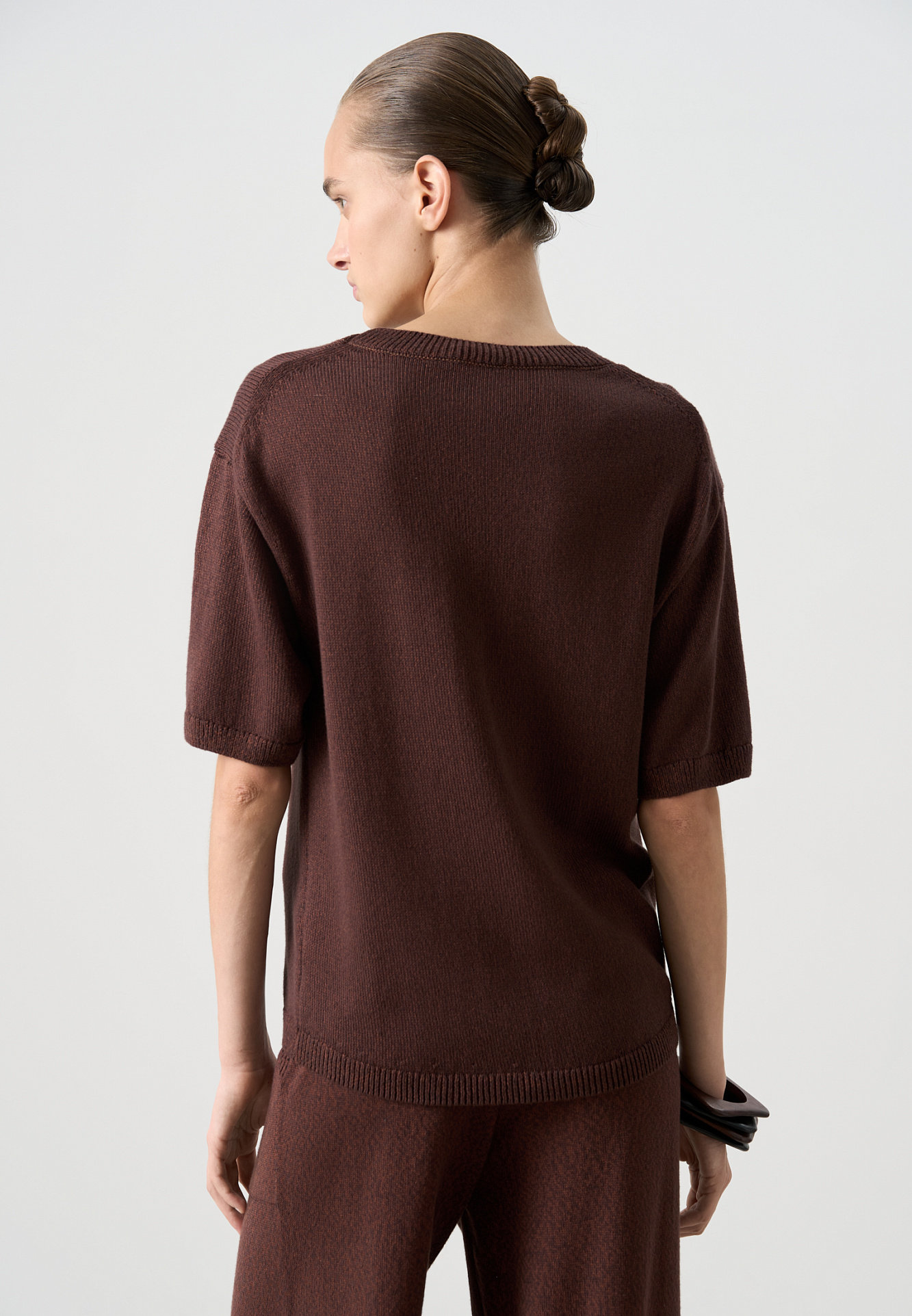 Трикотажная футболка из хлопка с добавлением вискозы. Модель свободного силуэта, со спущенной линией плеч и круглым вырезом горловины. Края изделия выполнены в рубчик.
