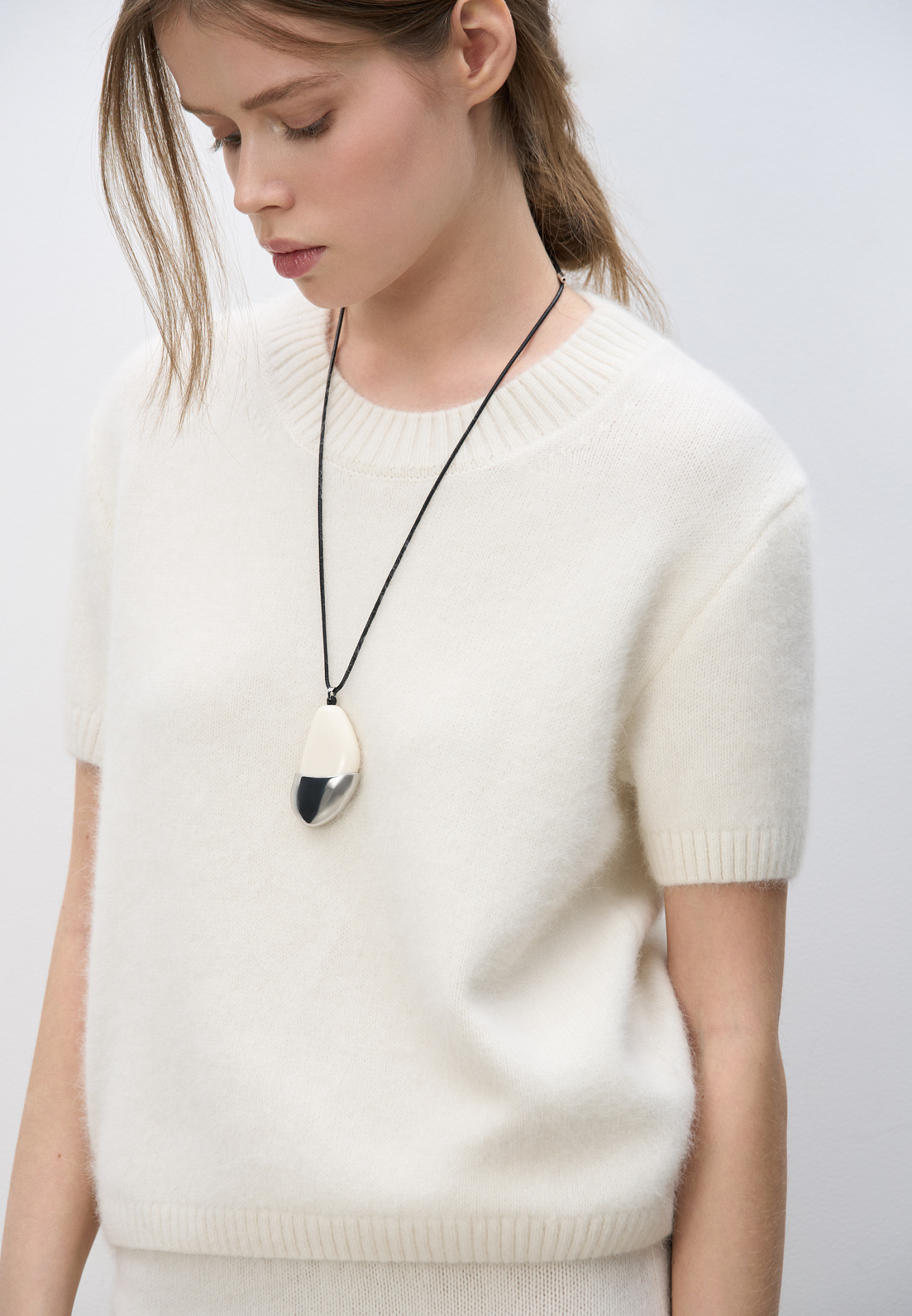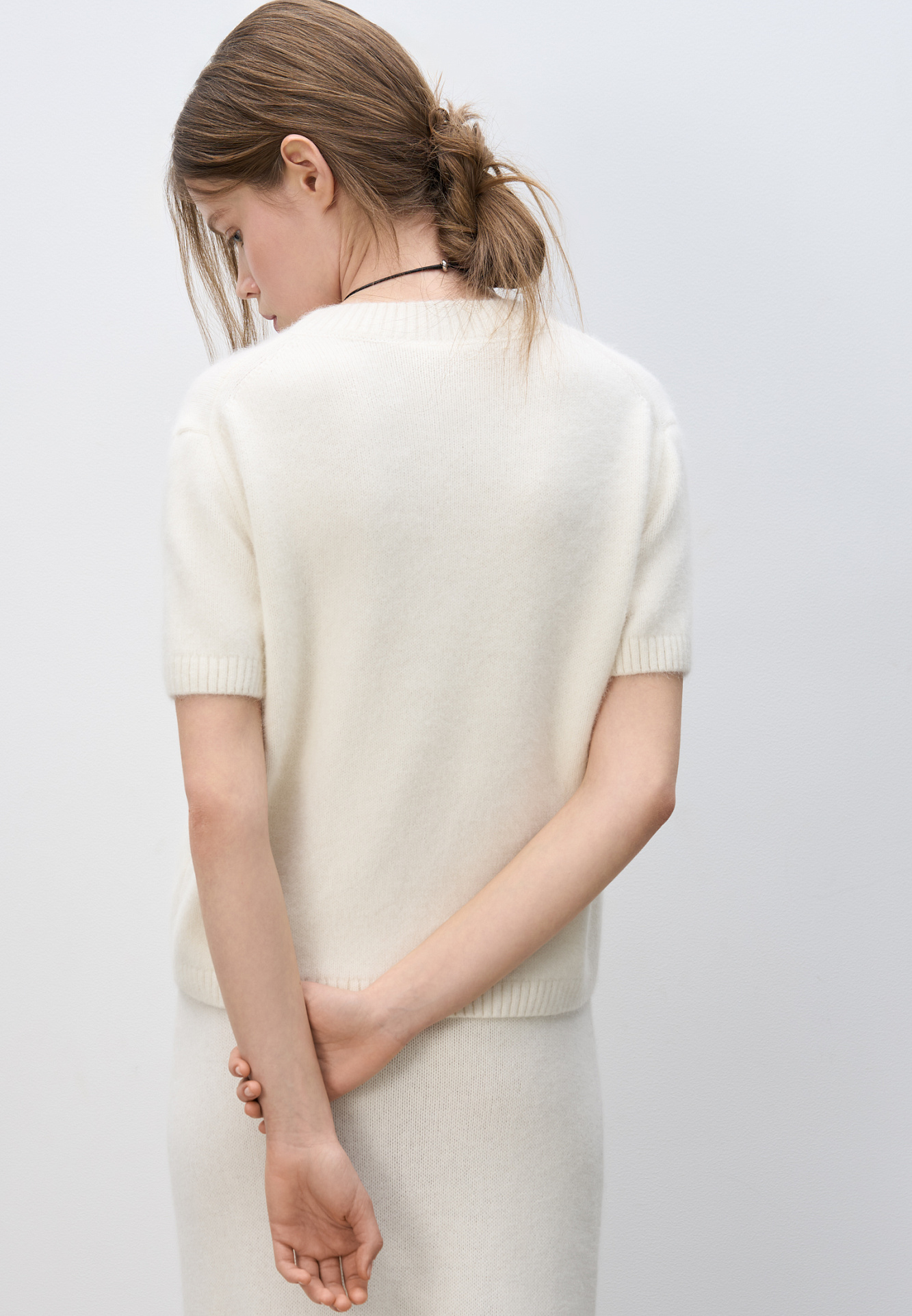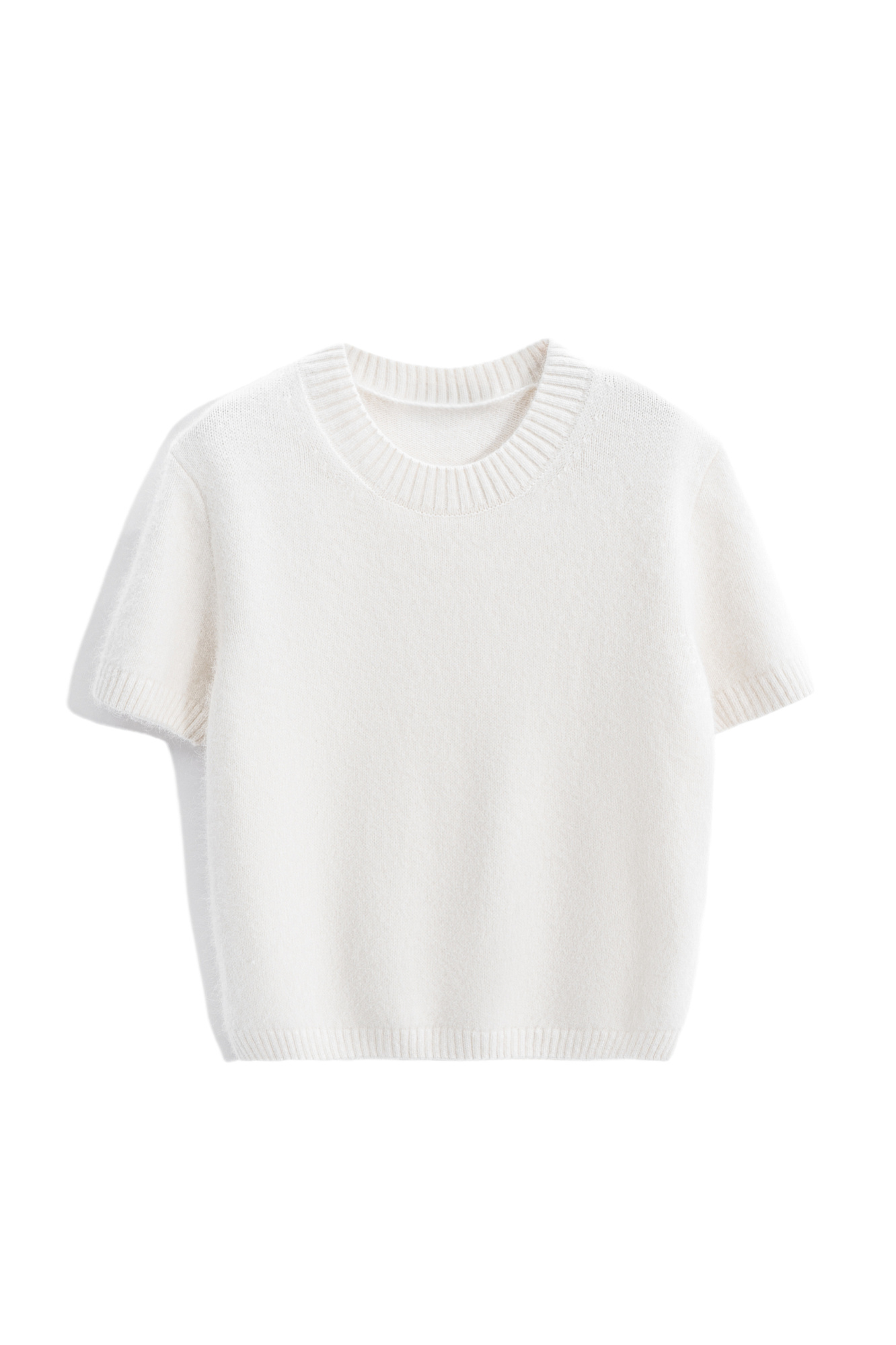 Трикотажная футболка из пуха лисы. Модель свободного силуэта, с коротким рукавом и круглым вырезом горловины. Края изделия выполнены в рубчик. Дополнить образ можно юбкой.