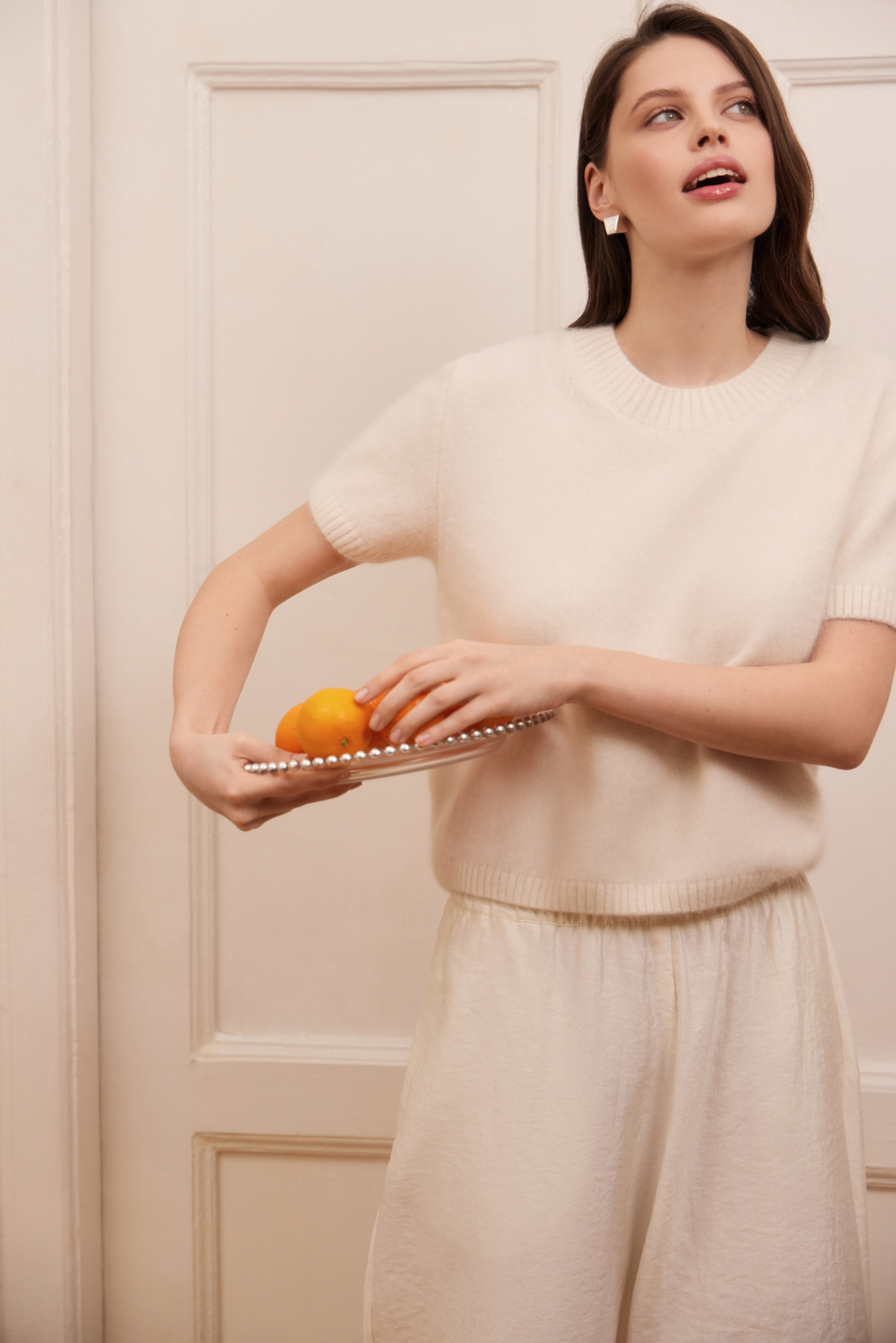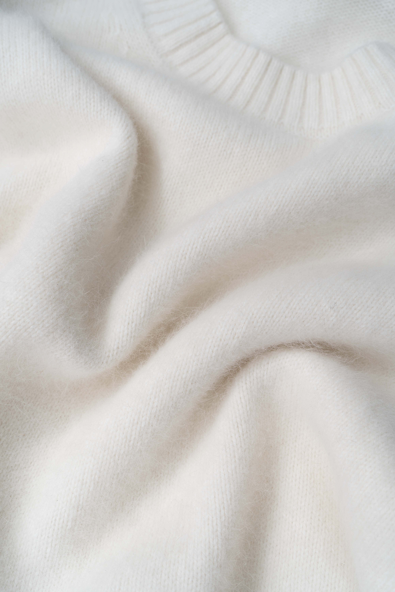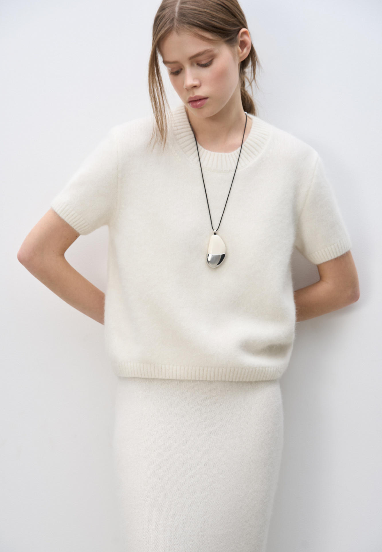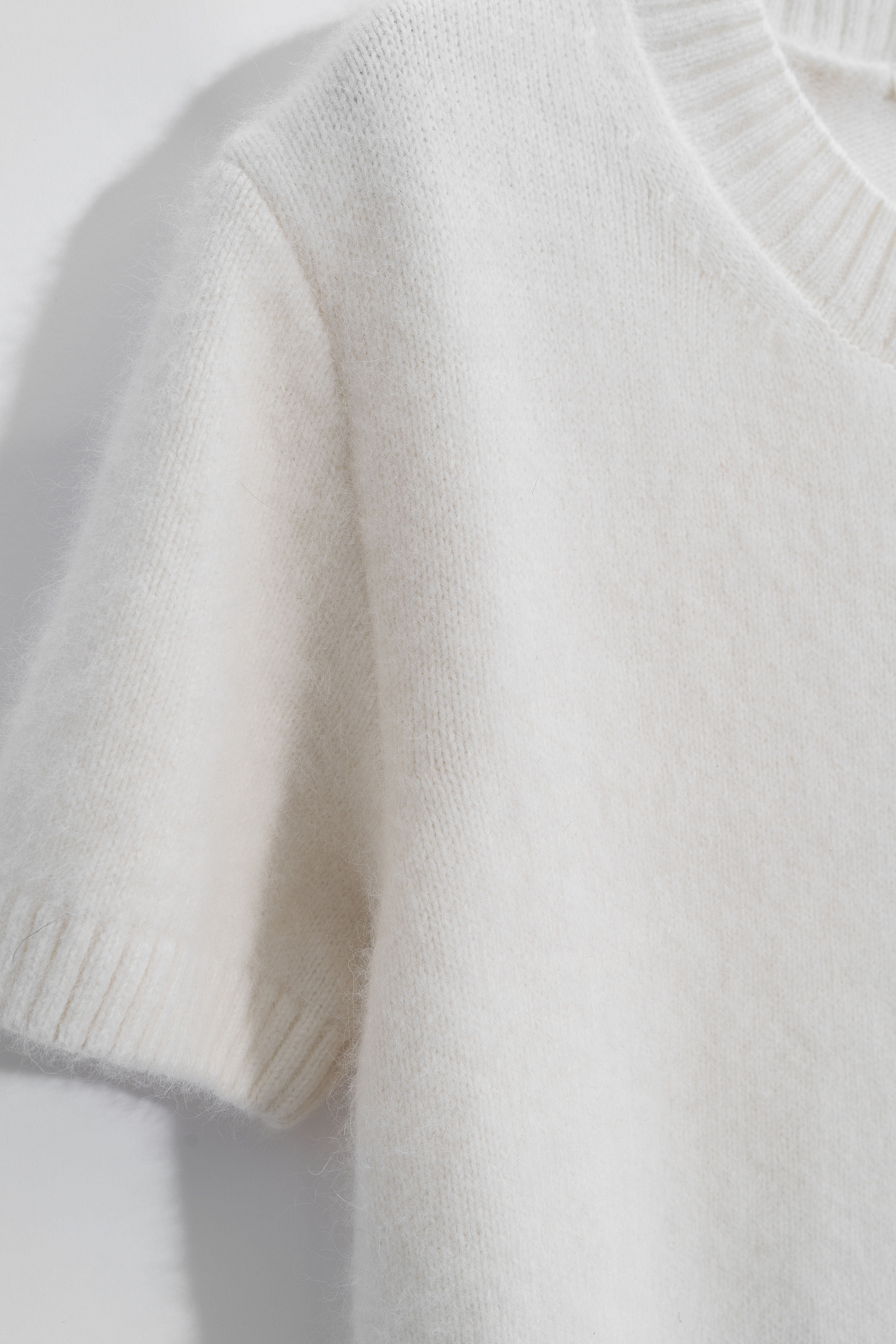 Трикотажная футболка из пуха лисы. Модель свободного силуэта, с коротким рукавом и круглым вырезом горловины. Края изделия выполнены в рубчик. Дополнить образ можно юбкой.