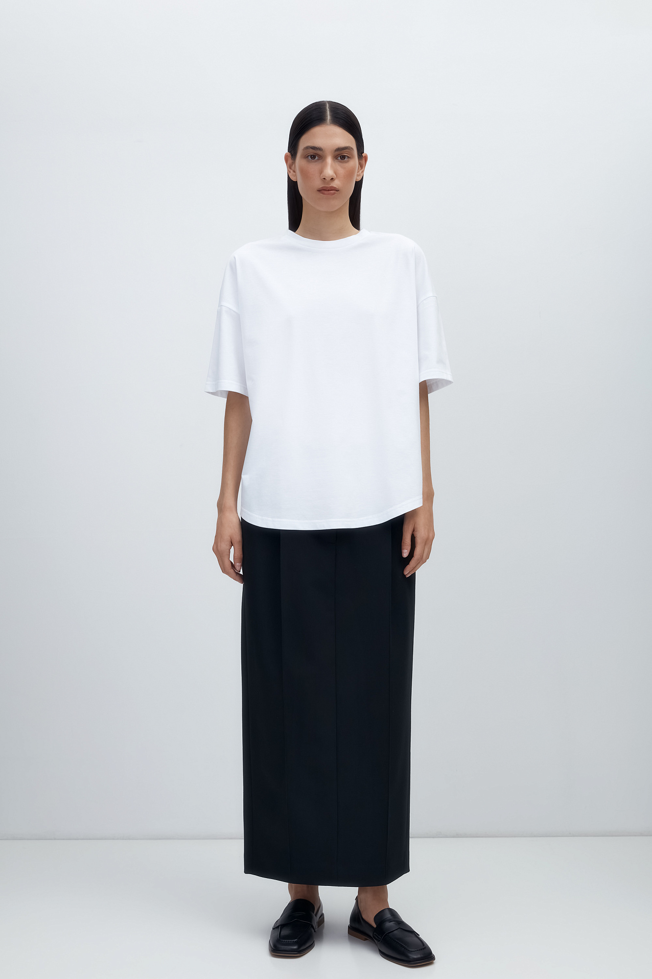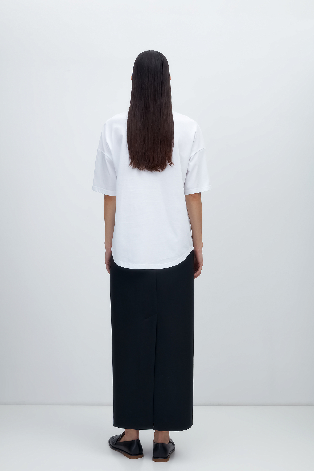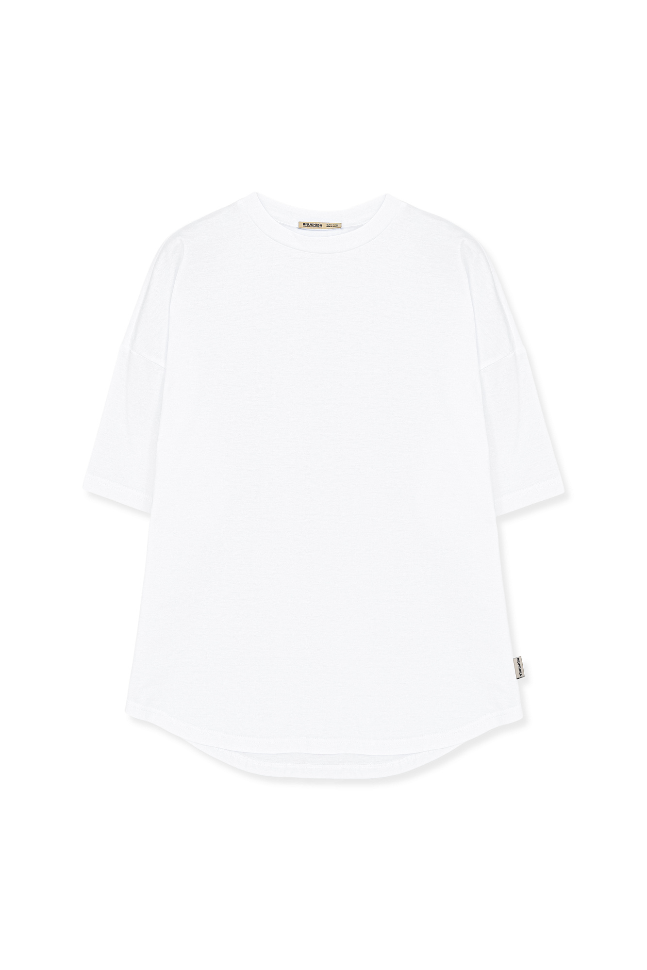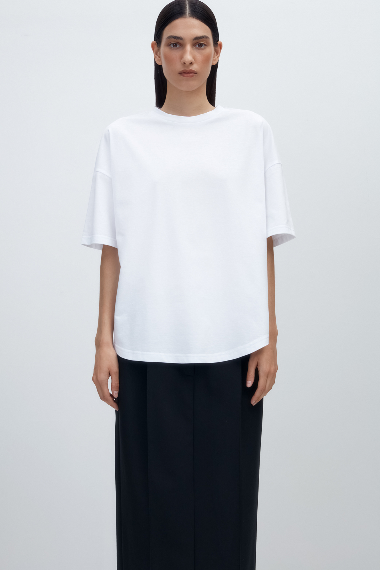 Классическая футболка из 100% хлопка со спущенным плечом и брендированной биркой сбоку. Модель свободного силуэта с асимметричным низом.
