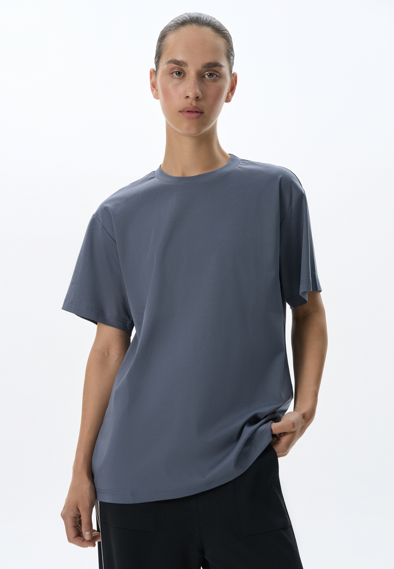 Футболка из 100% хлопка. Модель свободного силуэта, с круглым вырезом горловины и спущенной линией плеча.