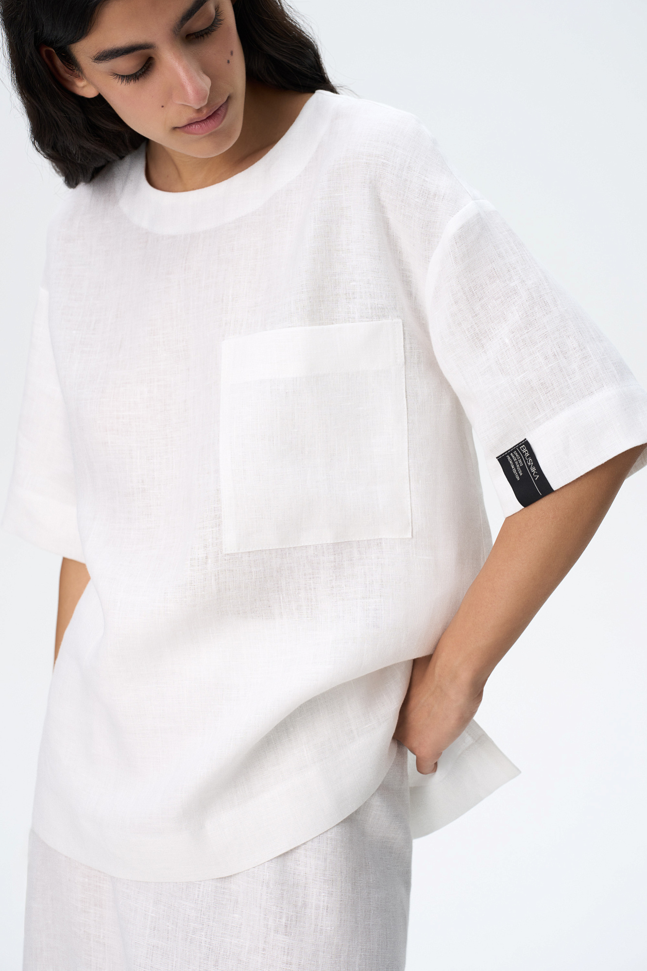 Широкая футболка из 100% льна. Модель прямого кроя, со спущенной линией плеча, круглым вырезом горловины и асимметричным низом с разрезами по бокам. Изделие декорировано накладным карманом на груди и брендированным ярлыком на рукаве. Застежка на пуговицу сзади.