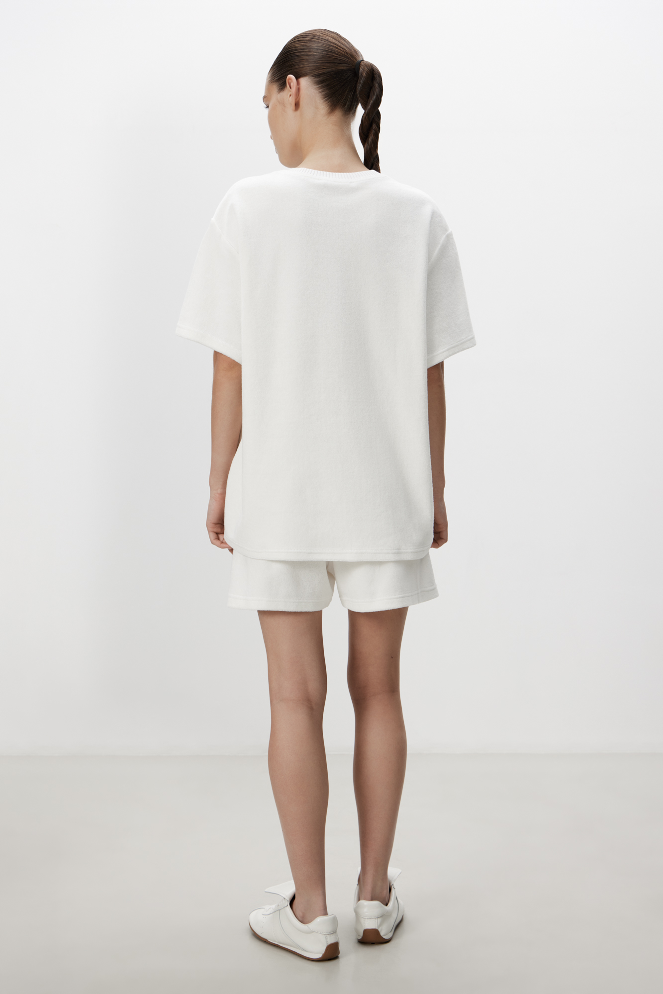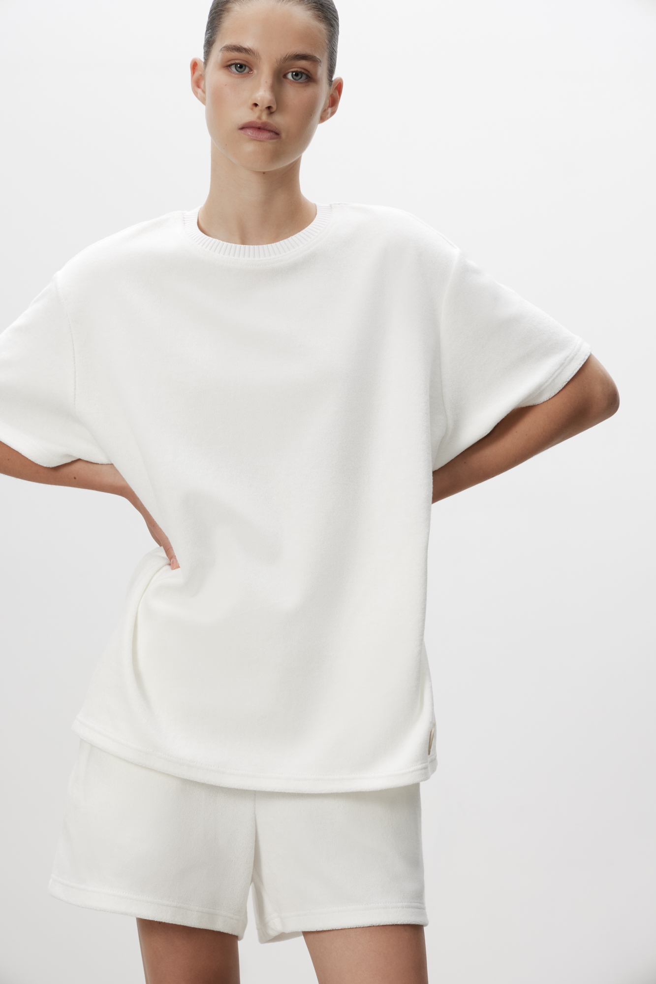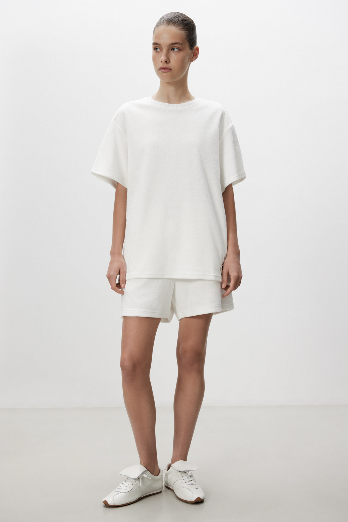 Футболка из махрового трикотажа. Модель свободного силуэта со спущенной линией плеча и брендированным ярлыком. Воротник обработан рибом. Дополнить образ можно шортами в таком же стиле.