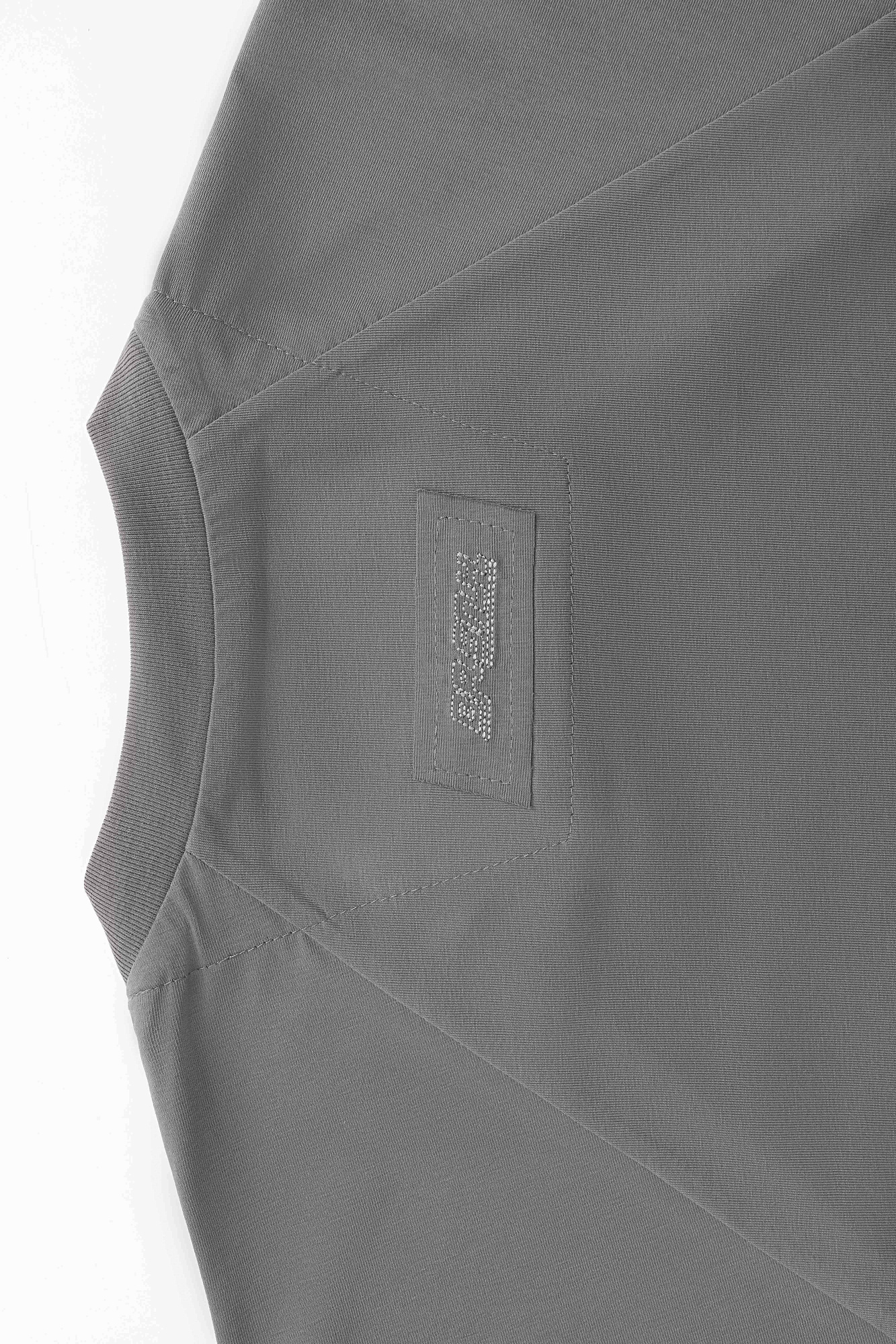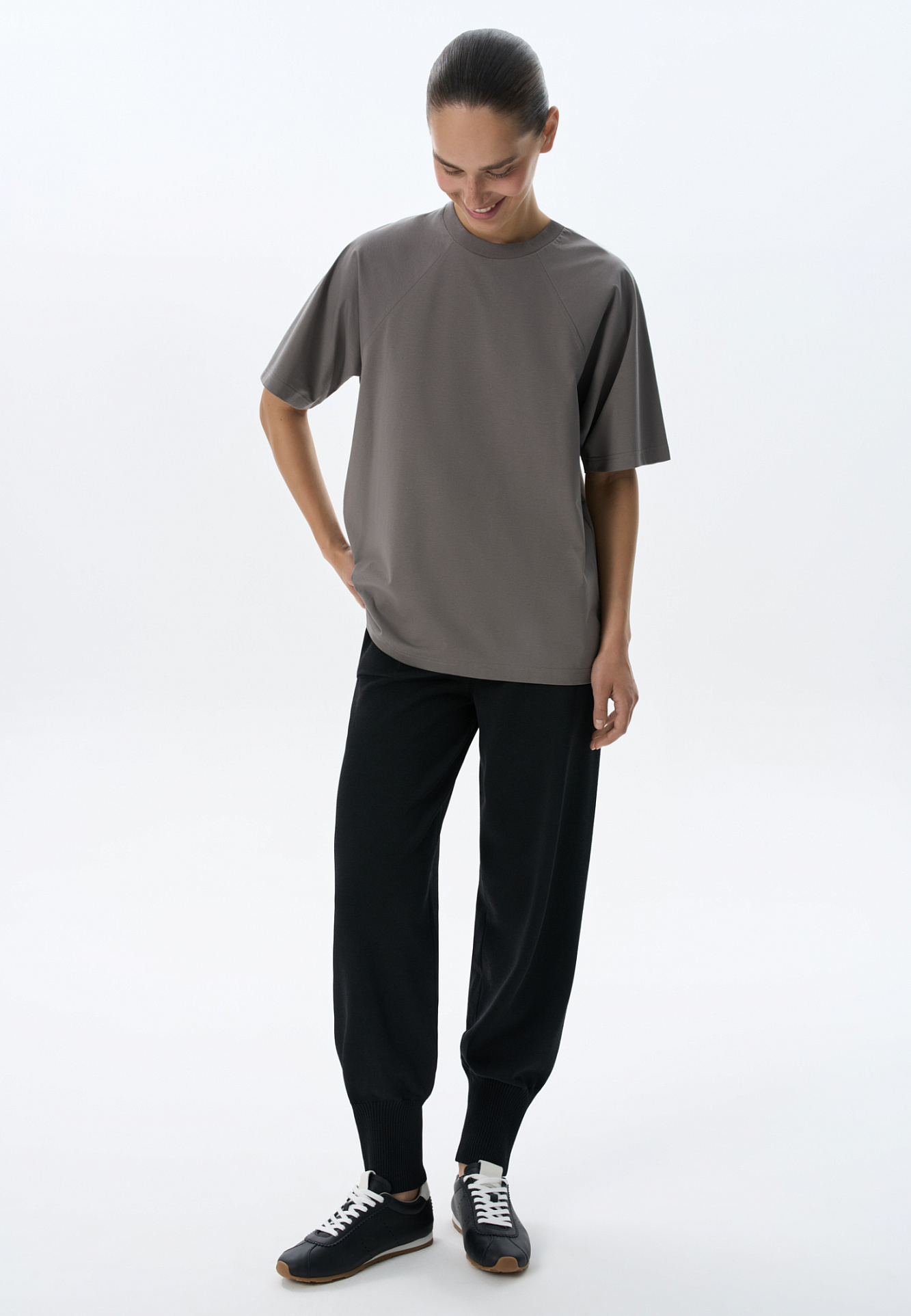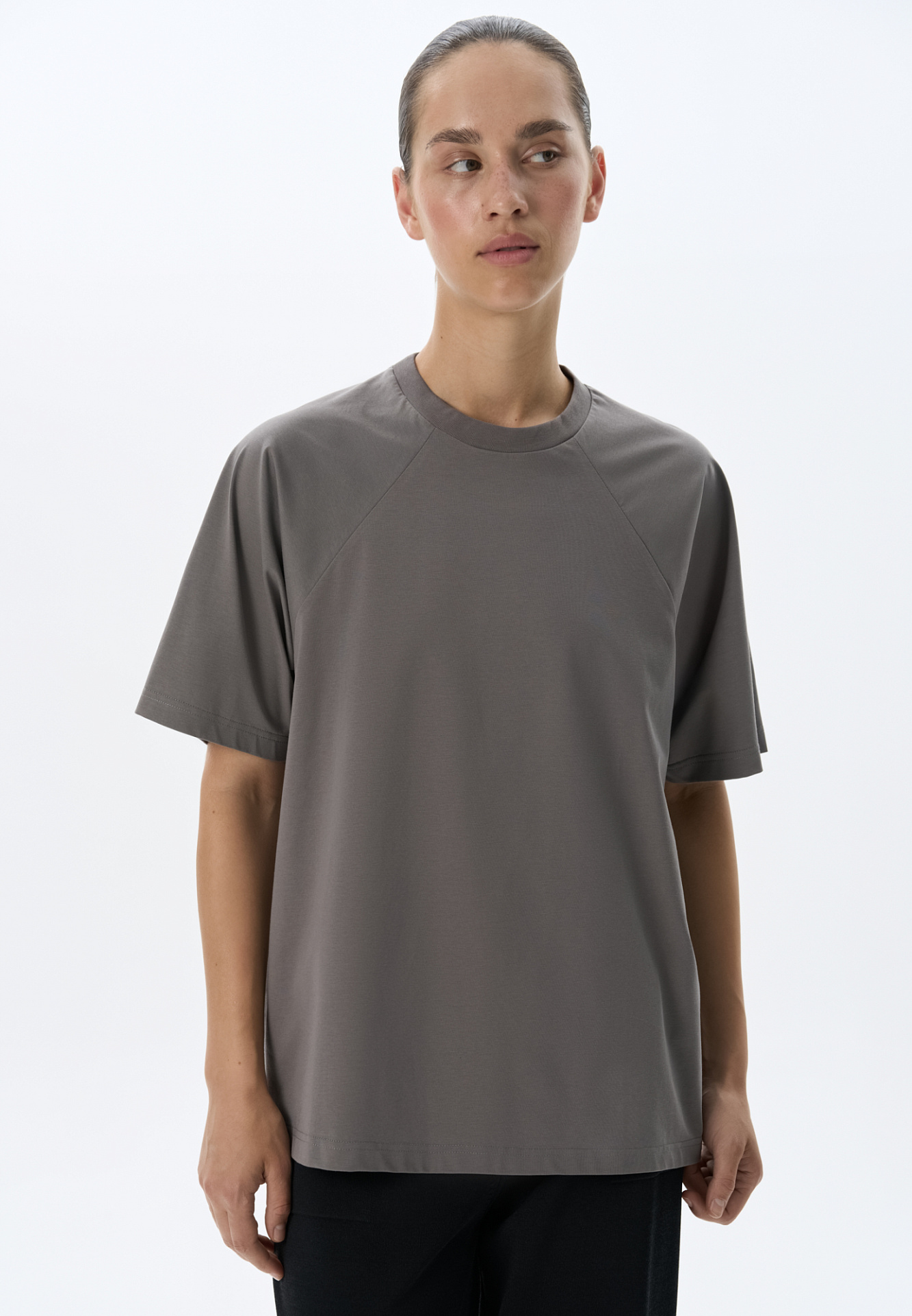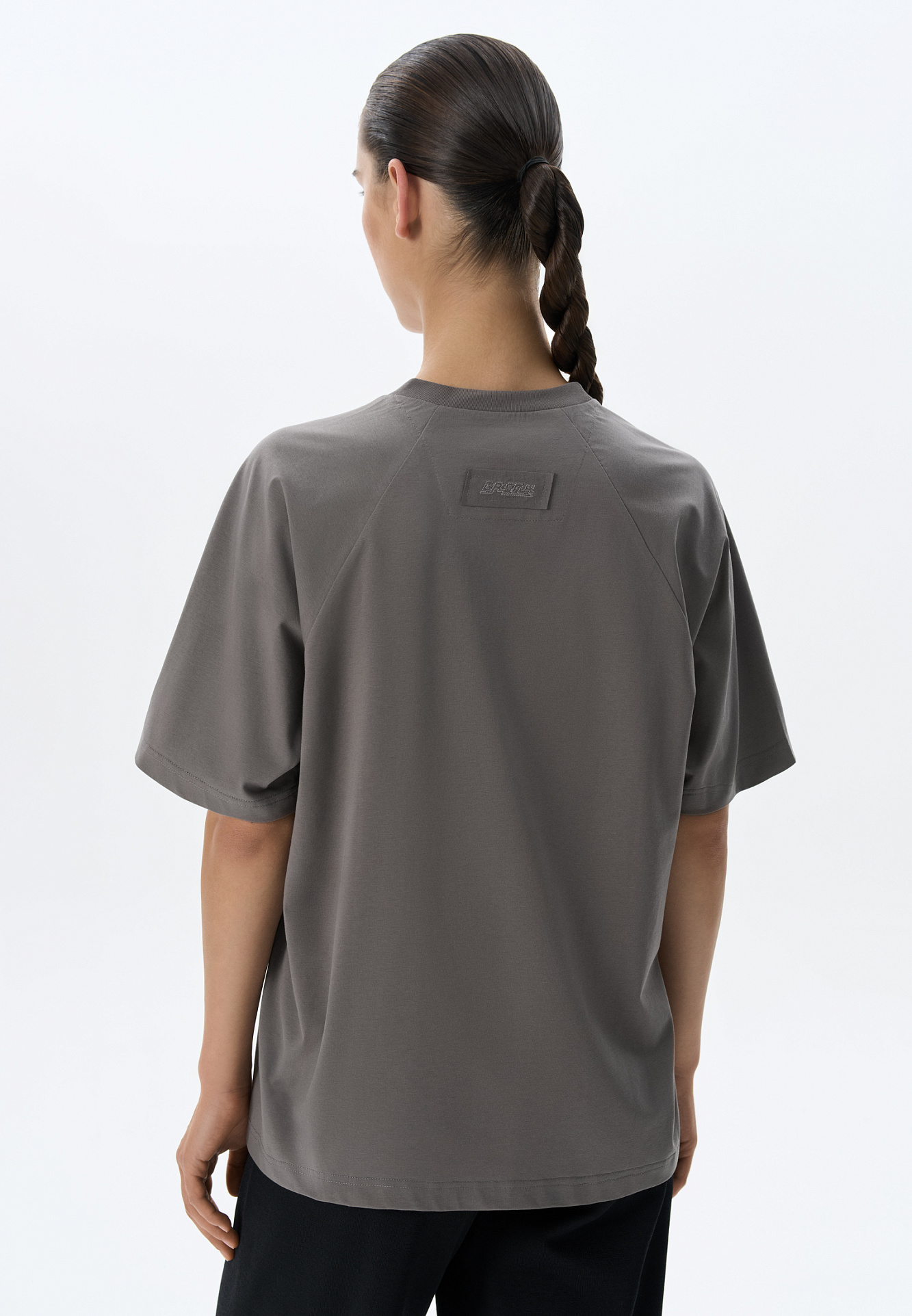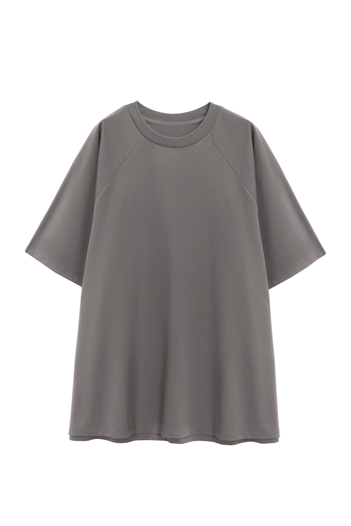 Футболка из хлопка с добавлением сорона. Модель прямого кроя, с круглым вырезом горловины и рукавом реглан.