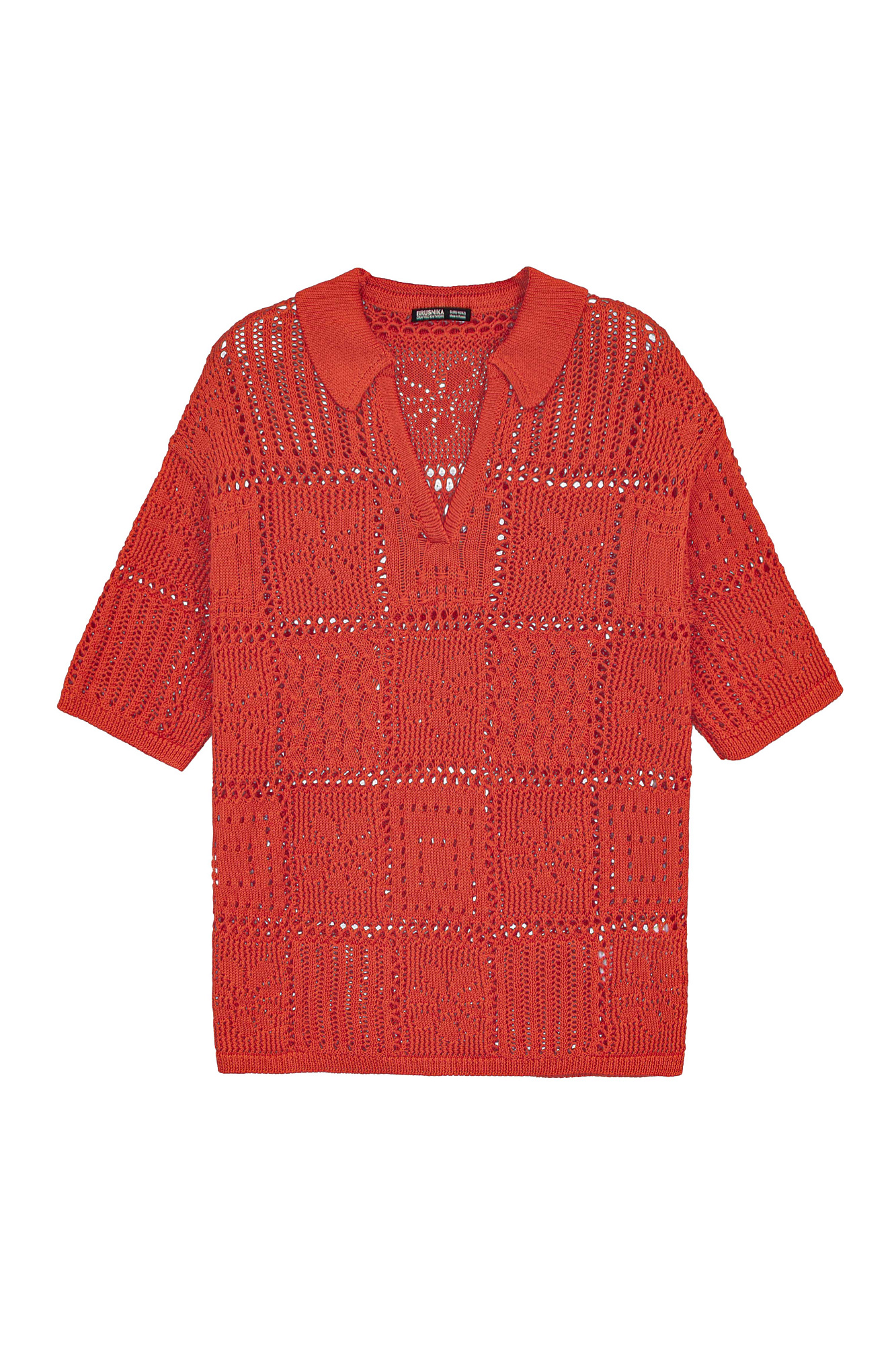 Трикотажная футболка поло из 100% хлопка. Модель выполнена в стиле пэчворк. Изделие прямого кроя, с коротким рукавом, отложным воротником и V-образным вырезом горловины.