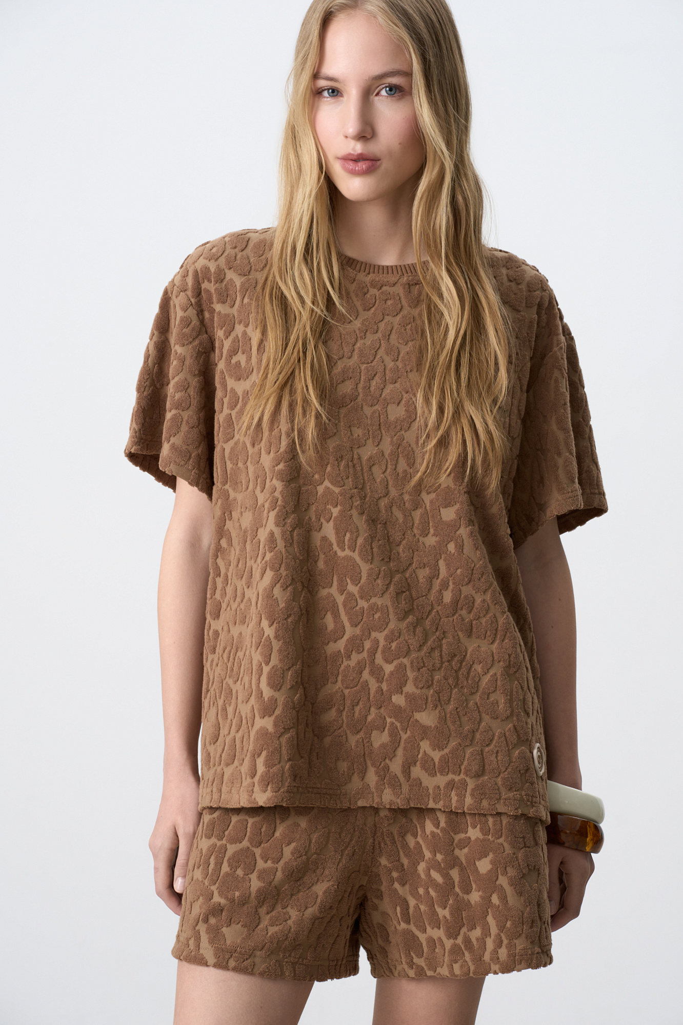 Длинная футболка из махрового трикотажа. Модель свободного силуэта со спущенной линией плеча. Дополнить образ можно шортами в таком же стиле.