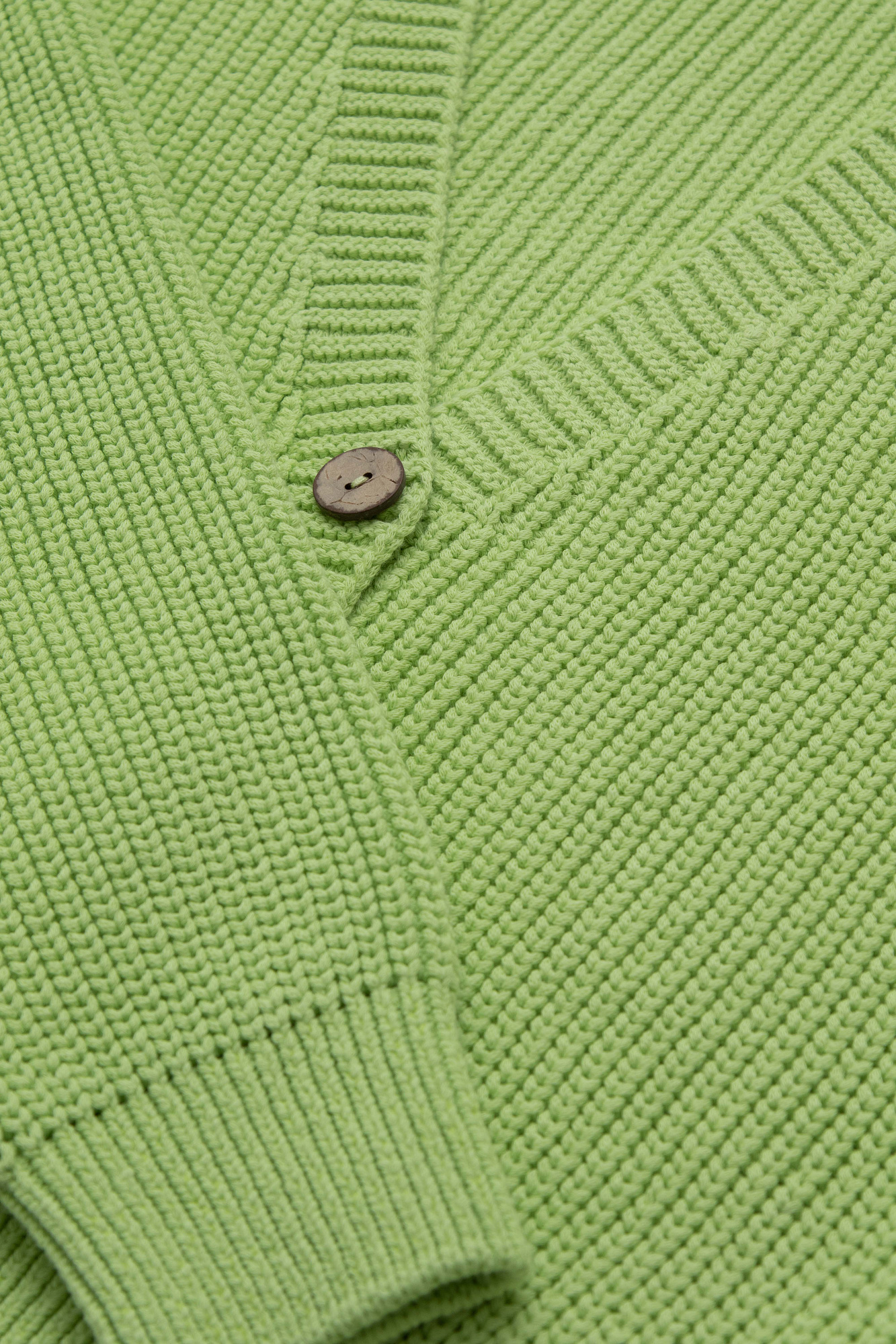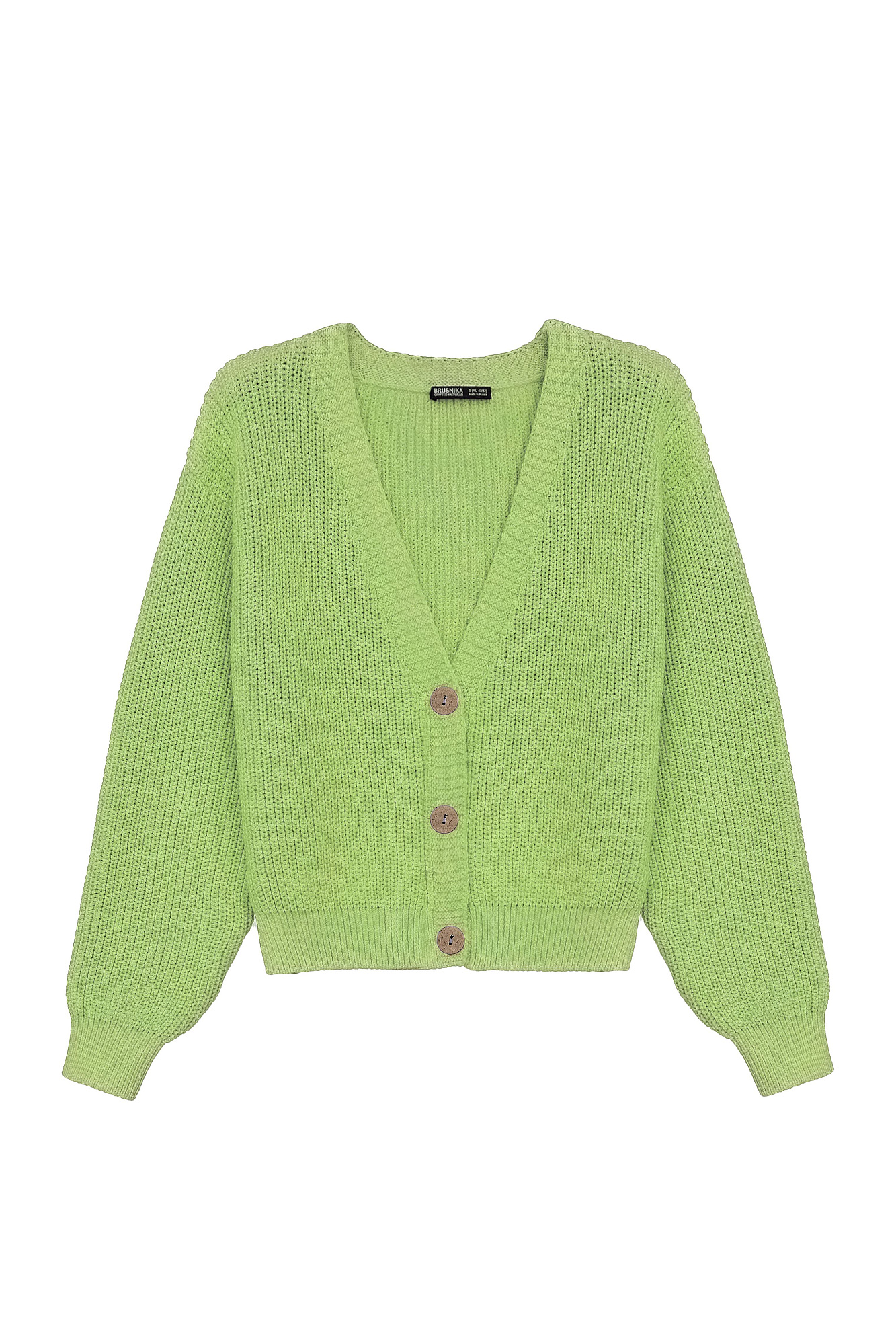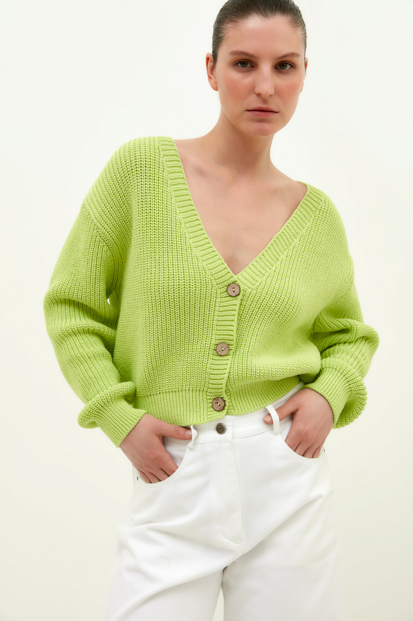 Хлопковый кардиган полуфанг с длинными рукавами. V-образный вырез, низ изделия и манжеты на эластичной ленте в рубчик.