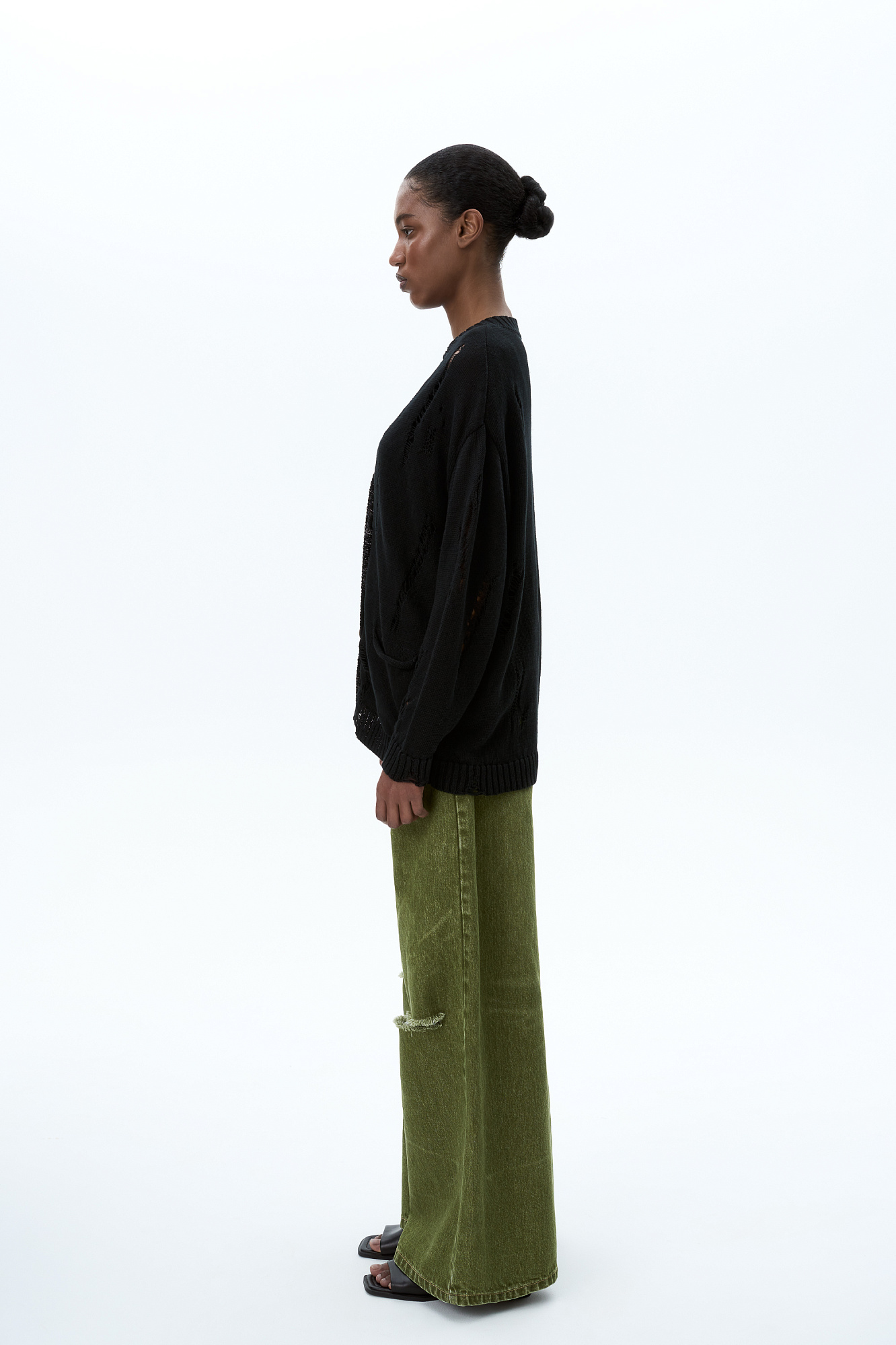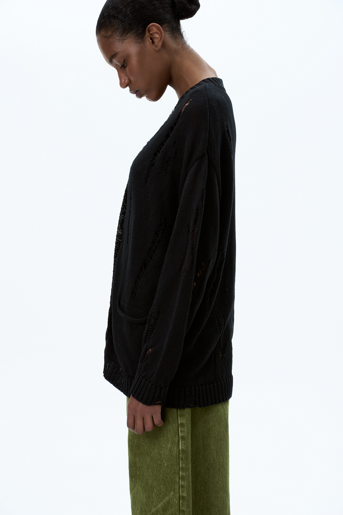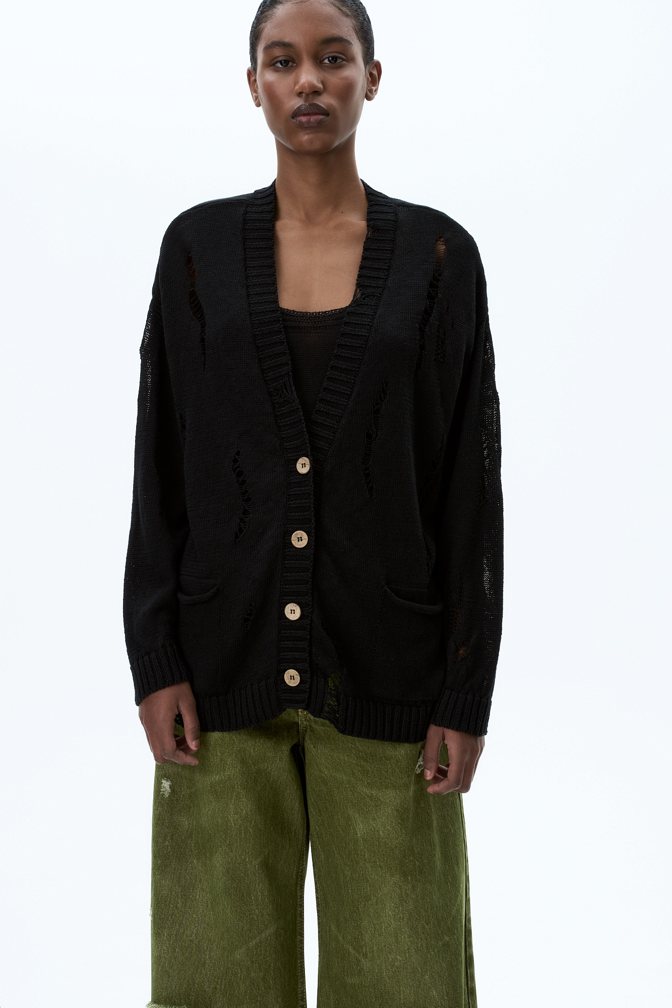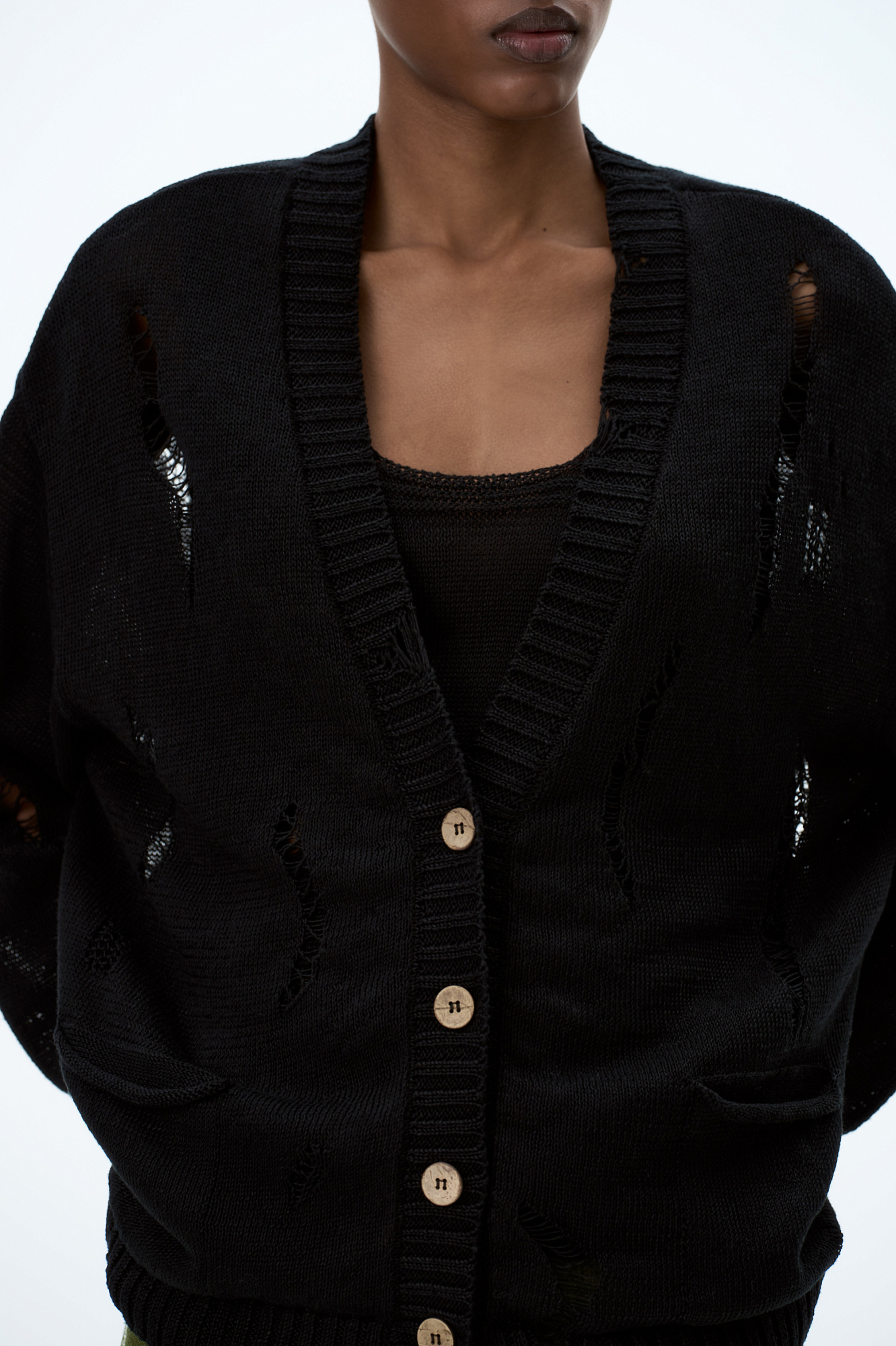 Кардиган из 100% льна с рваным узором. Дополнить образ можно топом.