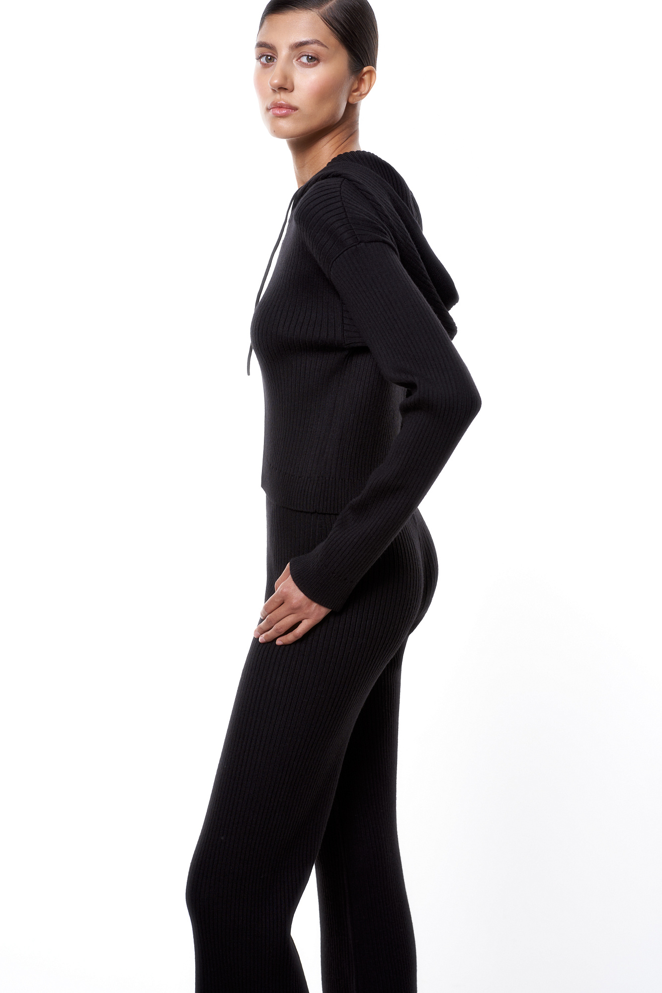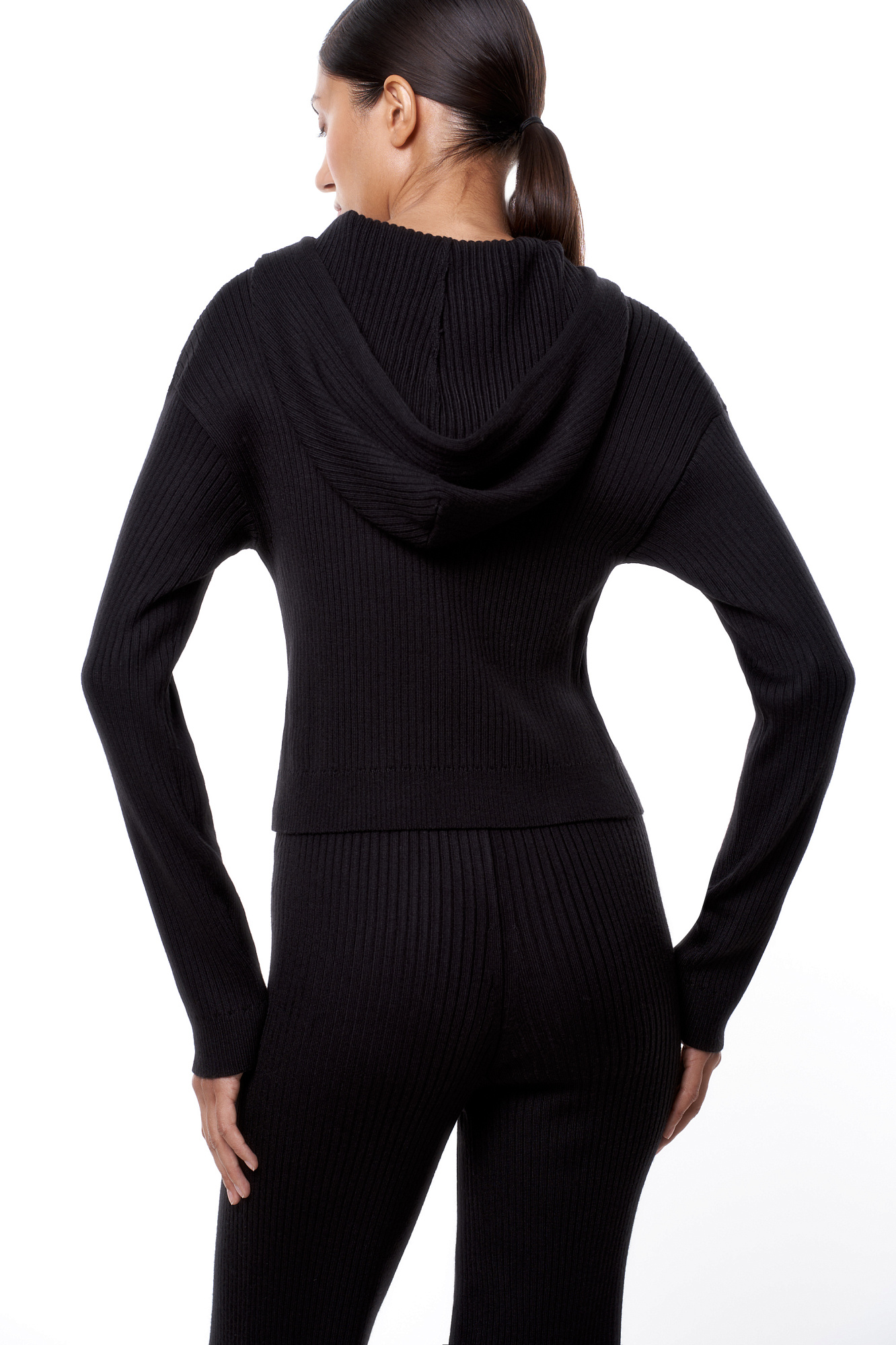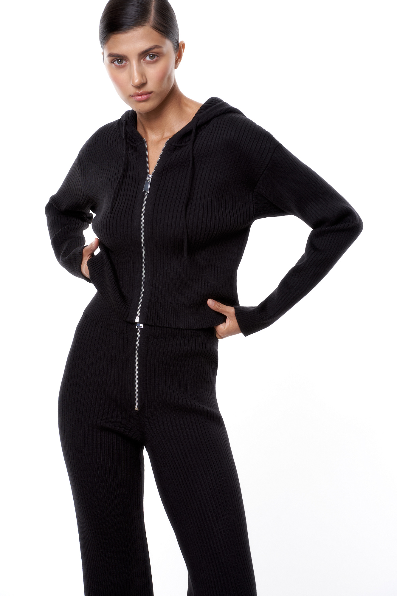 Трикотажный бомбер в рубчик. Модель приталенного силуэта, с длинными рукавами, спущенной линией плеч и капюшоном на кулиске. Застежка на молнию.