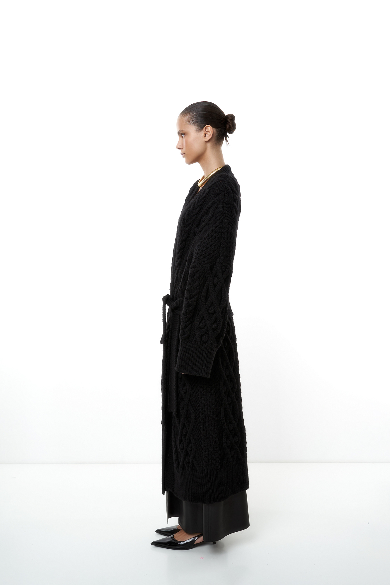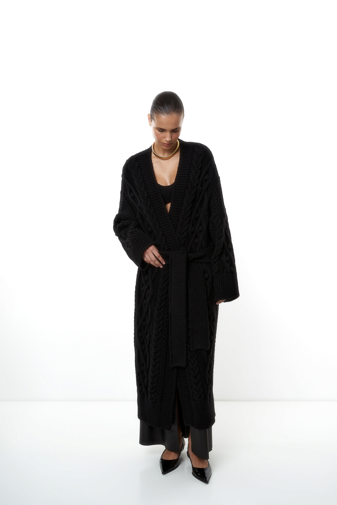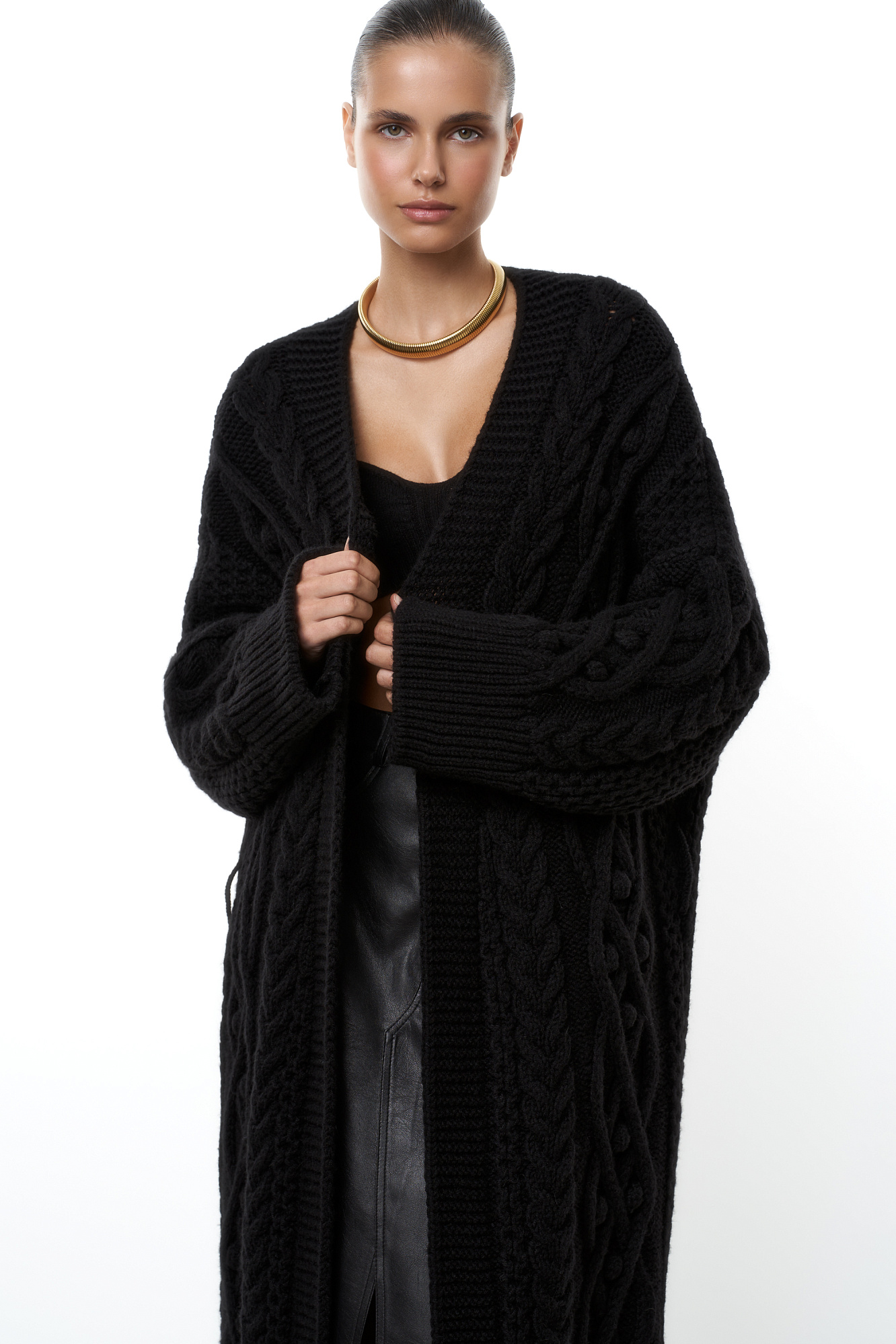 Длинный трикотажный кардиган с рельефным узором и широким поясом. Модель свободного силуэта со спущенным плечом и широкими манжетами. Края изделия в рубчик.