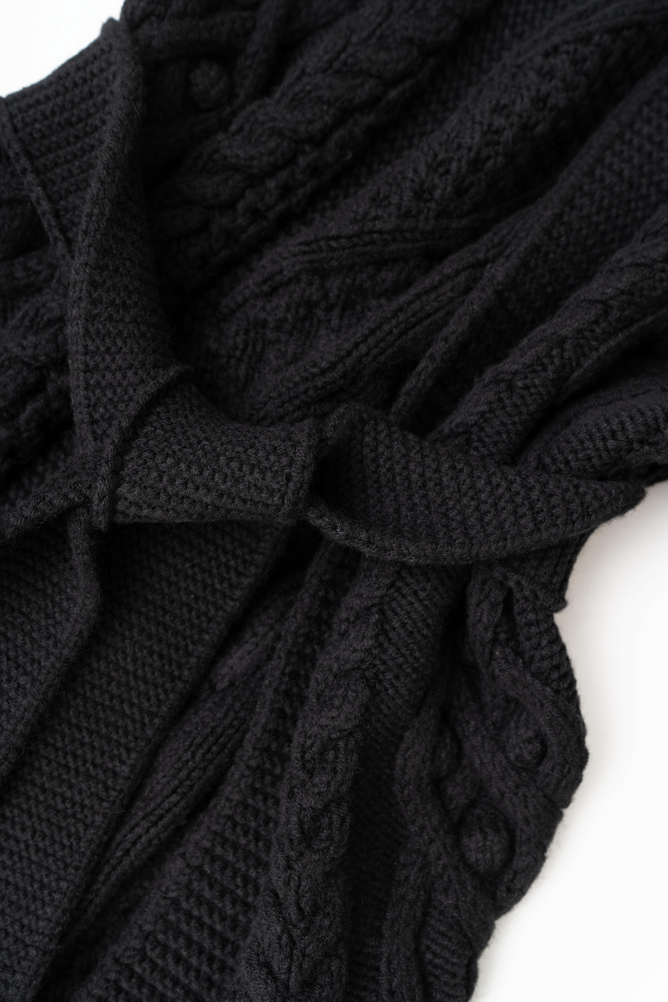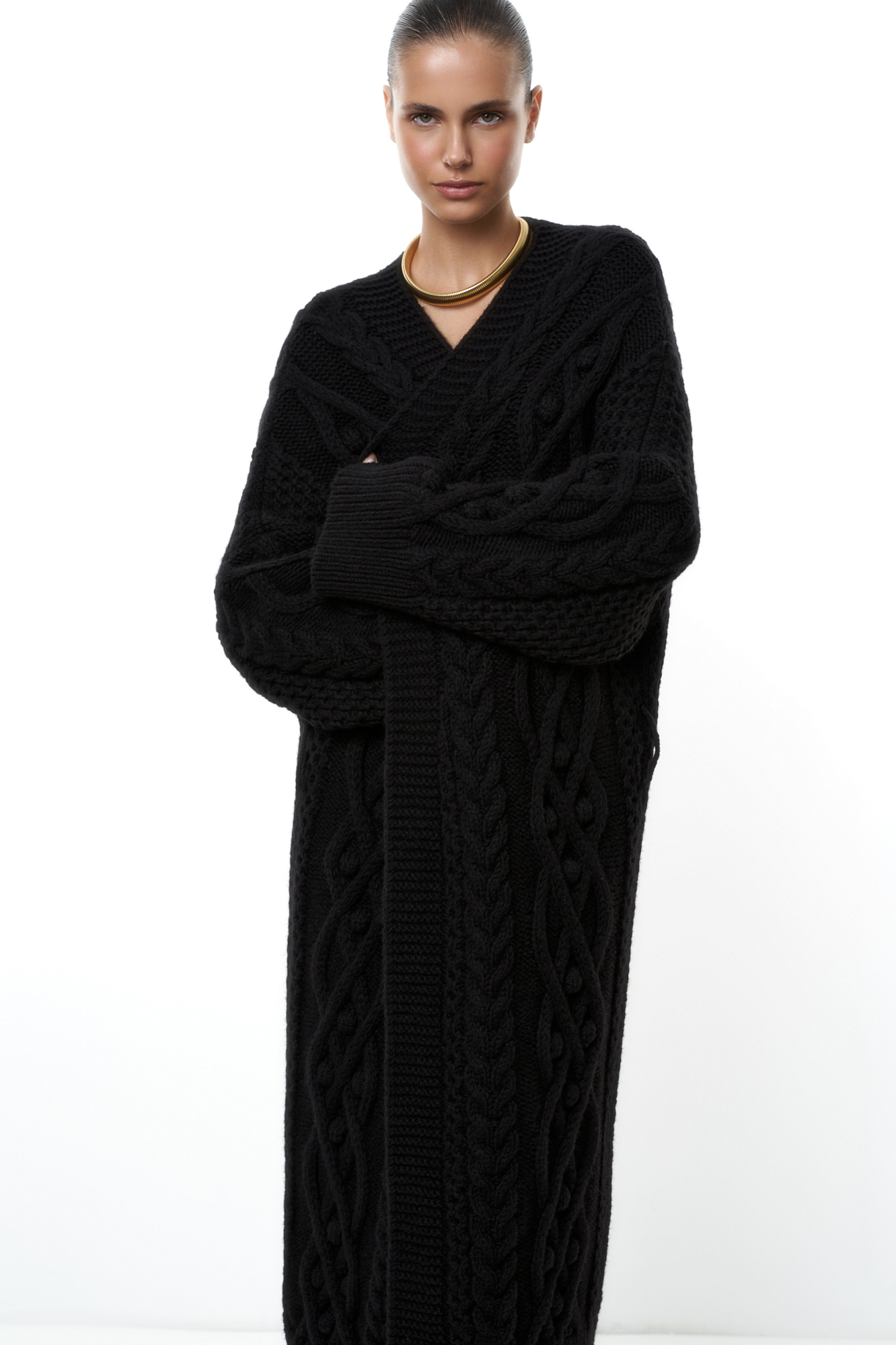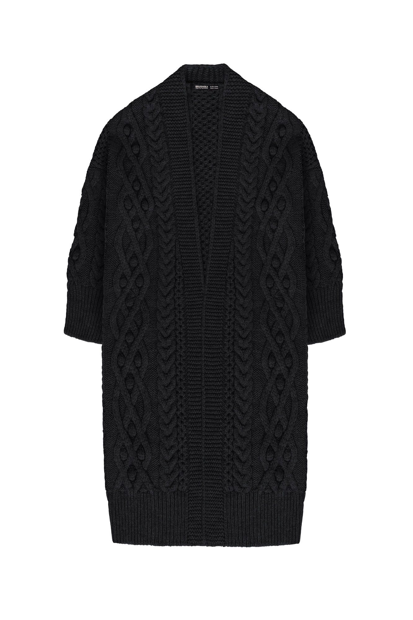 Длинный трикотажный кардиган с рельефным узором и широким поясом. Модель свободного силуэта со спущенным плечом и широкими манжетами. Края изделия в рубчик.