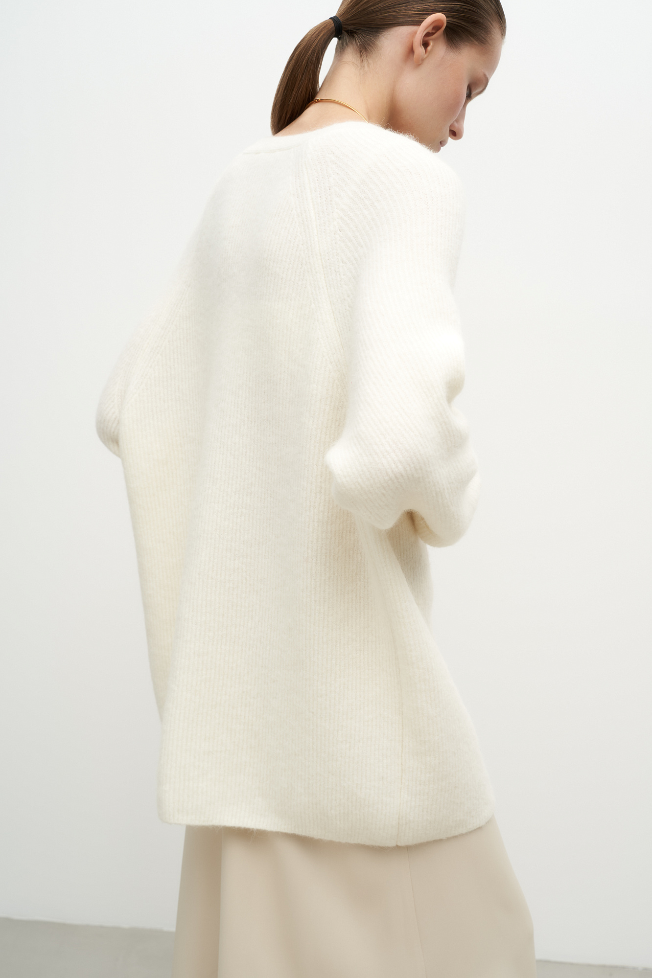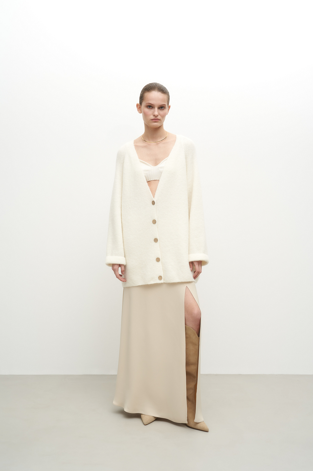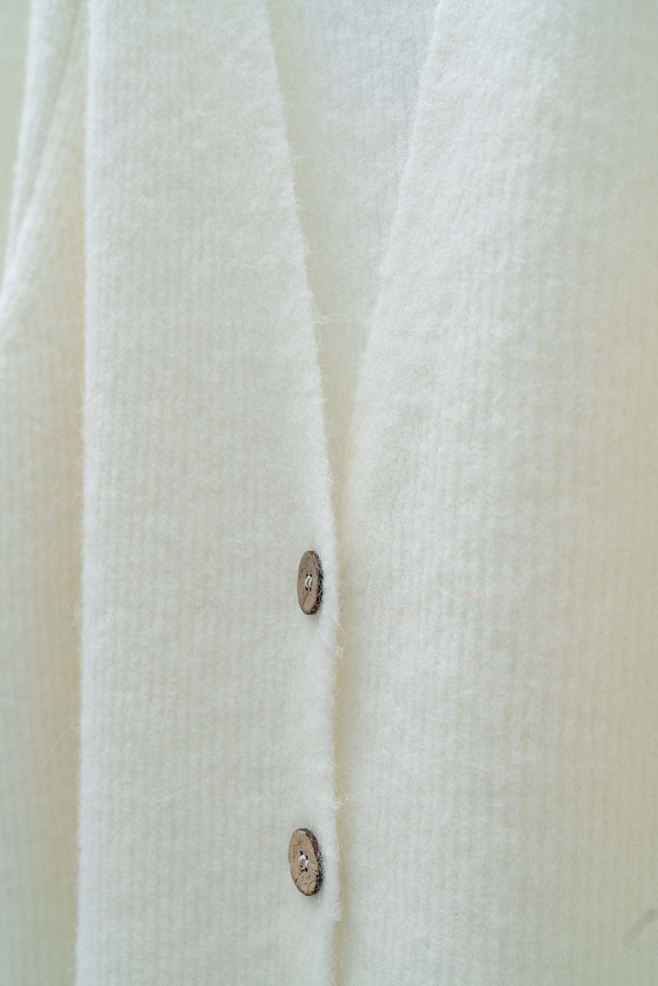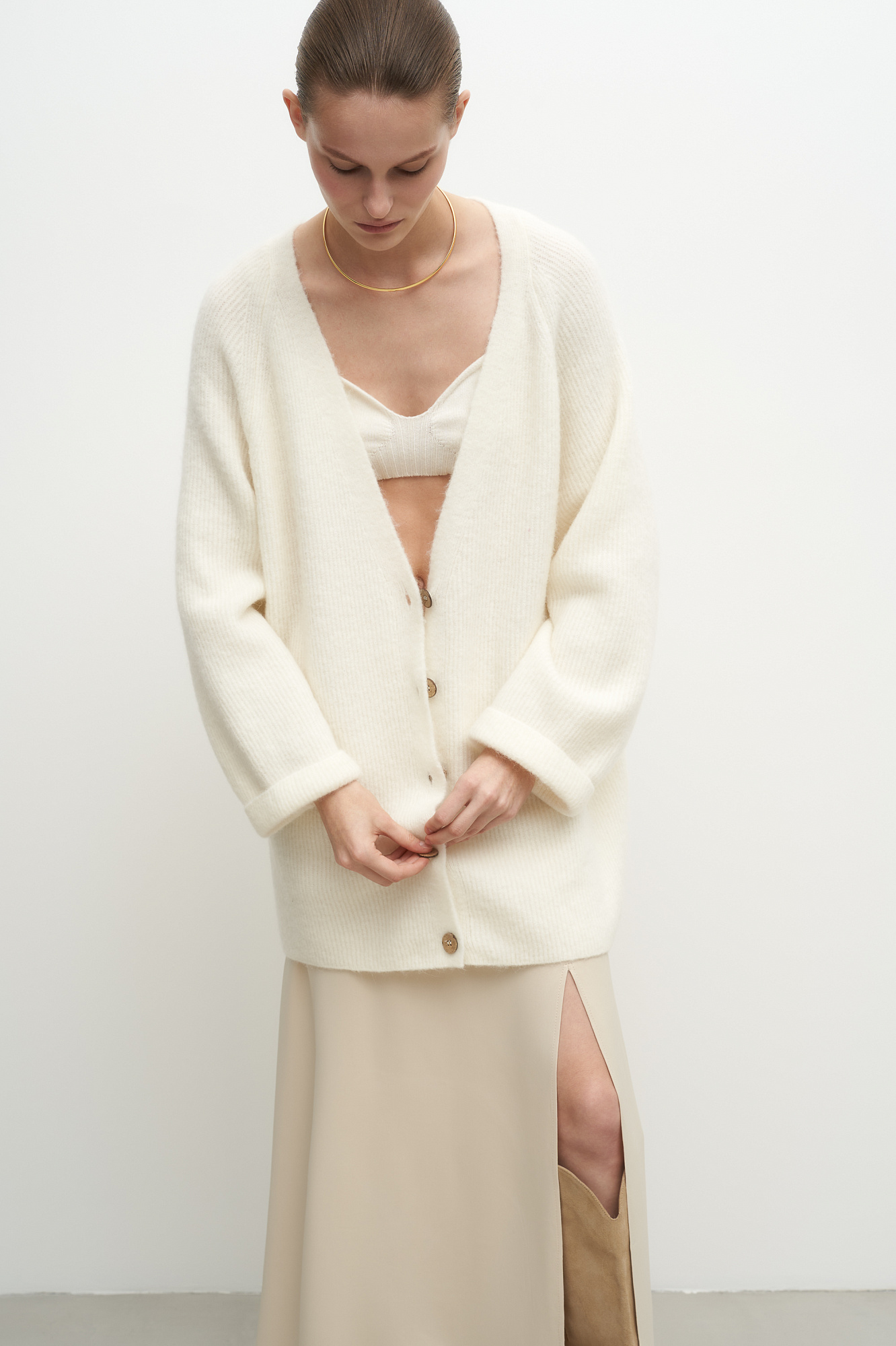 Трикотажный кардиган из шерсти альпака. Модель свободного силуэта со спущенным плечом. Застежка на пуговицы.