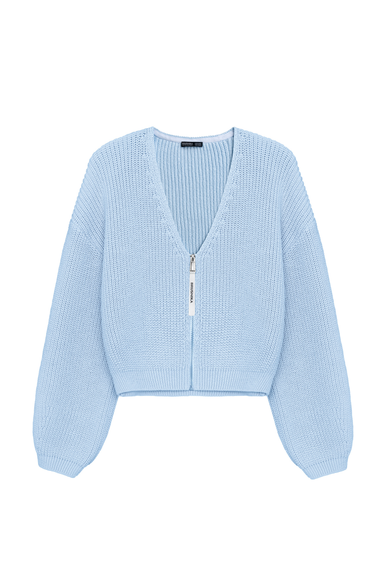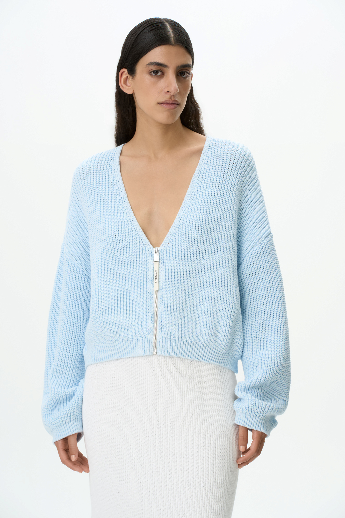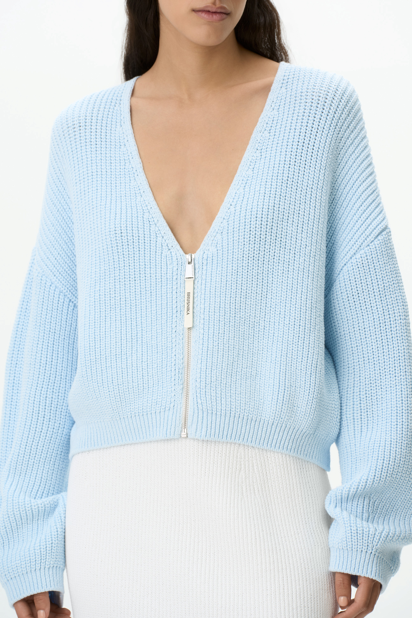 Трикотажный кардиган из 100% хлопка. Модель укороченного силуэта, со спущенной линией плеч, V-вырезом и застежкой на молнию.