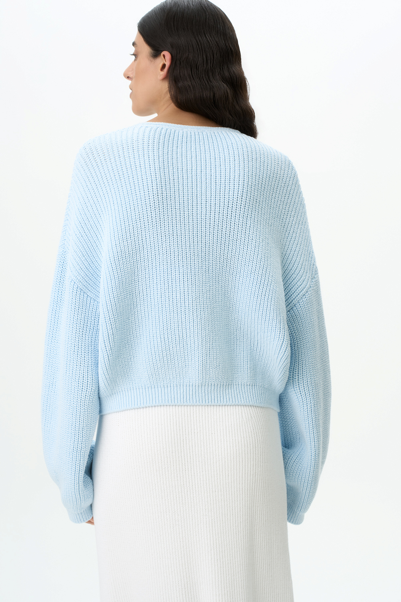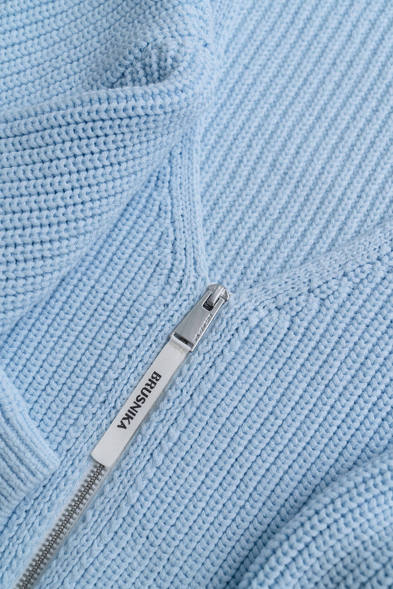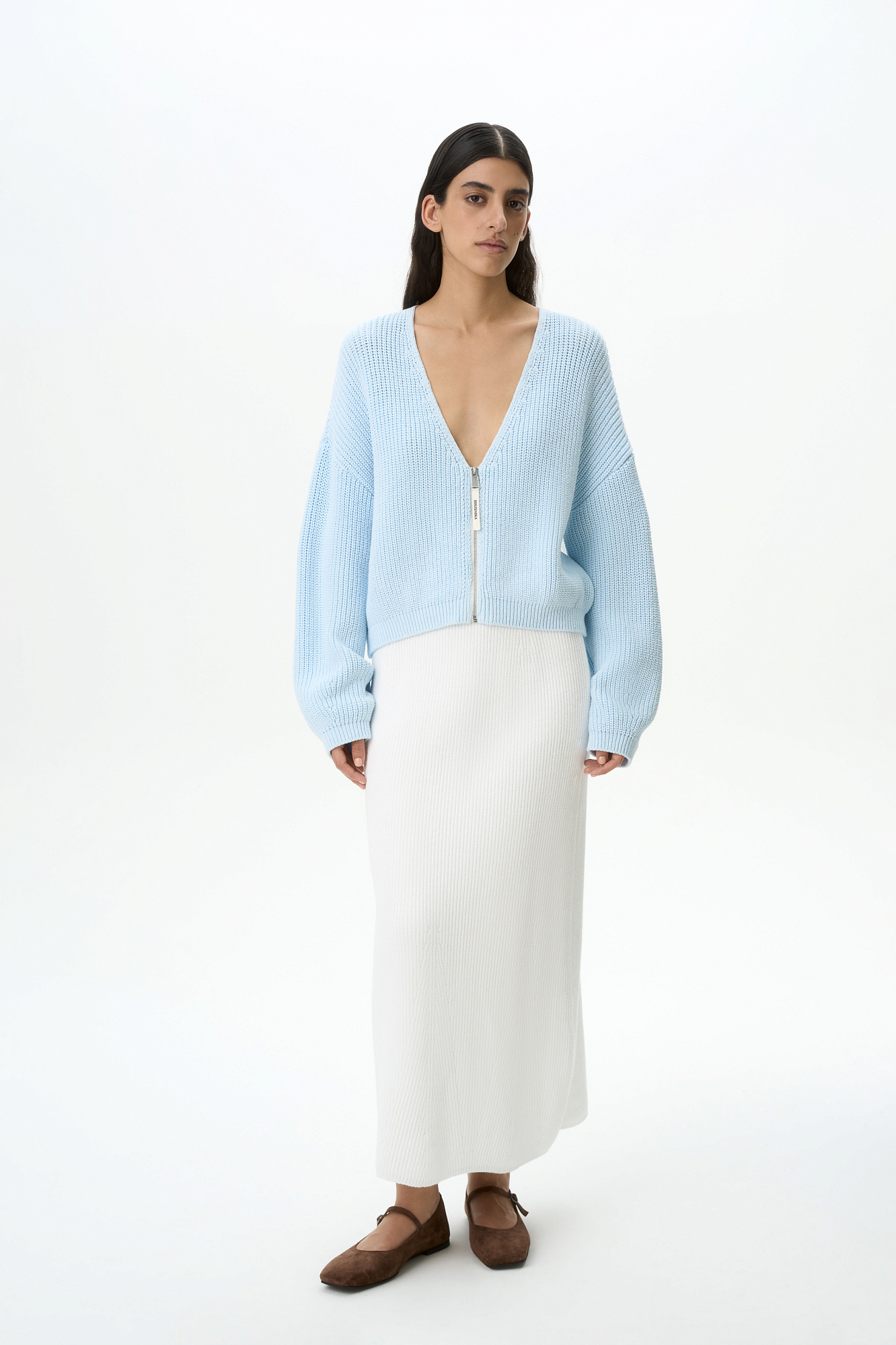 Трикотажный кардиган из 100% хлопка. Модель укороченного силуэта, со спущенной линией плеч, V-вырезом и застежкой на молнию.