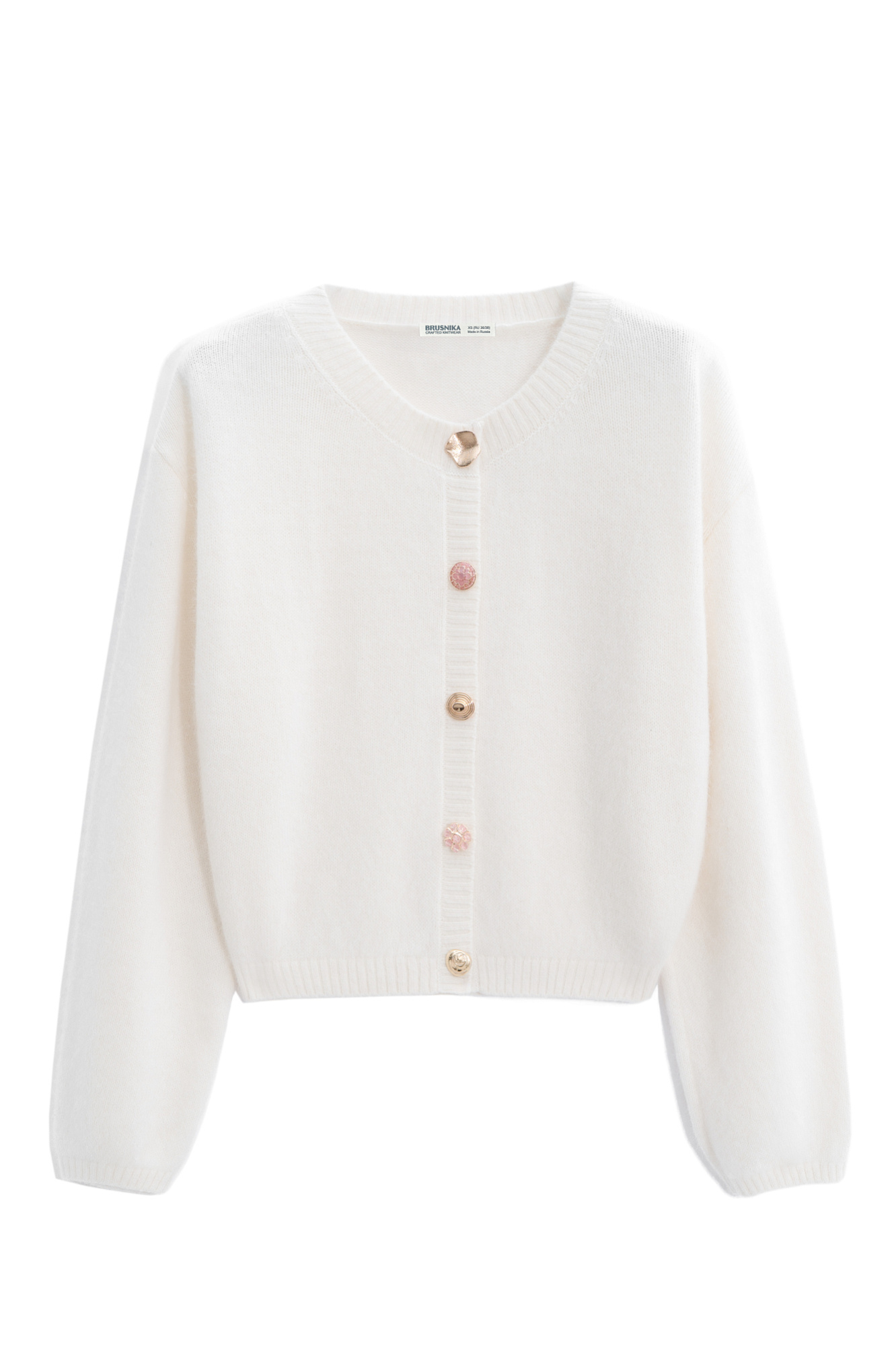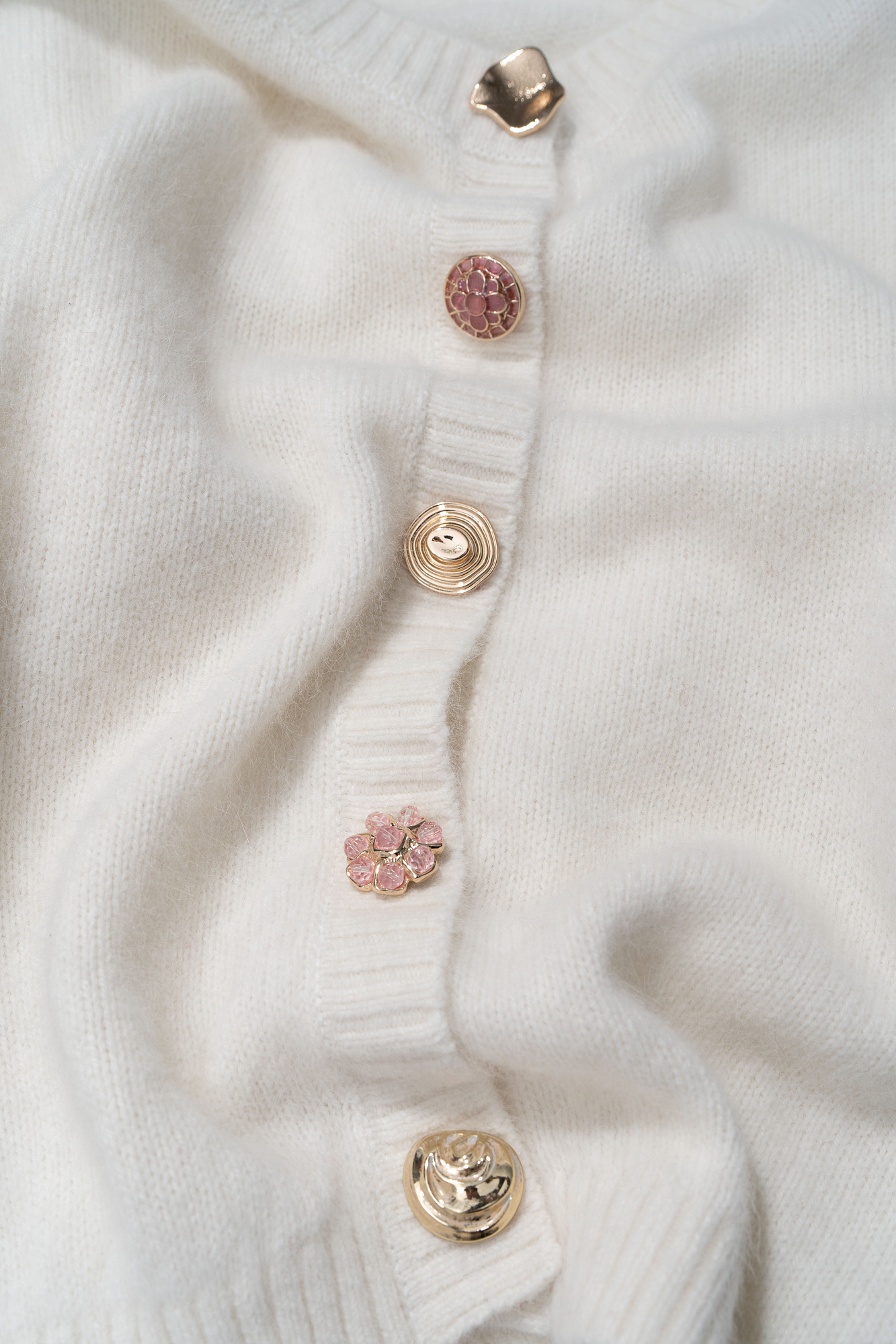 Трикотажный кардиган из пуха лисы. Модель свободного силуэта со спущенной линией плеч и круглым вырезом горловины. Изделие декорировано крупными акцентными пуговицами.