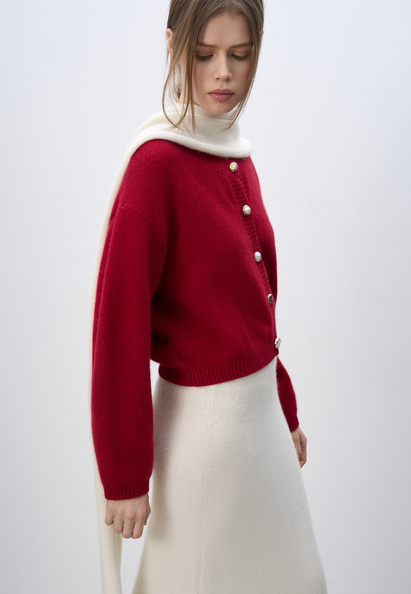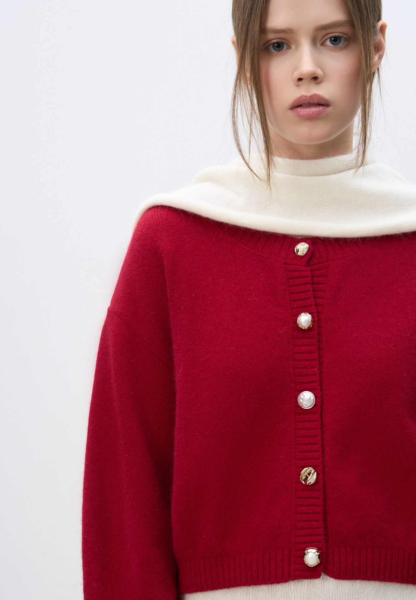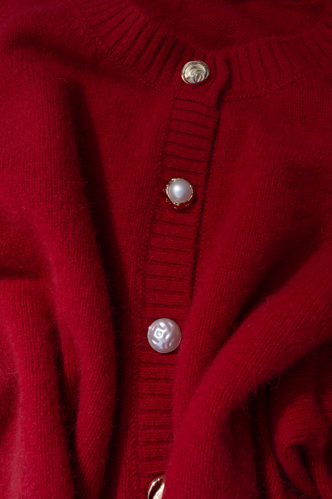 Трикотажный кардиган из пуха лисы. Модель свободного силуэта со спущенной линией плеч и круглым вырезом горловины. Изделие декорировано крупными акцентными пуговицами.