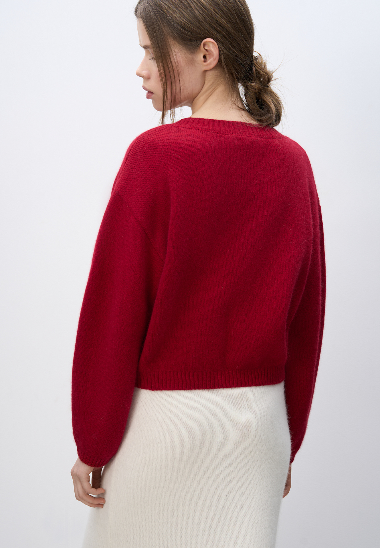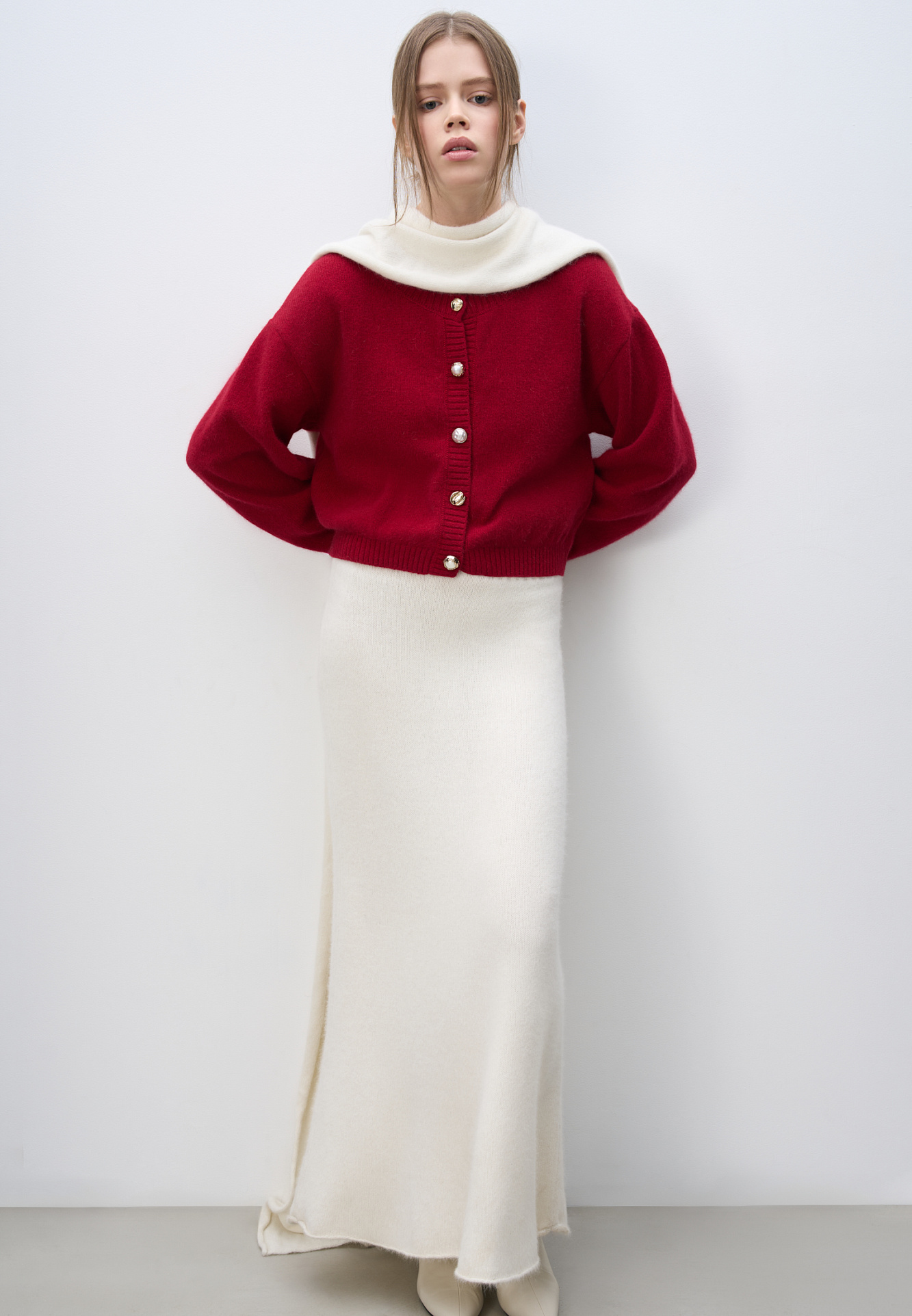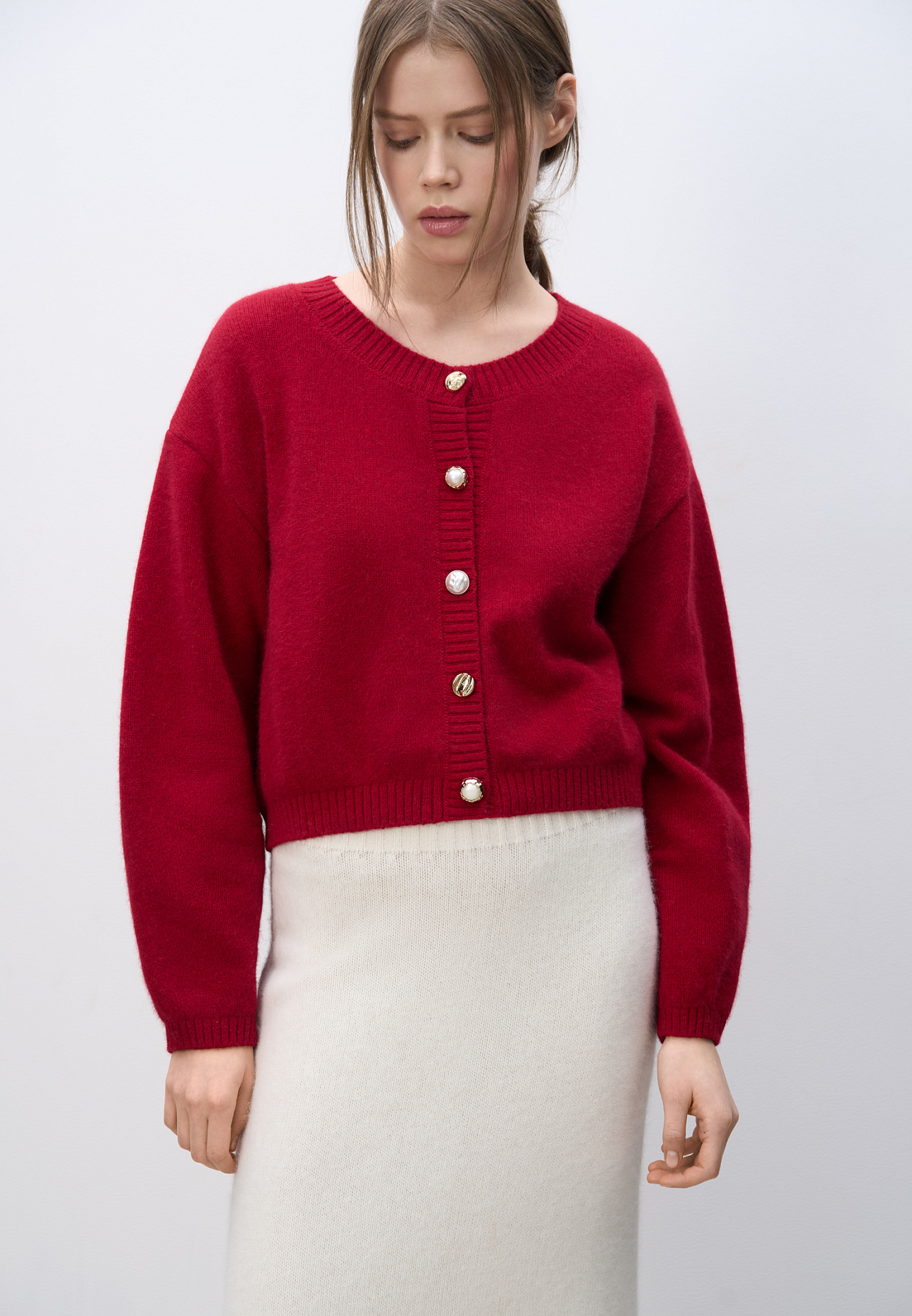 Трикотажный кардиган из пуха лисы. Модель свободного силуэта со спущенной линией плеч и круглым вырезом горловины. Изделие декорировано крупными акцентными пуговицами.