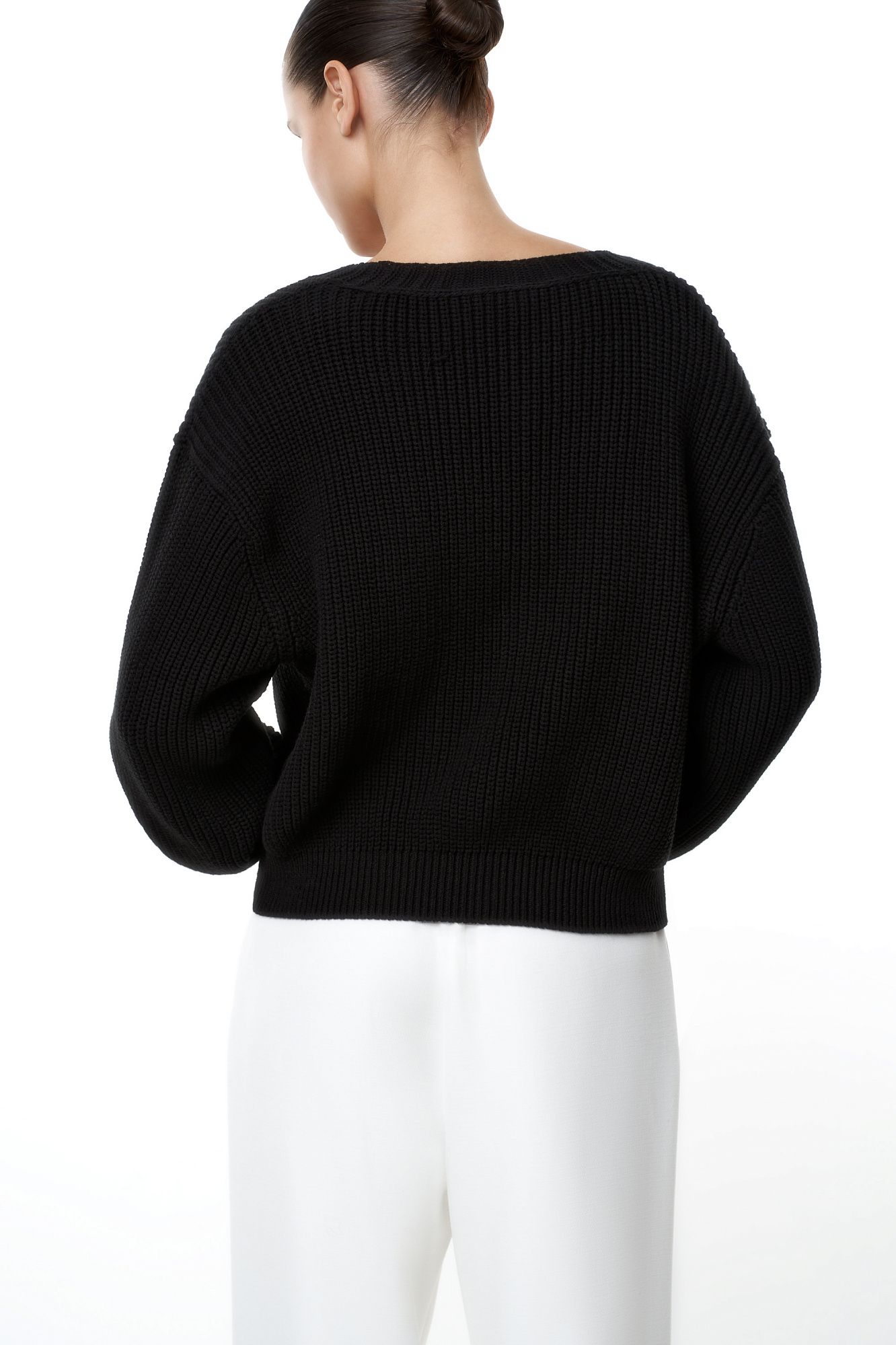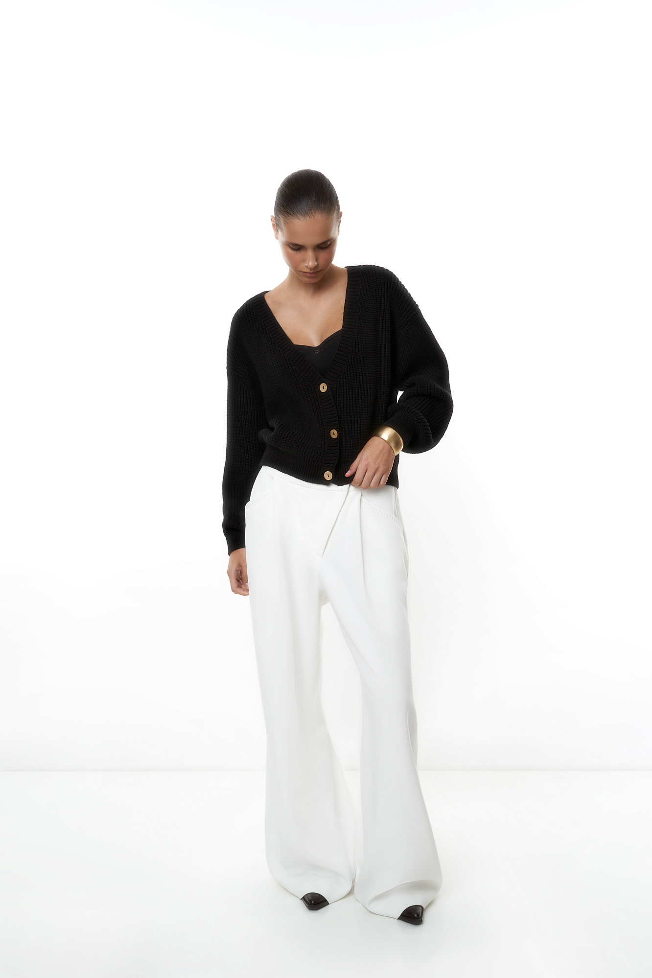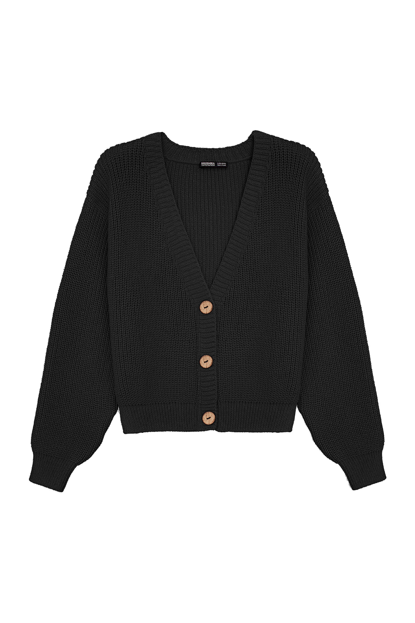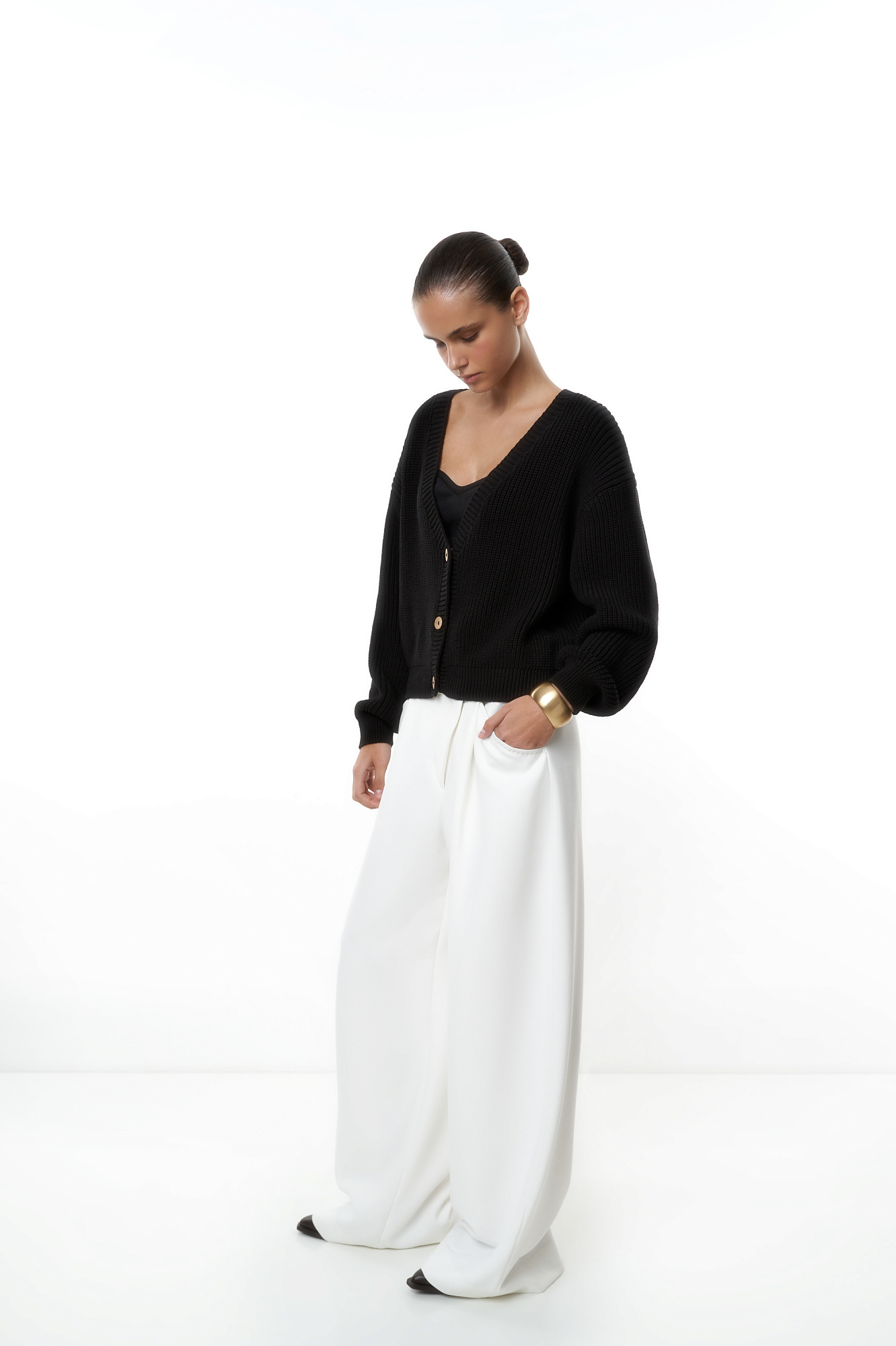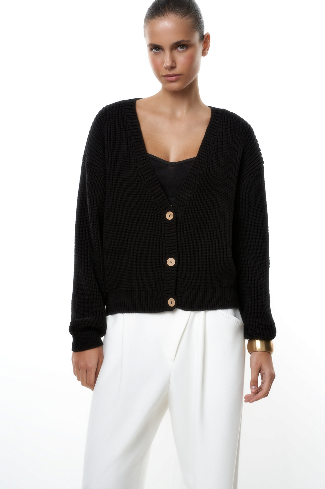 Хлопковый кардиган полуфанг с длинными рукавами. V-образный вырез, низ изделия и манжеты на эластичной ленте в рубчик.