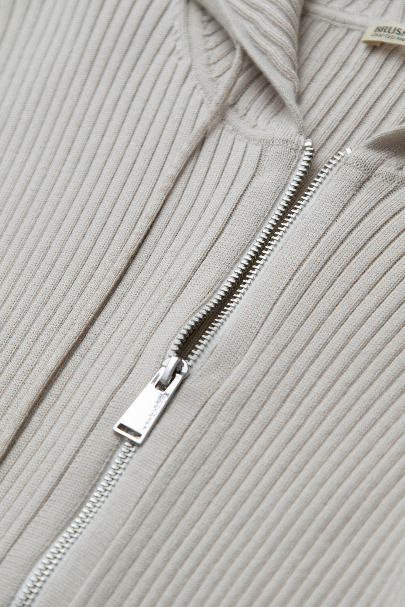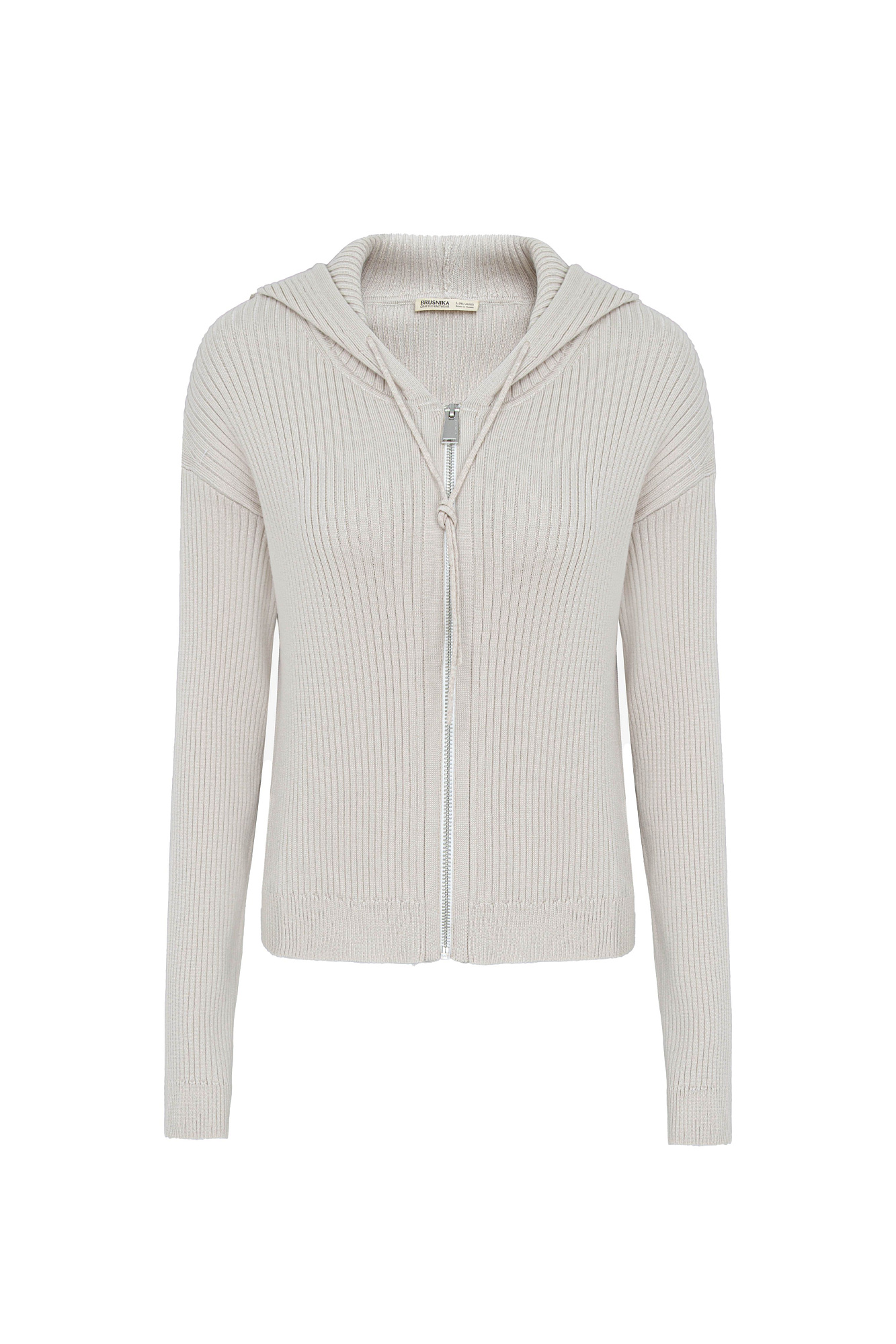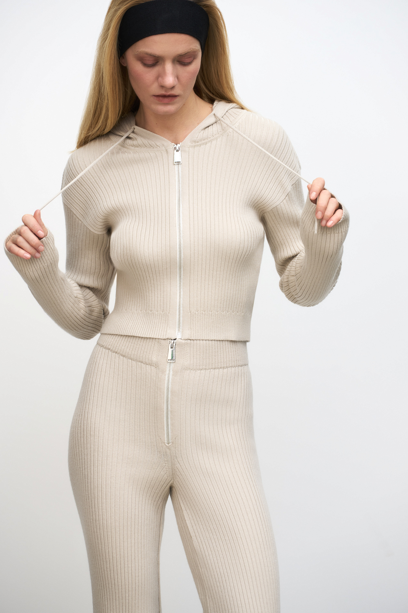 Трикотажный бомбер в рубчик. Модель приталенного силуэта, с длинными рукавами, спущенной линией плеч и капюшоном на кулиске. Застежка на молнию.