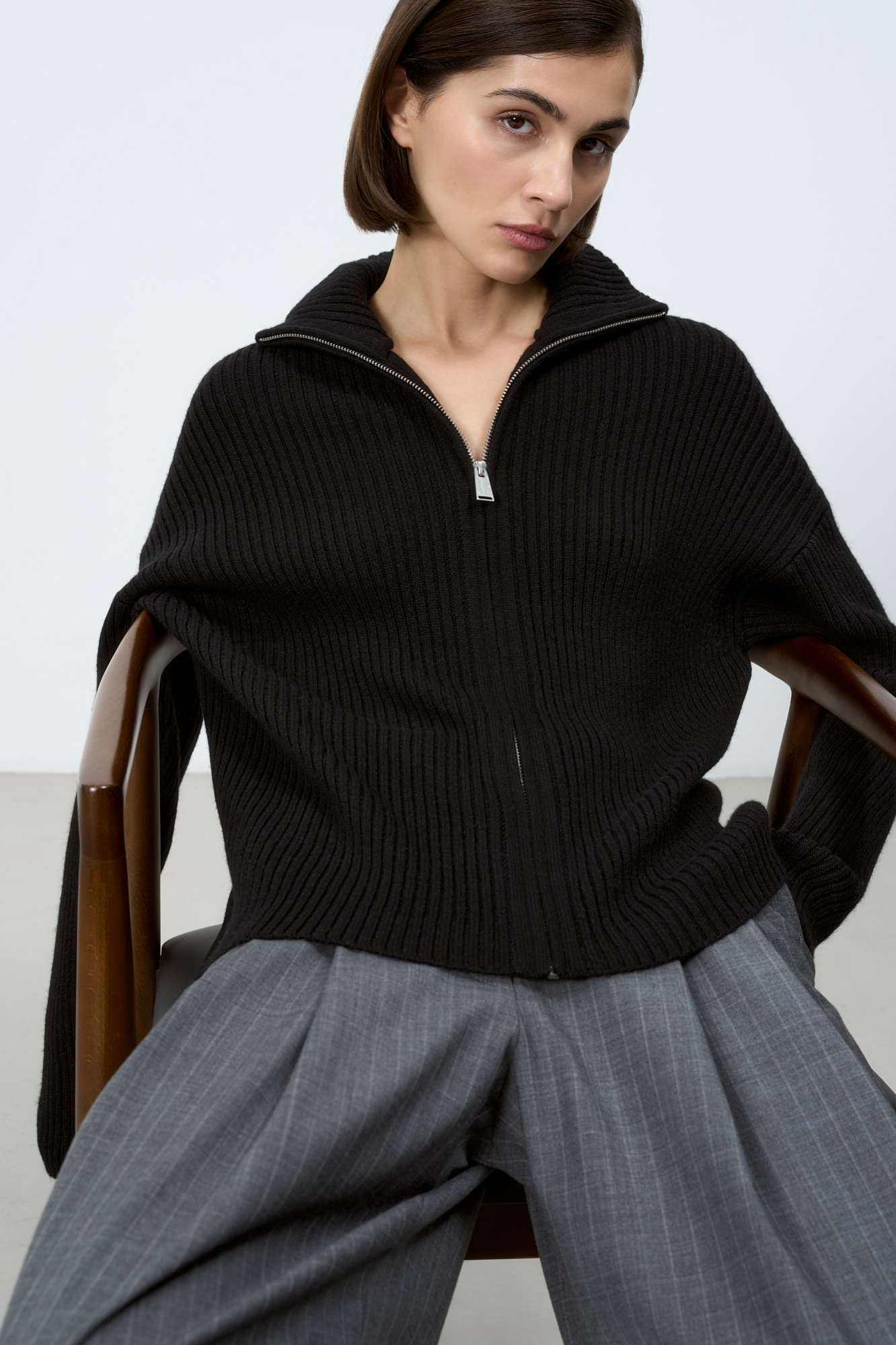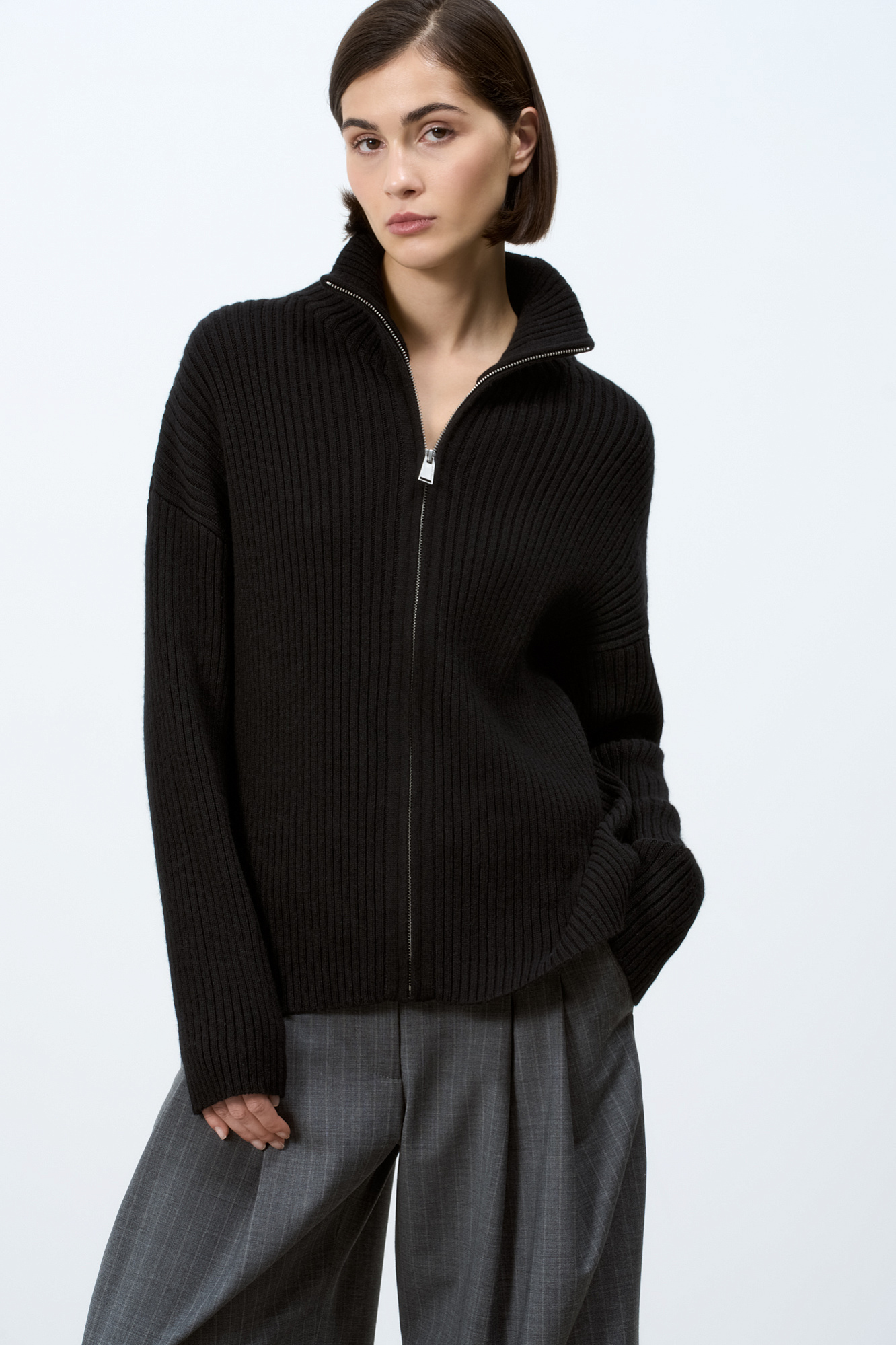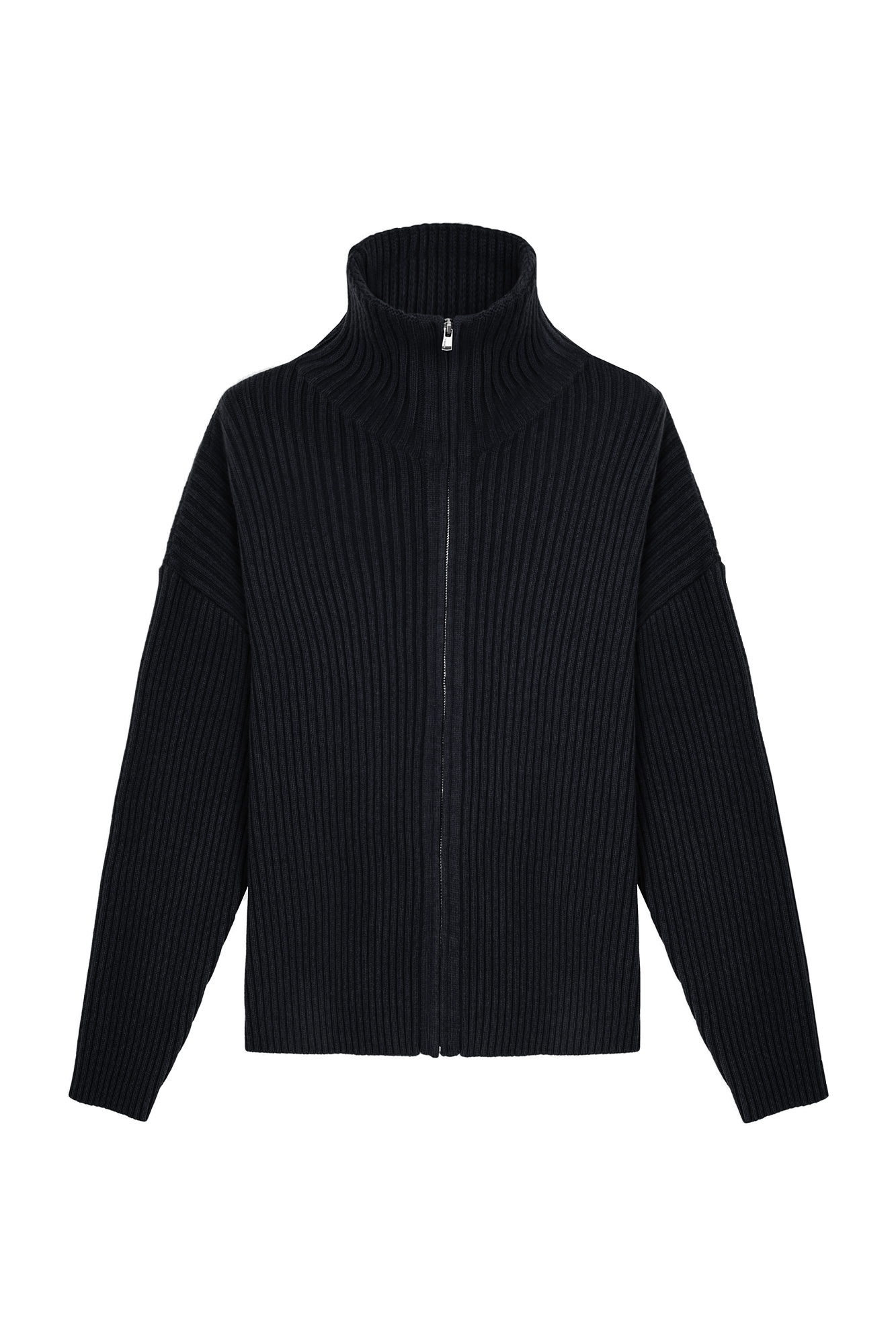 Трикотажный кардиган из смесовой шерсти с добавлением кашемира в рубчик. Модель с длинным рукавом и воротником-стойкой. Застежка на молнию.