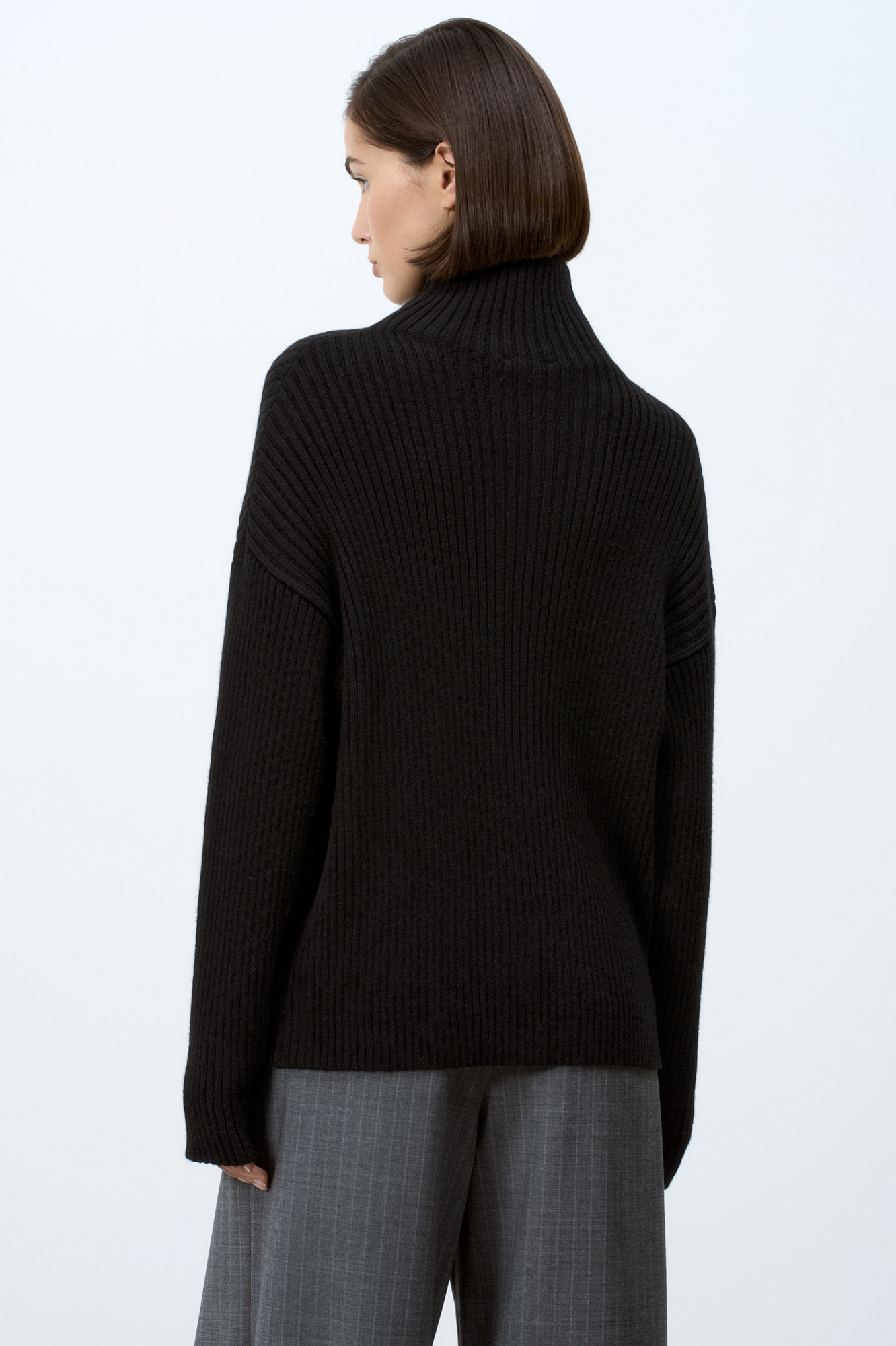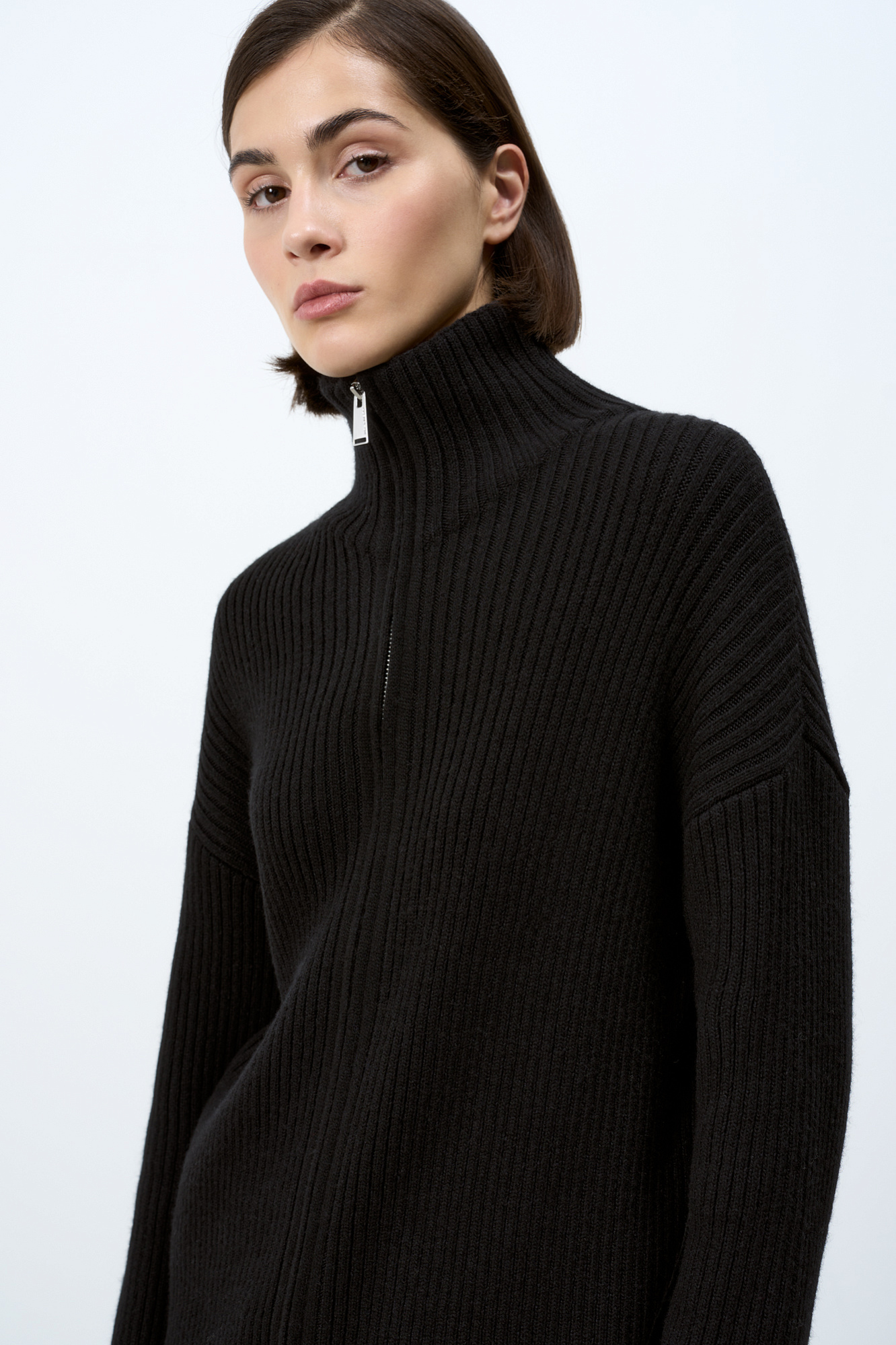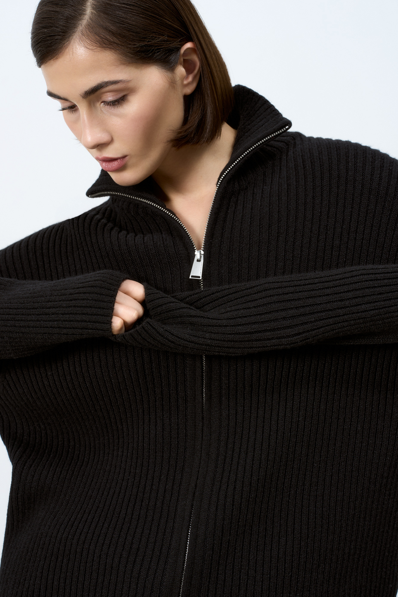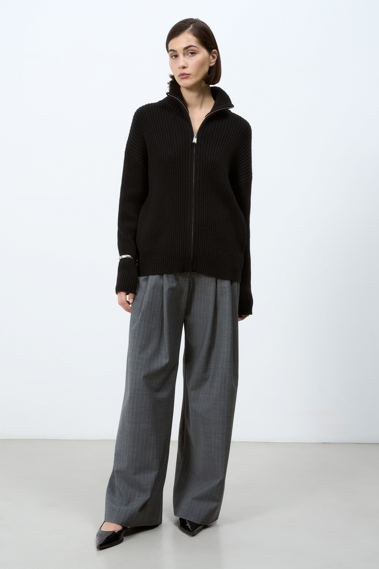 Трикотажный кардиган из смесовой шерсти с добавлением кашемира в рубчик. Модель с длинным рукавом и воротником-стойкой. Застежка на молнию.