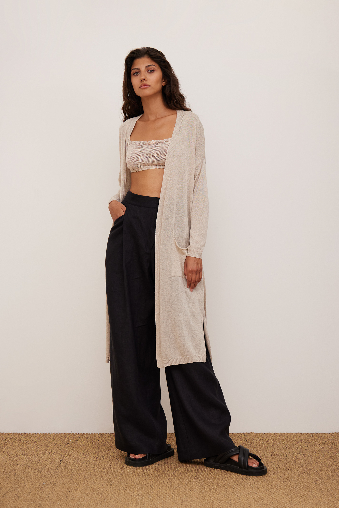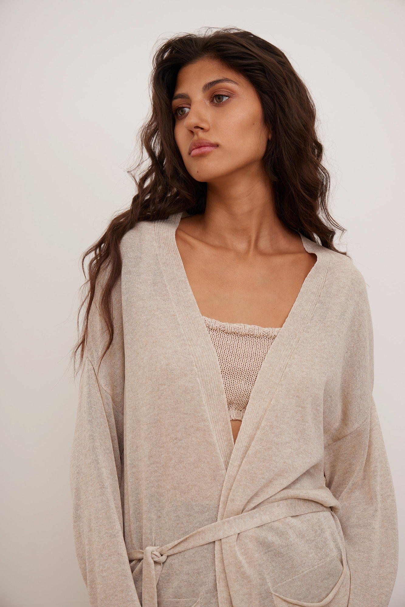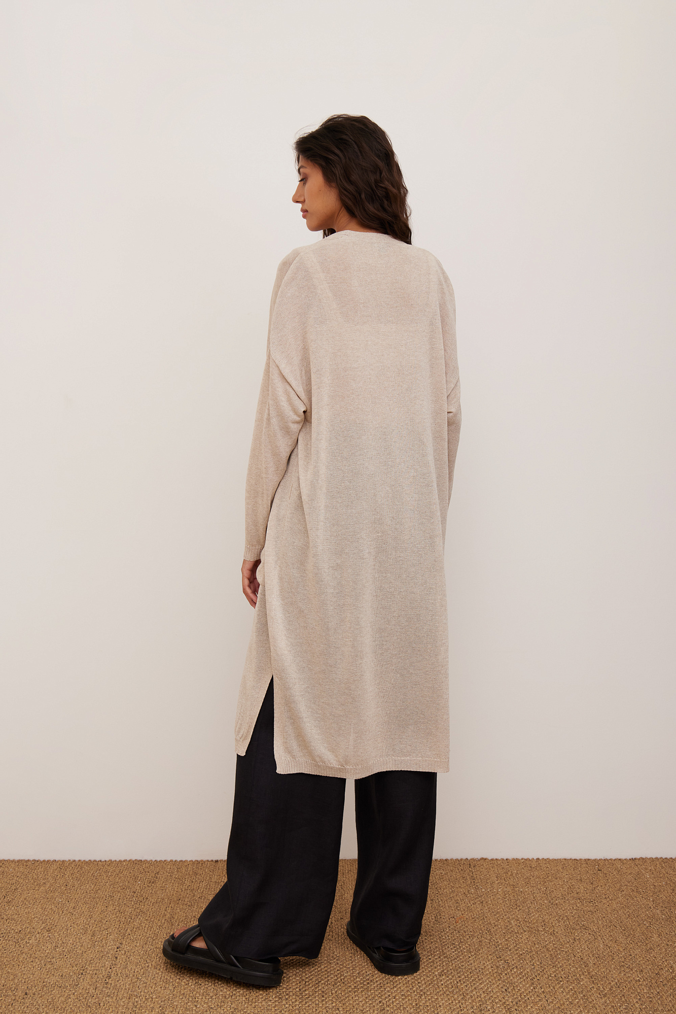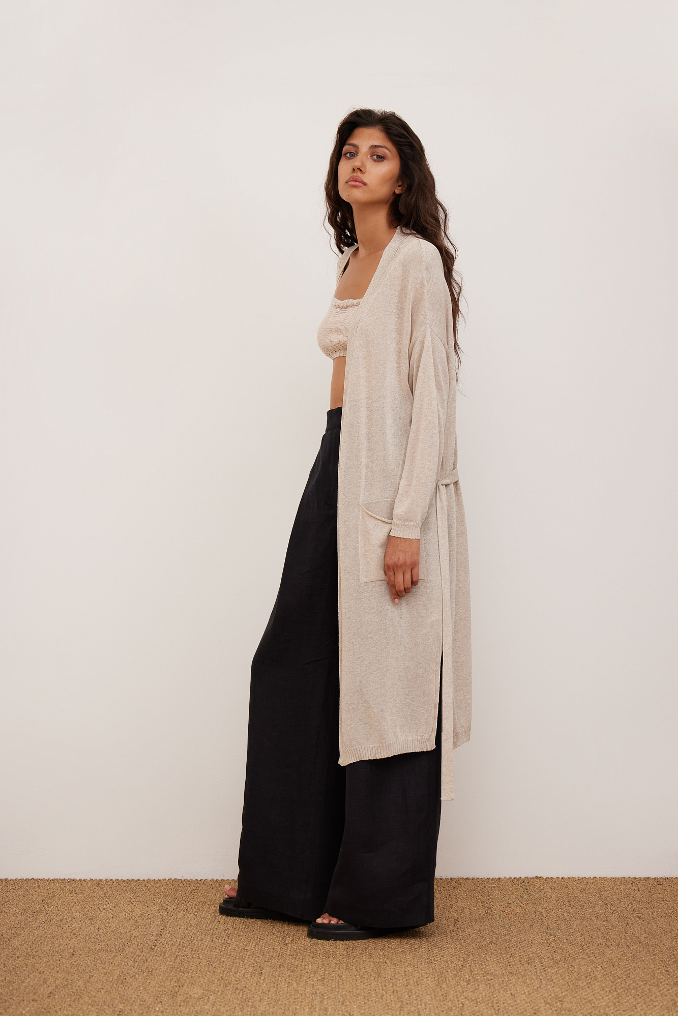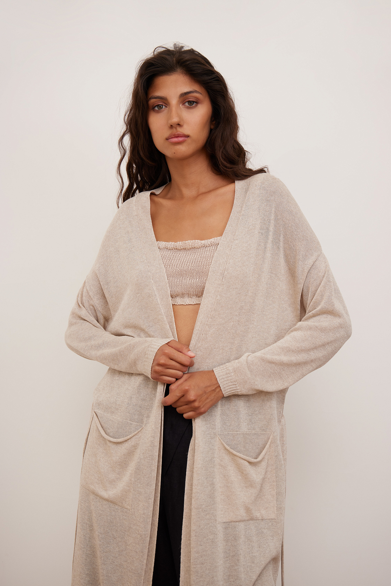 Длинный трикотажный кардиган из вискозы. Модель прямого кроя, с двумя боковыми карманами, шлевками на талии и поясом.