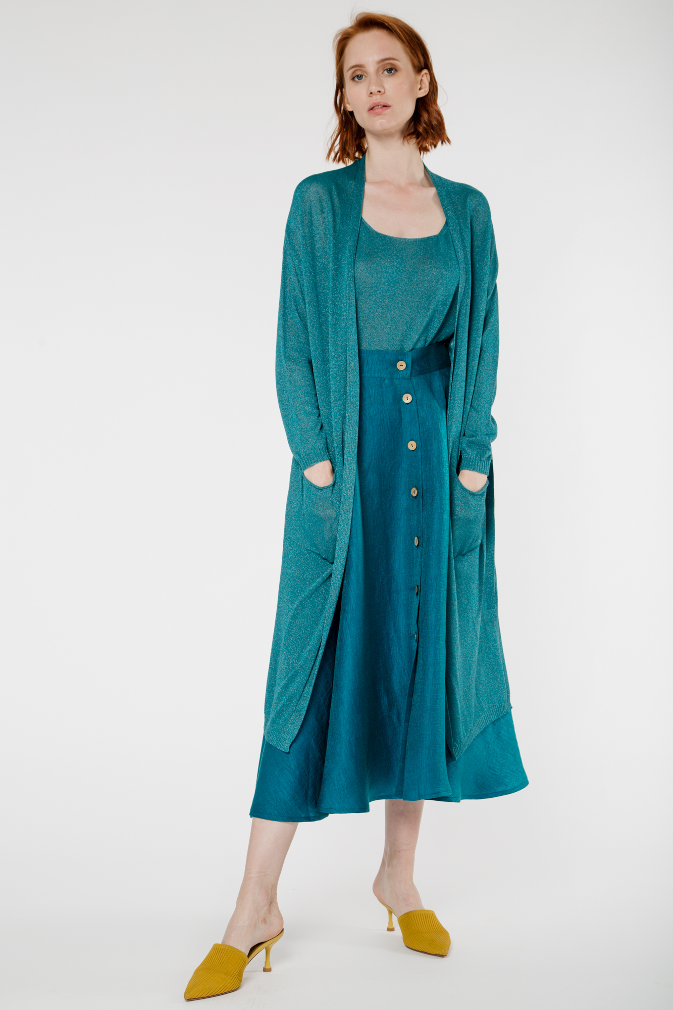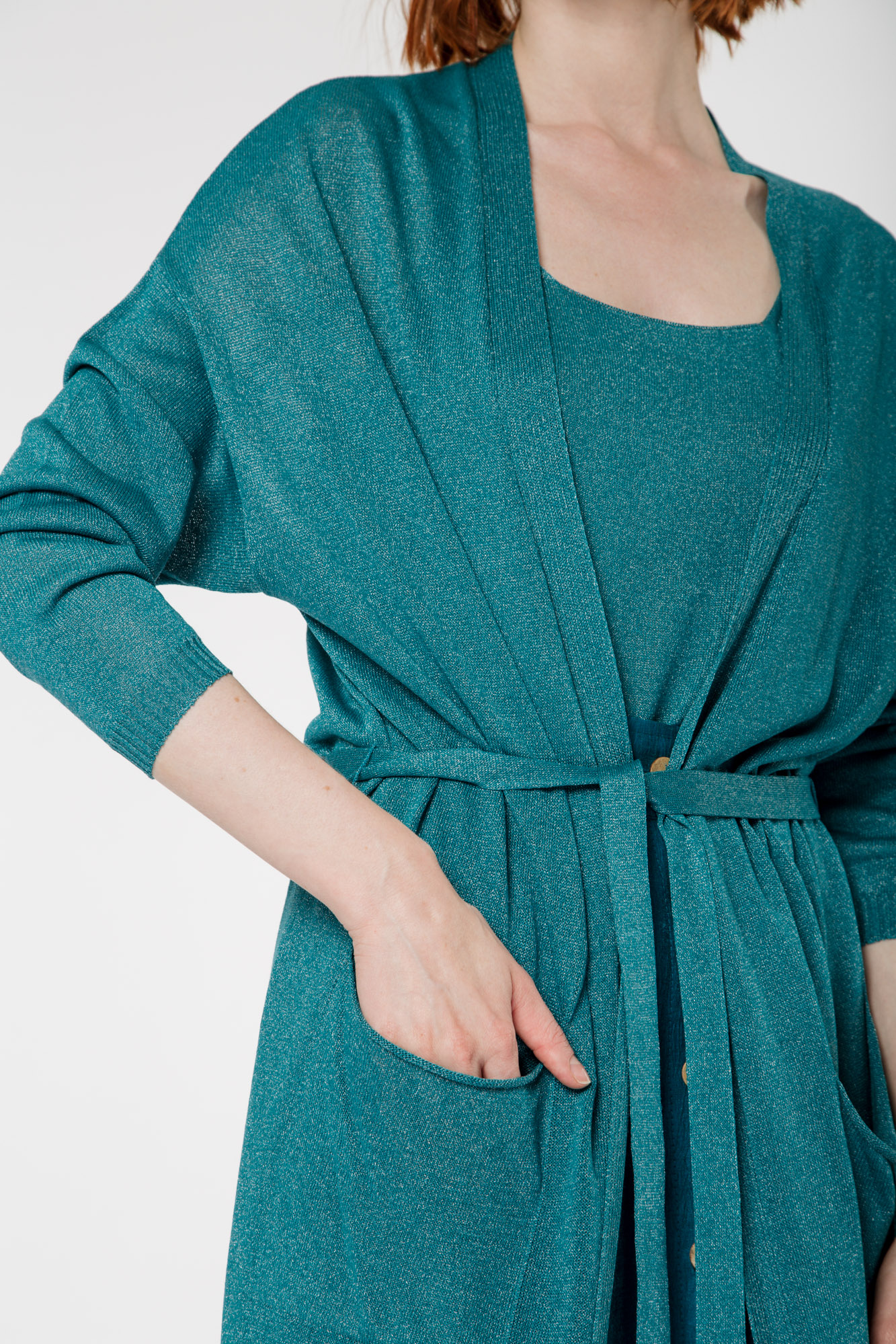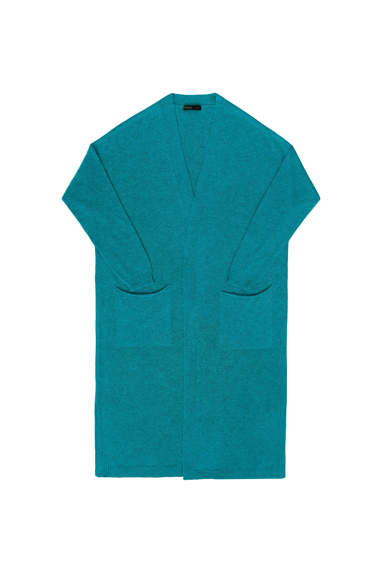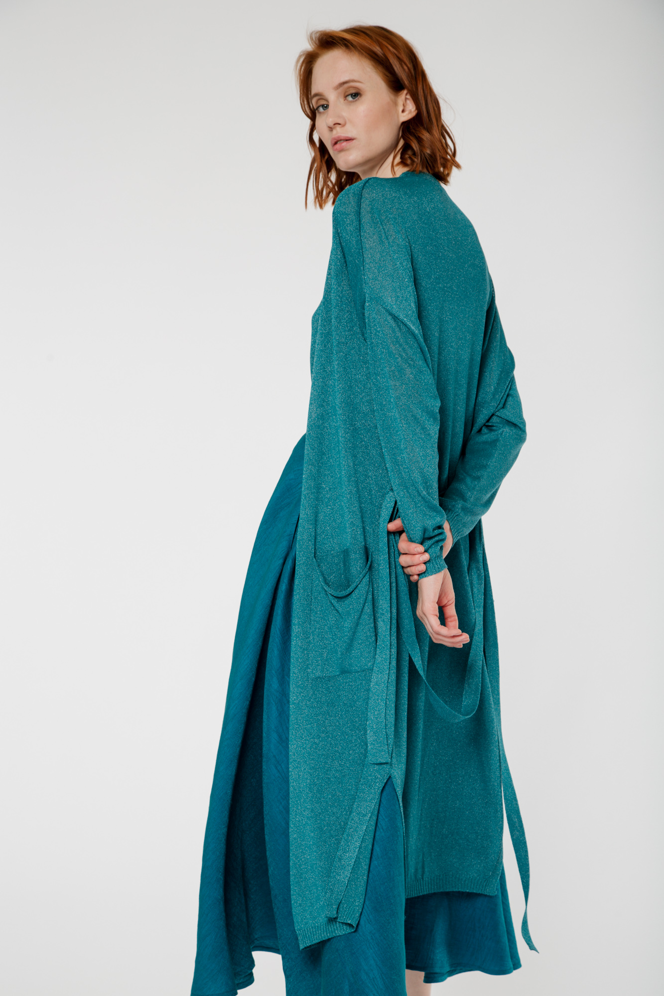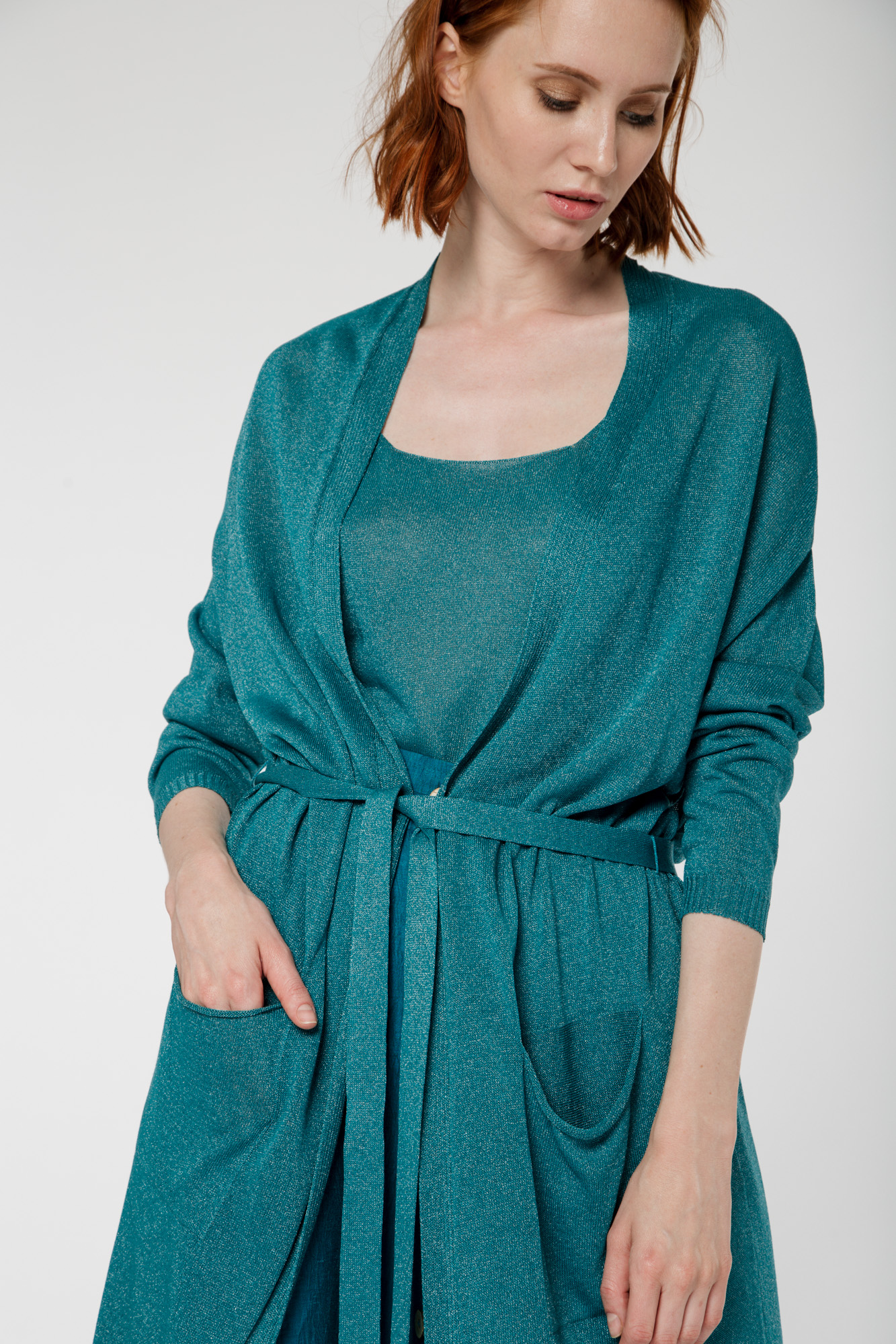 Длинный трикотажный кардиган из вискозы. Модель прямого кроя, с двумя боковыми карманами, шлевками на талии и поясом.