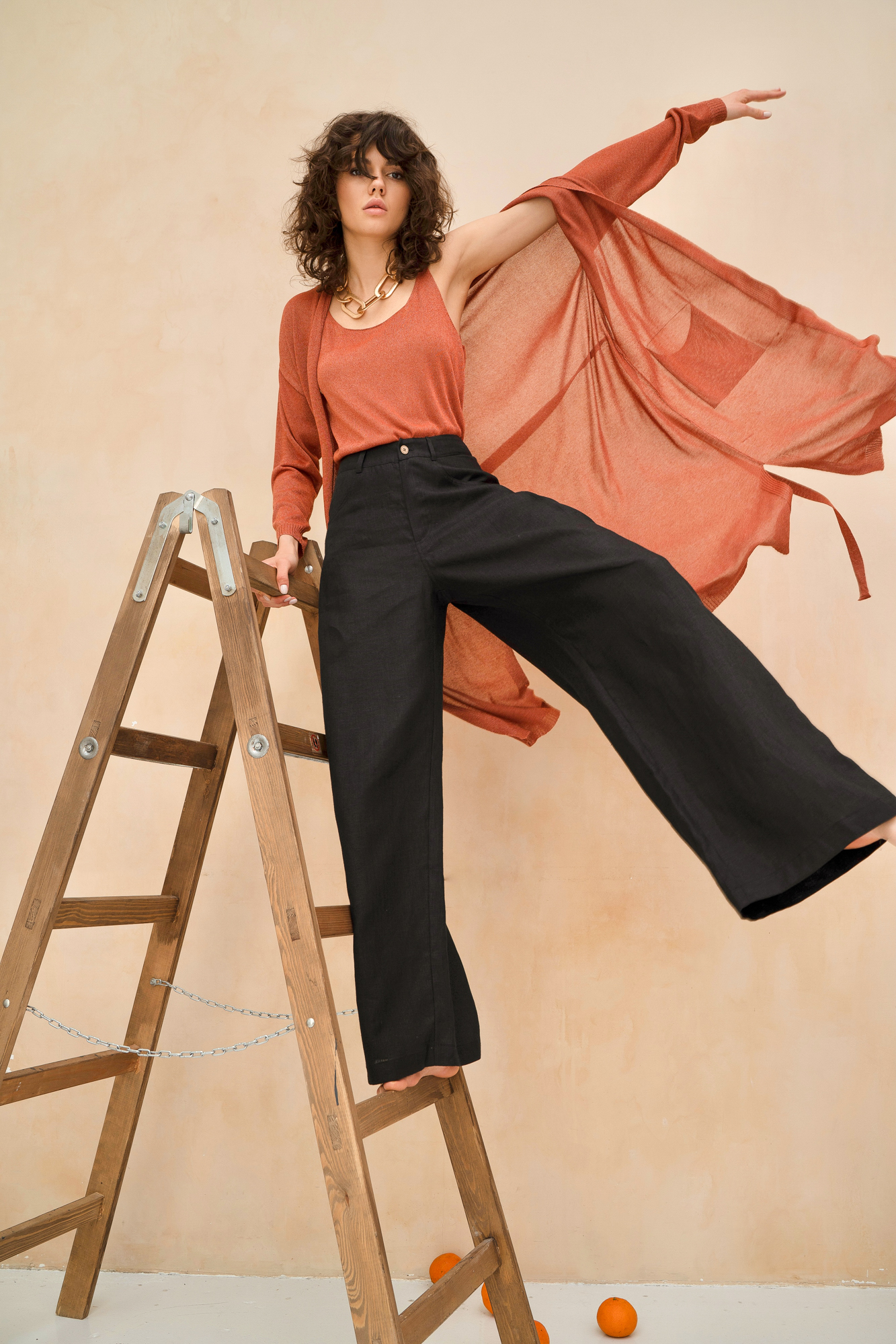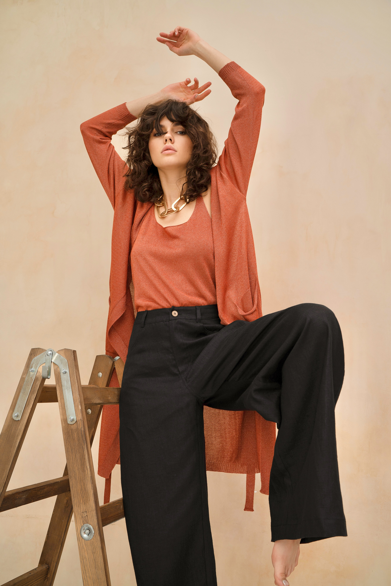 Длинный трикотажный кардиган из вискозы. Модель прямого кроя, с двумя боковыми карманами, шлевками на талии и поясом.