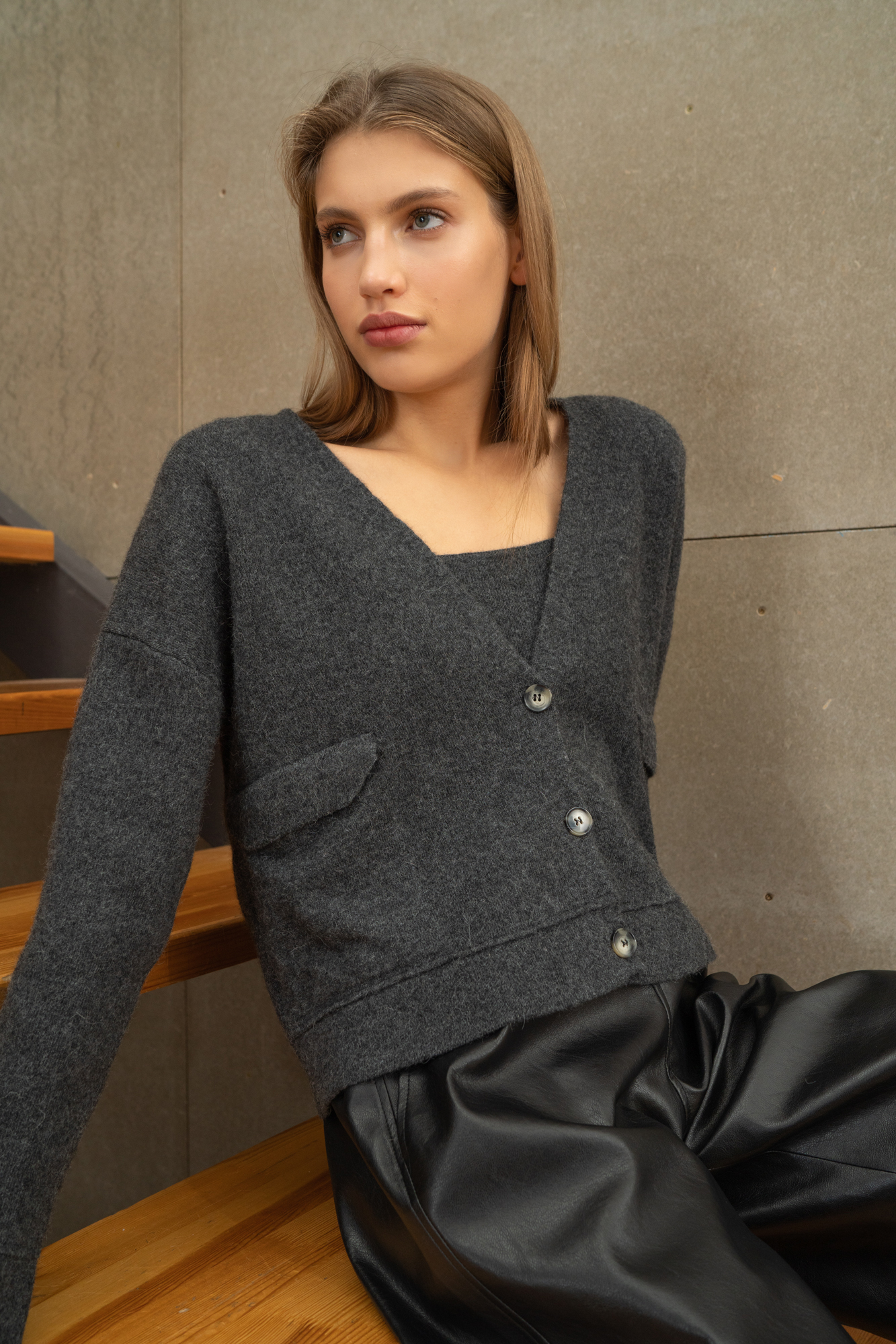 Трикотажный кардиган из шерсти альпака. Модель прямого кроя, с длинными рукавами и накладными карманами, застежка на пуговицы. В комплекте кроп-топ на тонких бретелях.