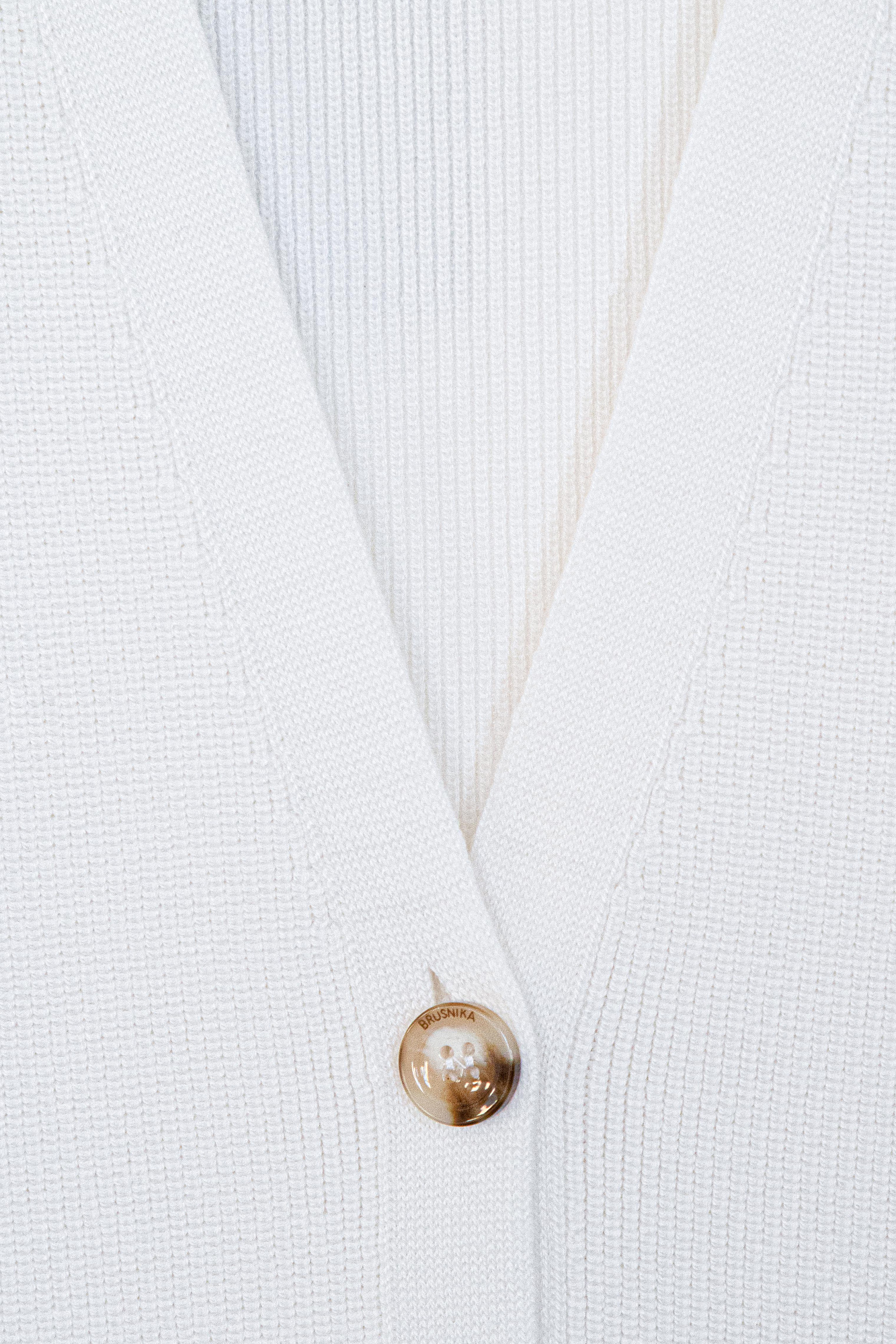 Трикотажный кардиган из хлопка с добавлением вискозы. Модель свободного силуэта, со спущенной линией плеч, V-образным вырезом и накладными караманами. Застежка на пуговицы.