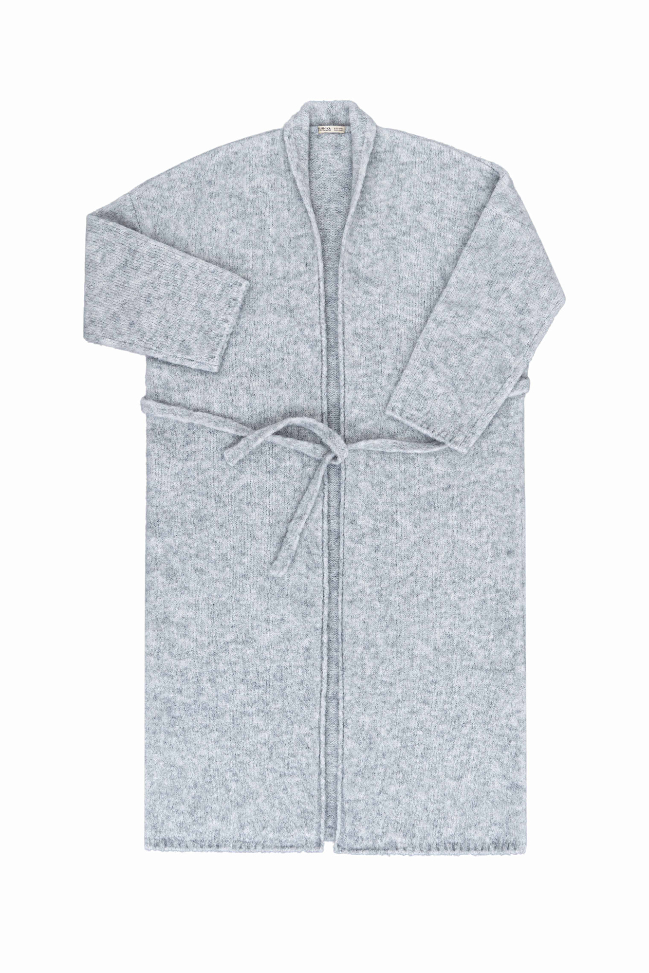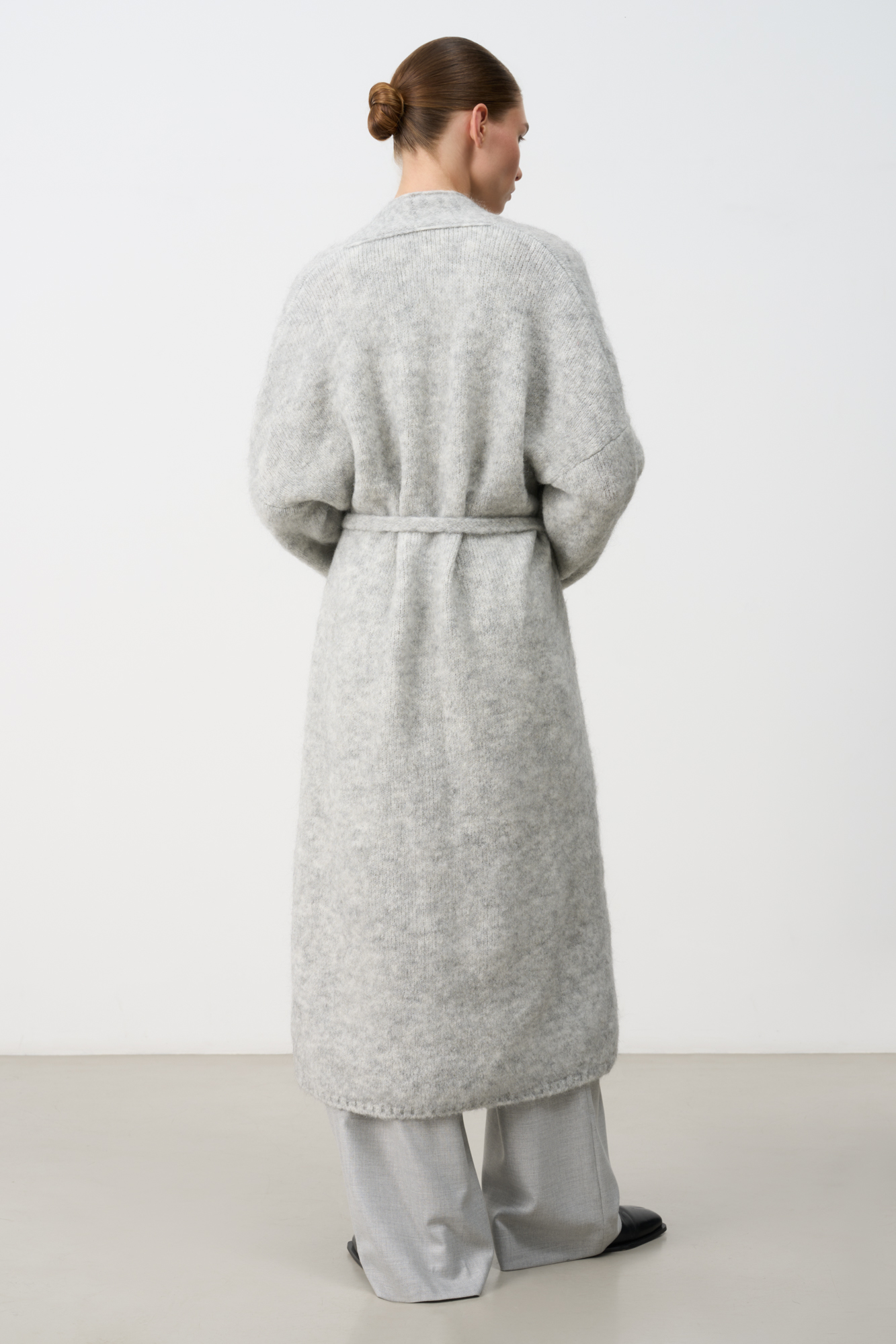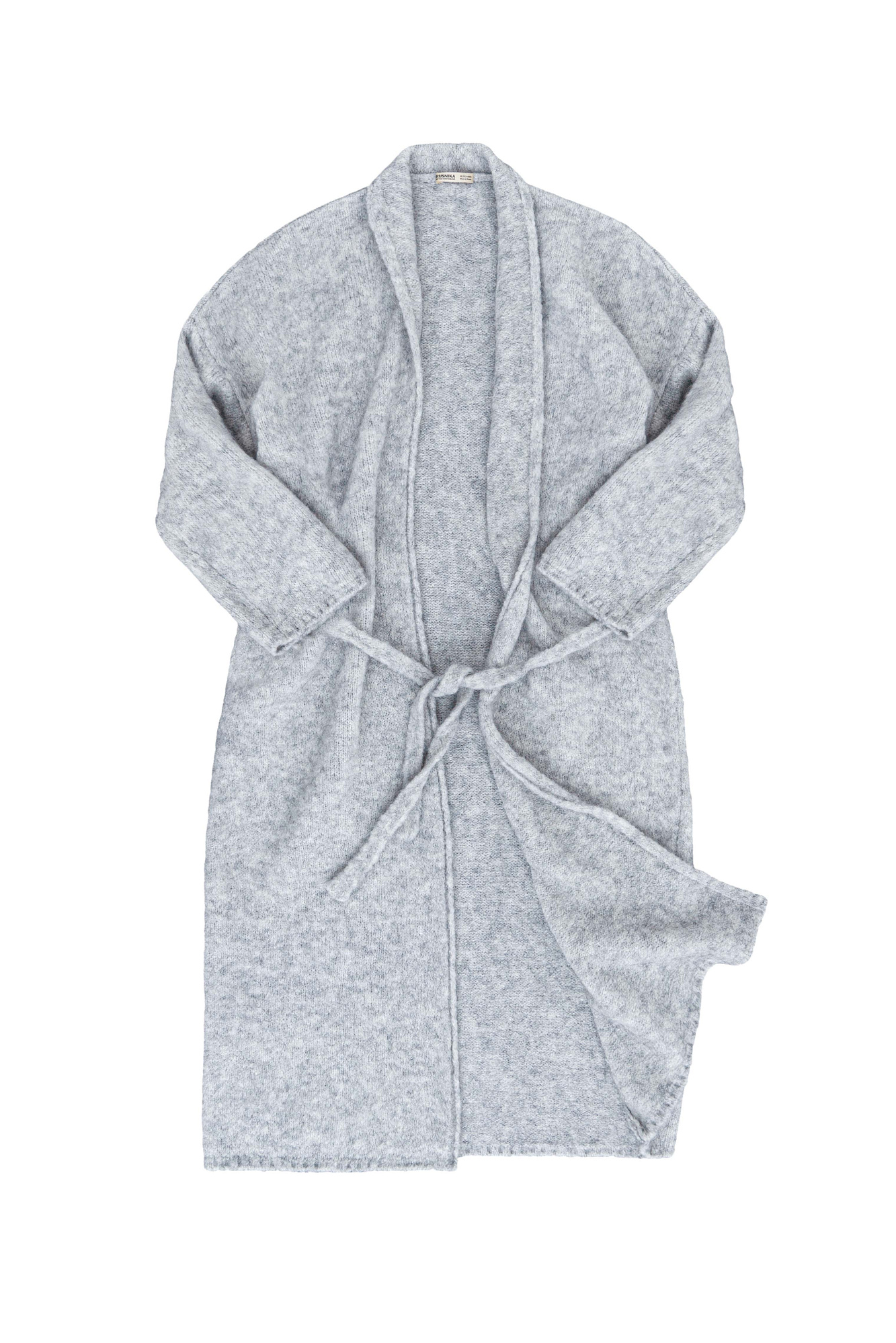 Длинный трикотажный кардиган из шерсти с добавлением мохера. Модель прямого кроя, с длинными свободными рукавами, воротником стойкой, шлевками на талии и поясом.
