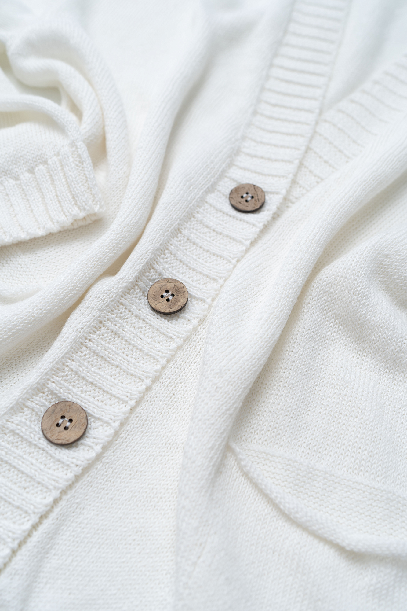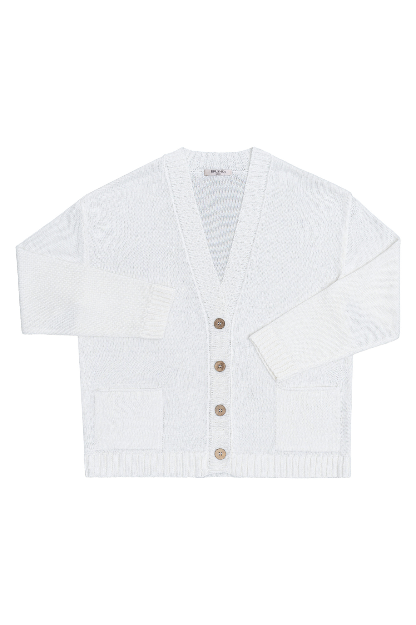 Трикотажный кардиган из 100% льна. Модель свободного кроя со спущенной линией плеча, длинным рукавом, накладными карманами и V-образным вырезом горловины. Края изделия выполнены в рубчик. Застежка на пуговицы.