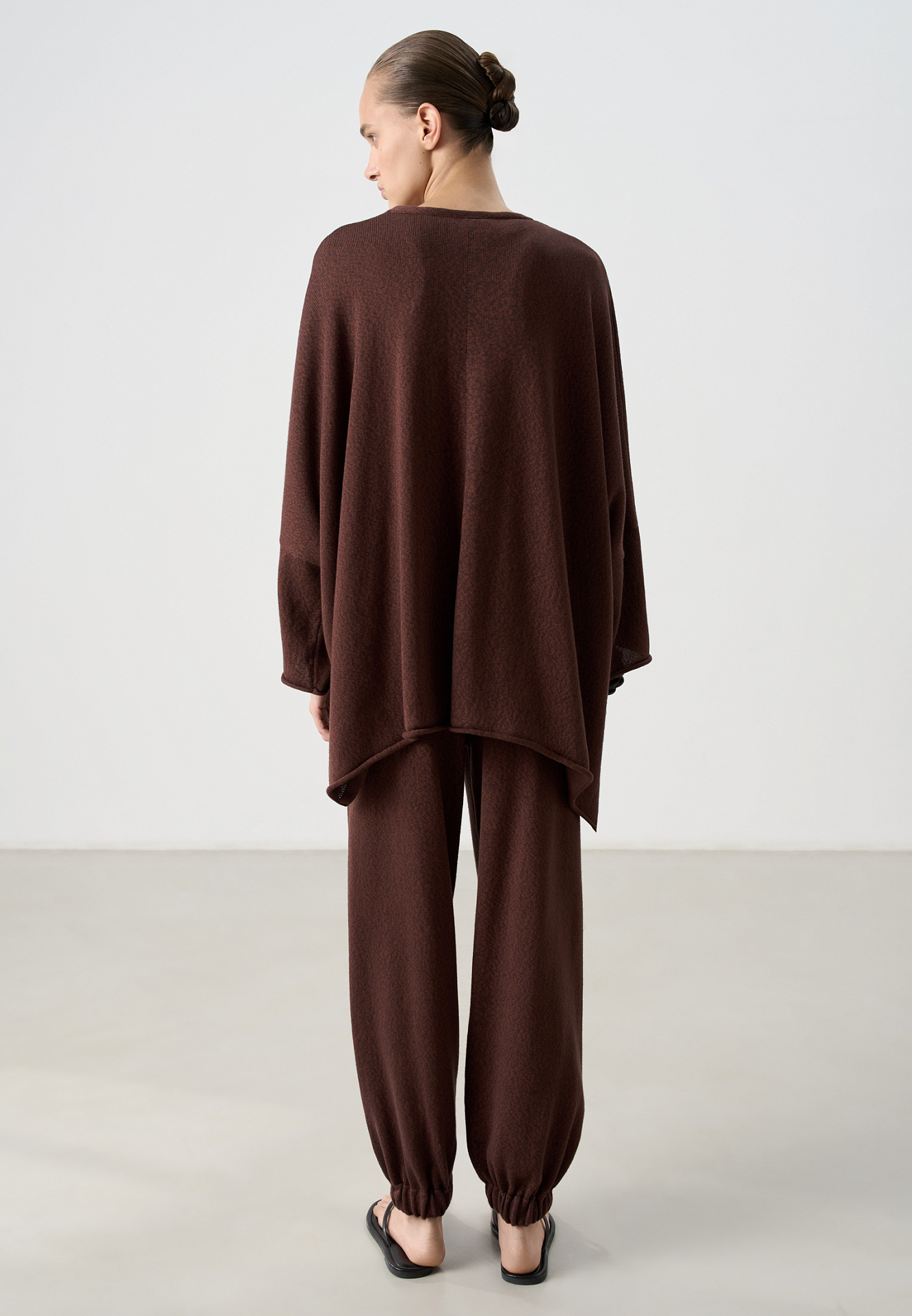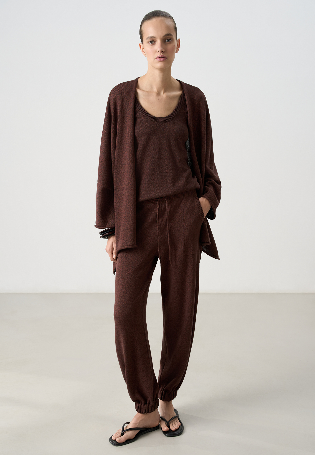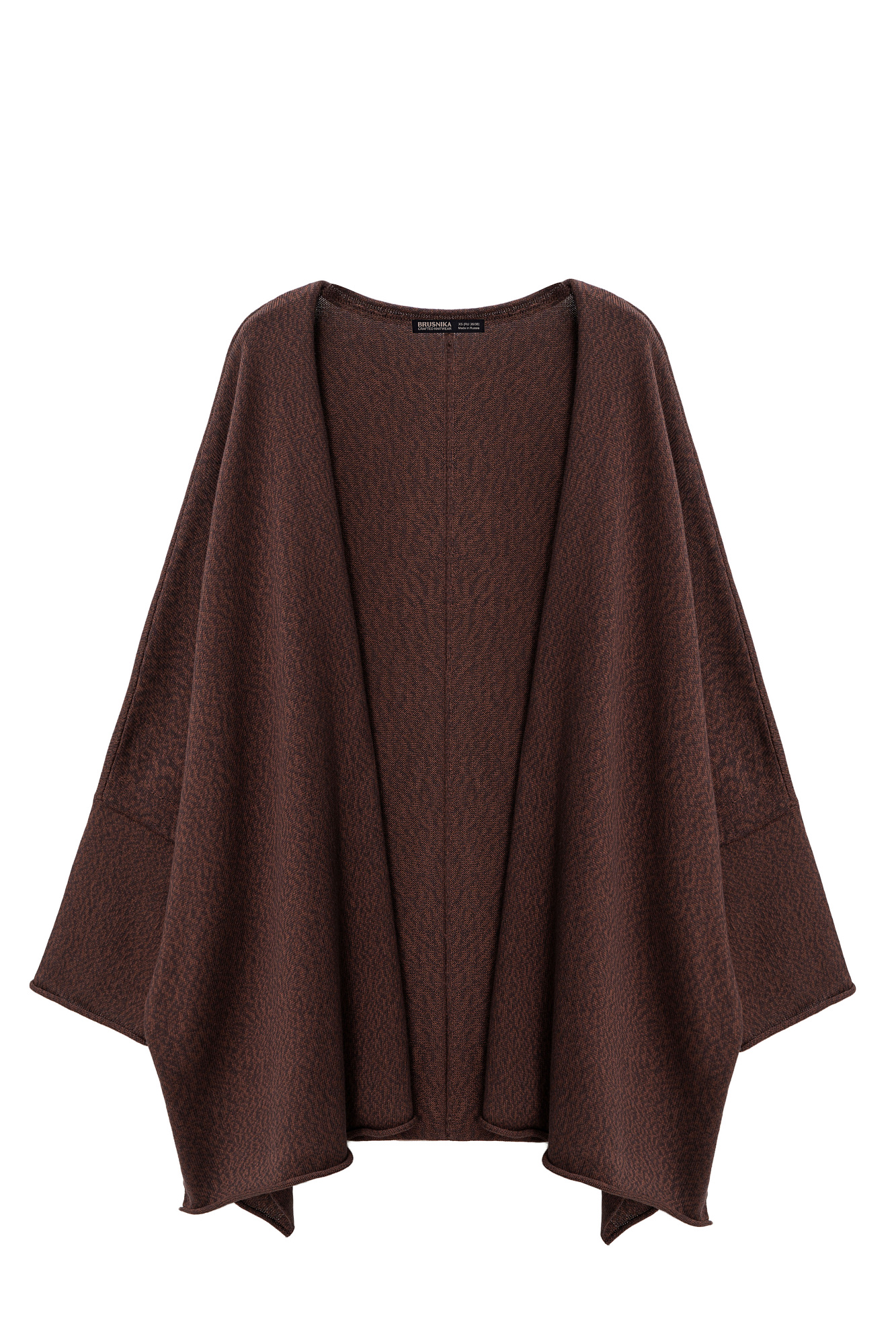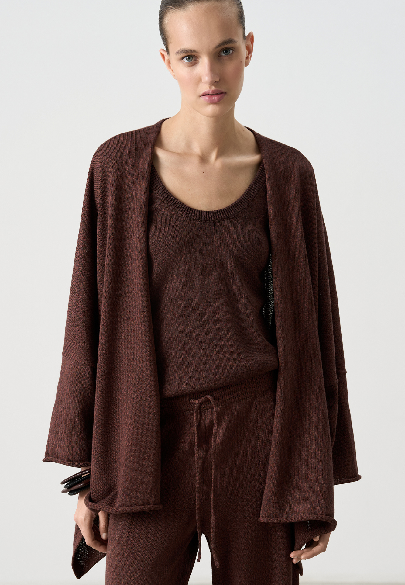 Трикотажный кардиган, выполненный в стиле кимоно, из хлопка с добавлением вискозы. Модель свободного кроя, с длинными широкими рукавами, спущенной линией плеч и боковыми разрезами. Без застежки.