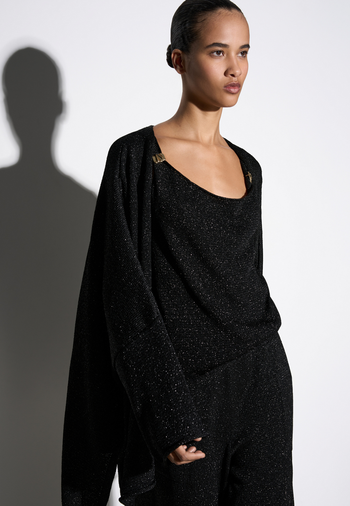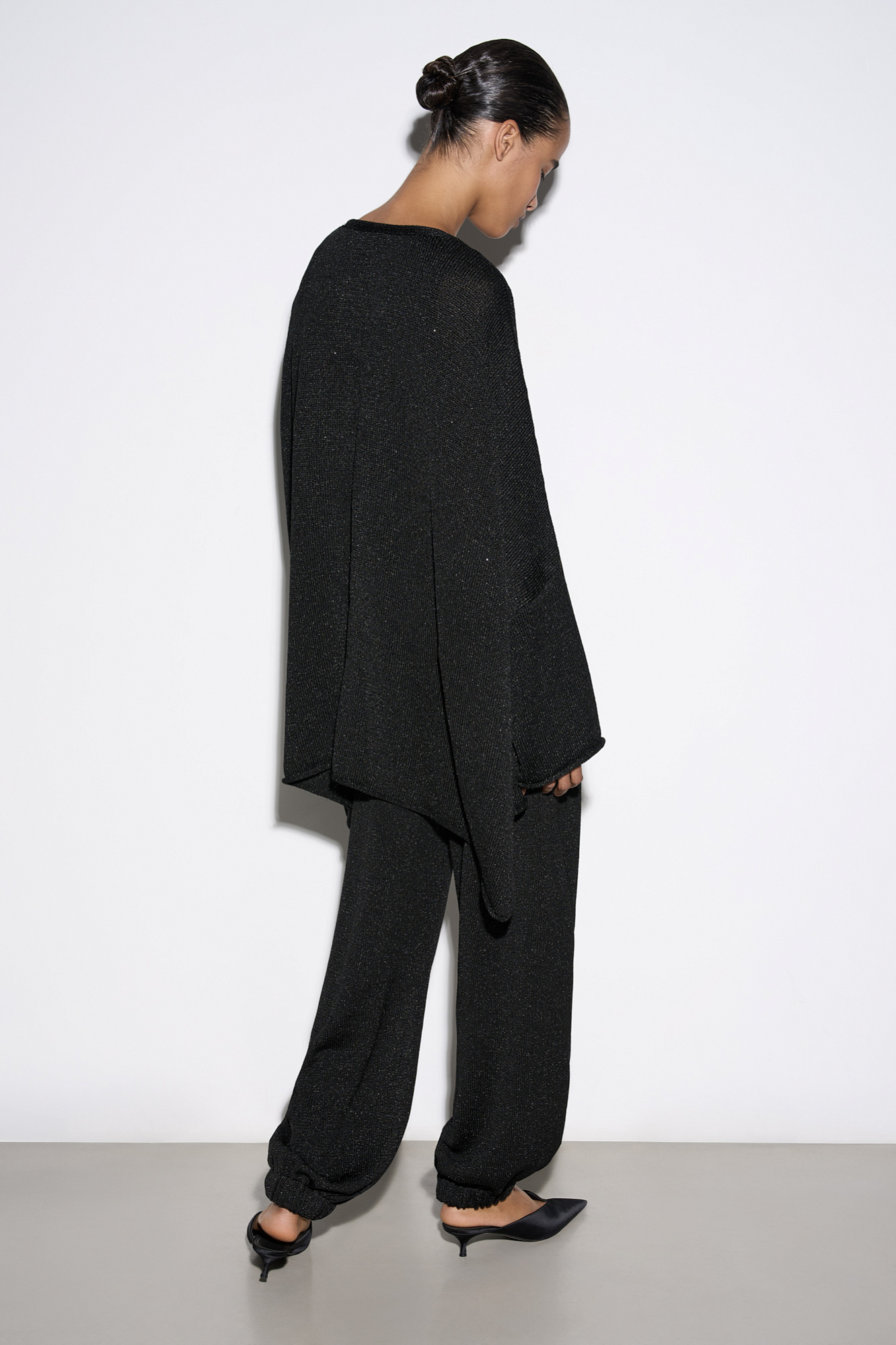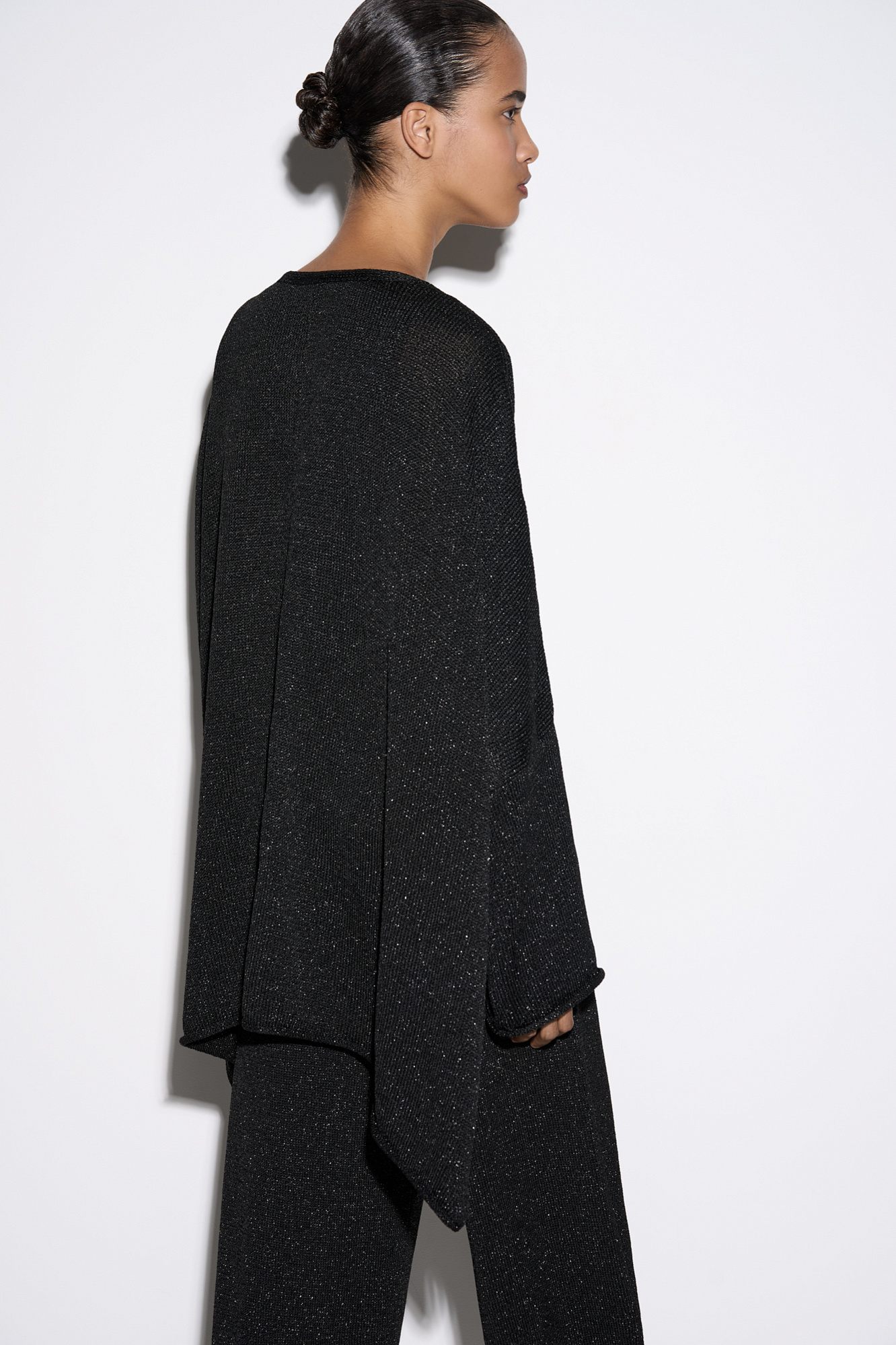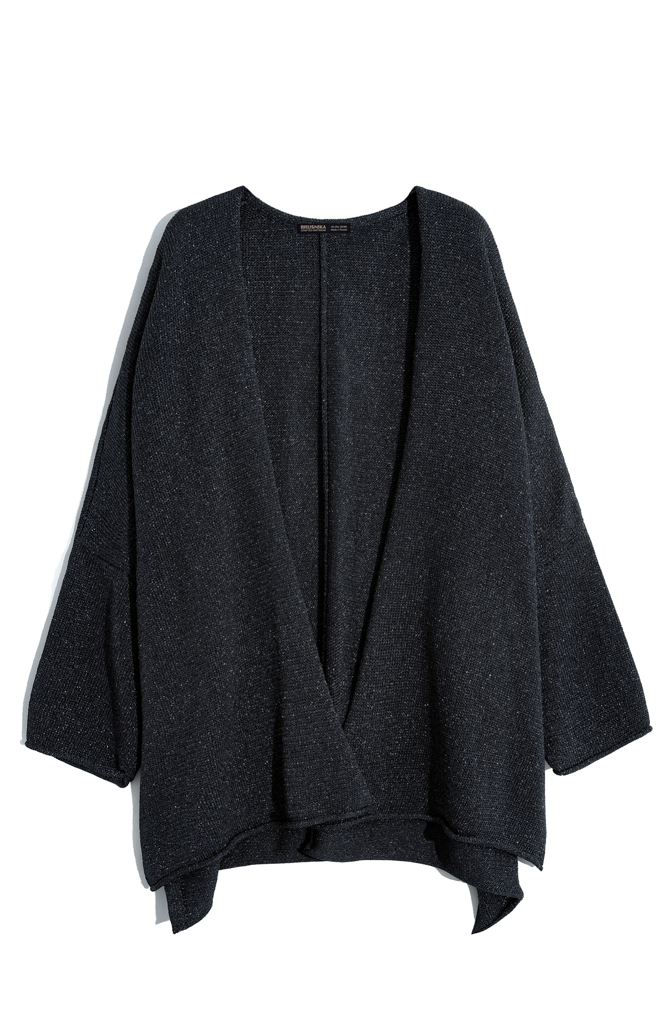 Трикотажный кардиган с люрексом. Модель свободного кроя, с длинными широкими рукавами и спущенной линией плеч. Без застежки.