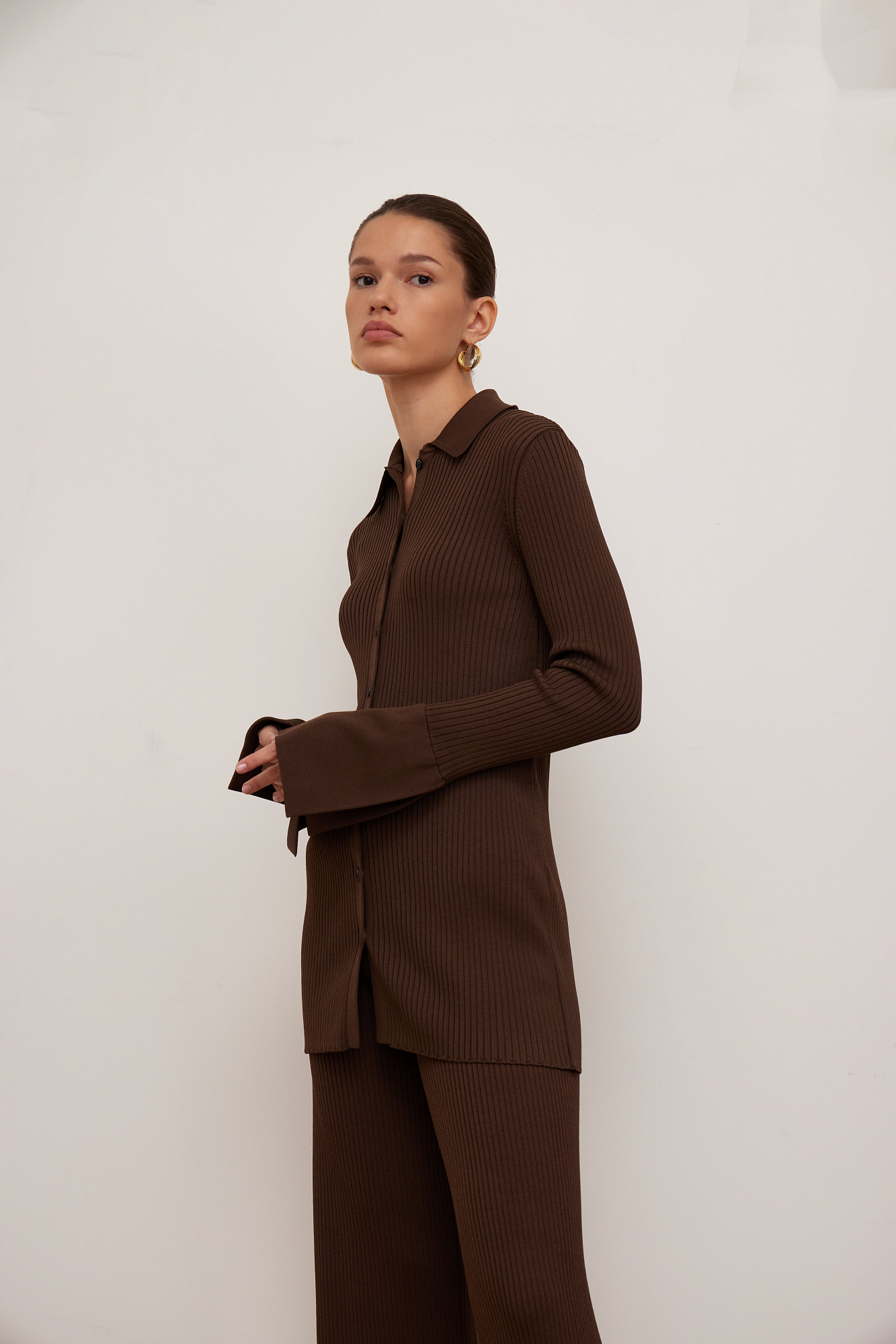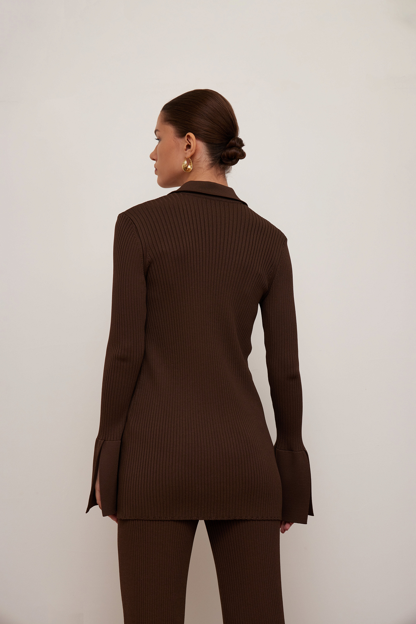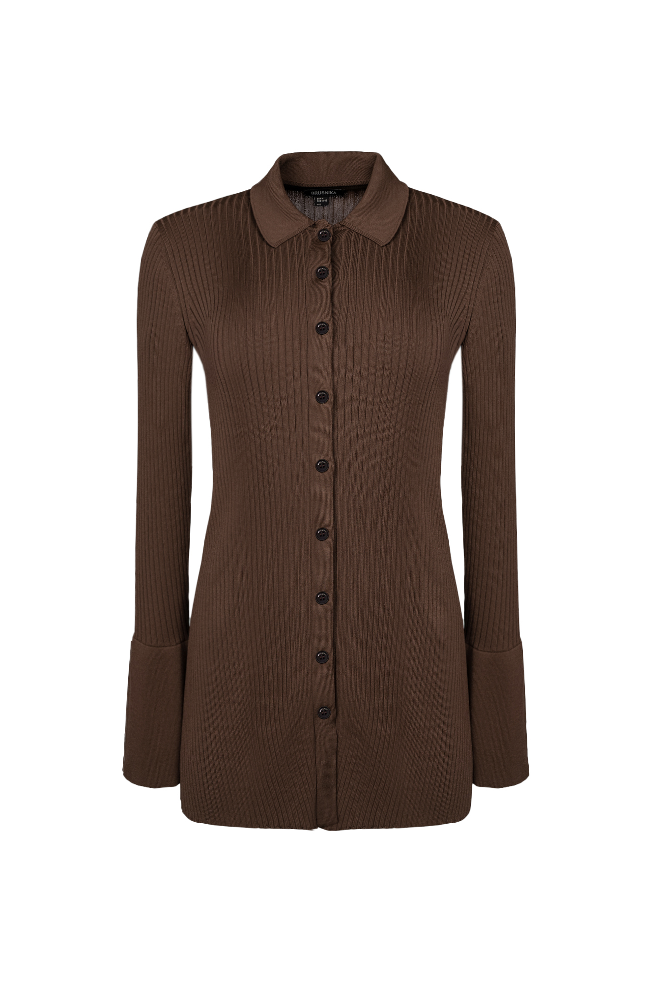 Трикотажный кардиган-рубашка из вискозы. Модель приталенного силуэта, с длинными рукавами, расклешенными манжетами с разрезами, классическим отложным воротником и застежкой на пуговицы.